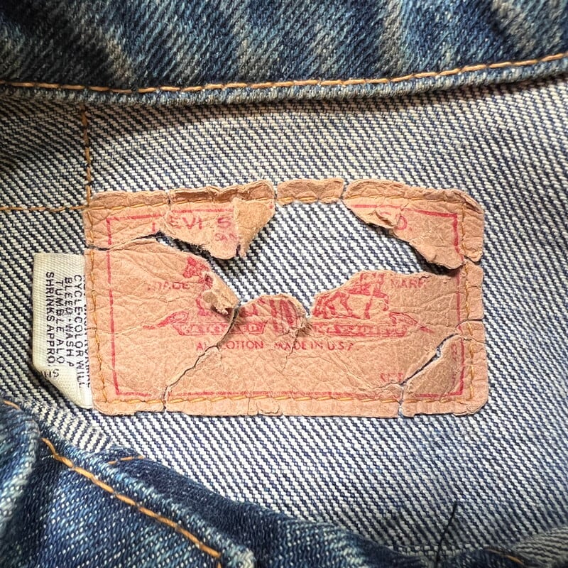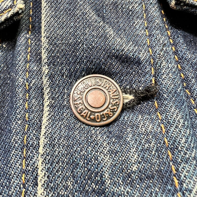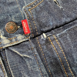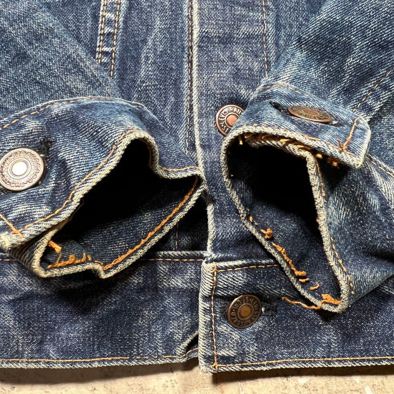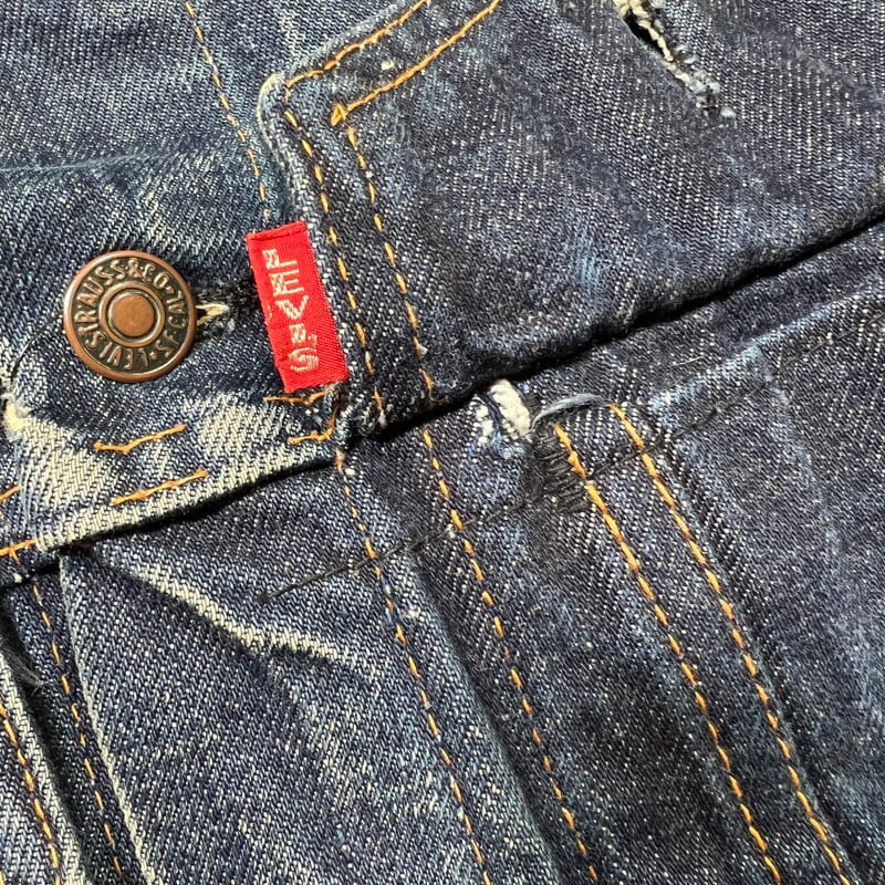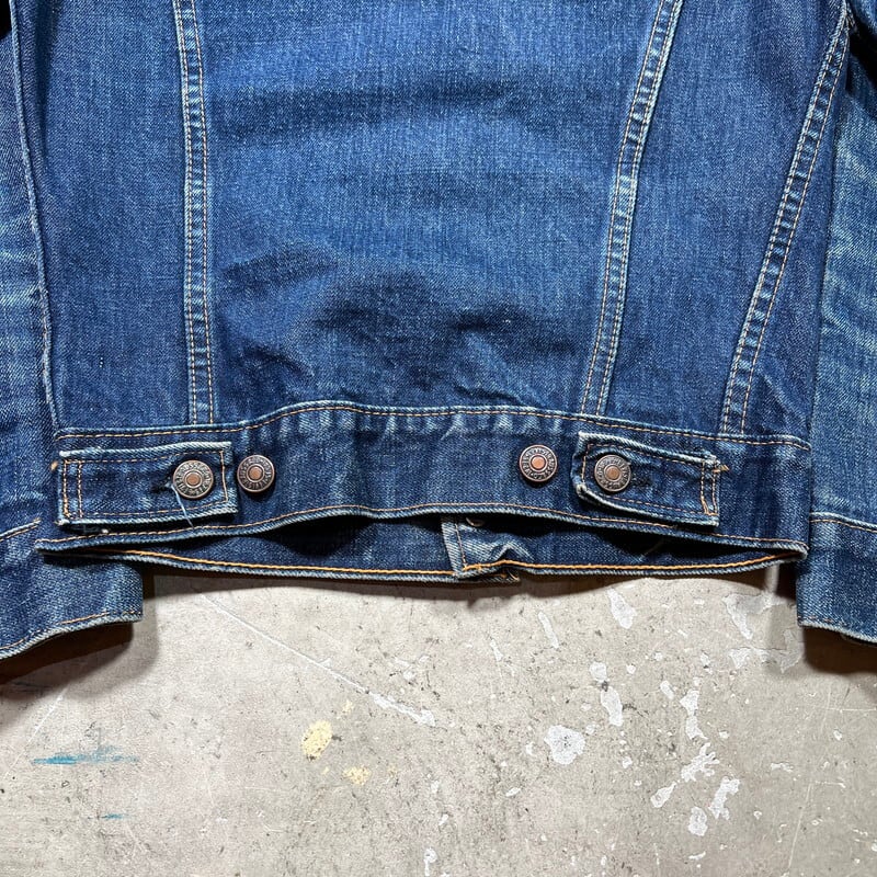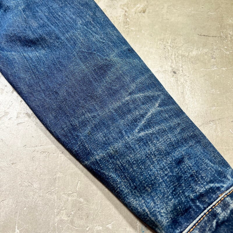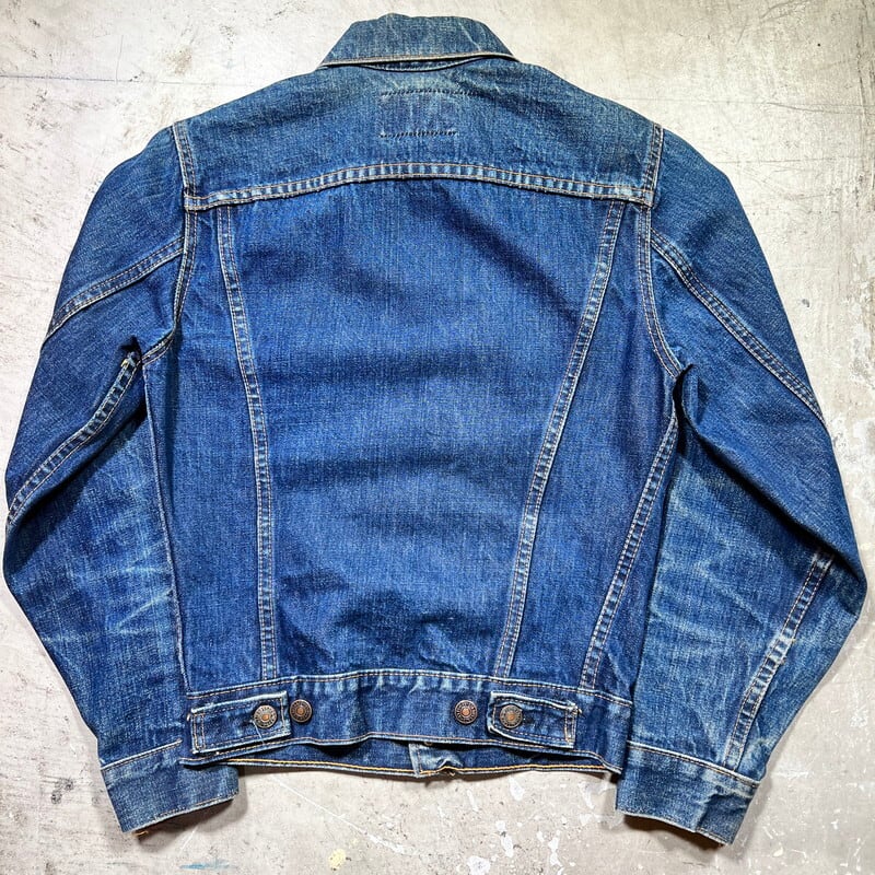 60年代から70年代頃のLEVI'S 70505デニムジャケットです。小紙パッチ、ボタン裏526刻印、不均等V、Big E、ポケット裏シングル、閂ブラック。所謂4thと呼ばれるモデルで、リーバイスのデニムジャケットの集大成といえる完成されたデザインが人気の1着です。557の3rdに比べ着丈も長いのでファッション性も高く様々なスタイリングに使える優れものです。色残りは7割ほどで濃さの残る1着です。袖先のステッチが一部切れていますが、ハチノスが入る雰囲気の良い個体です。。パッチが割れ印字が消えていますが、サイズは32位の希少な小さいサイズです。細身な女性向けのサイズですので、男性だと小柄で管理細い方でないと厳しいかもしれません。ヴィンテージデニムの人気で価格も高騰している70505ですので、サイズが合う方にはお勧めしたアイテムです。色残り等のコンディションも良いと思いますので、小さいサイズをお探しだった方は是非この機会にいかがでしょうか。