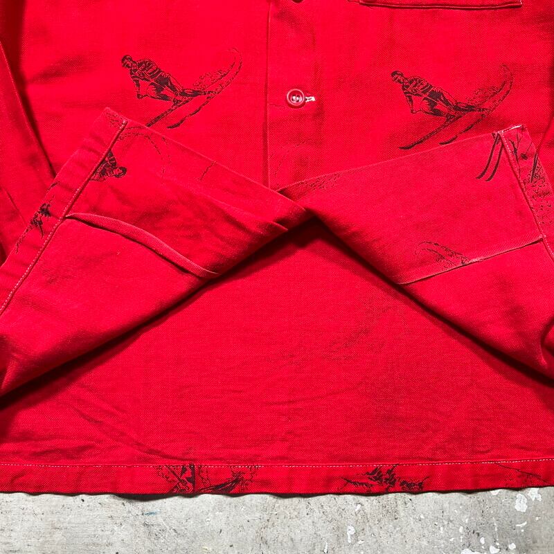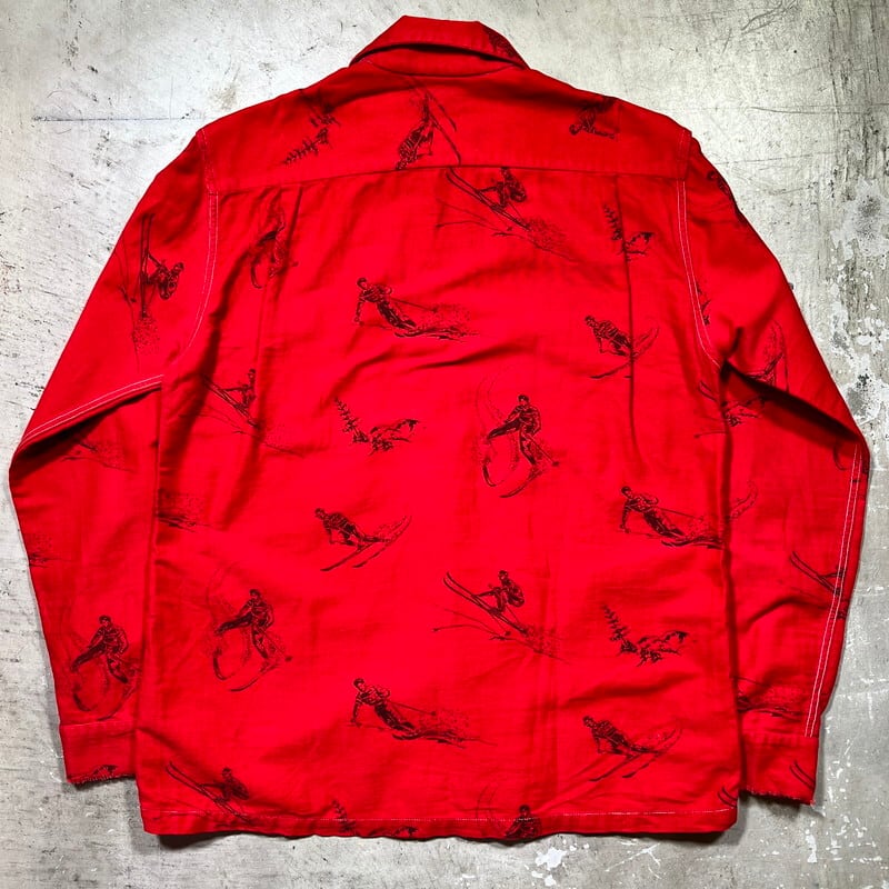 40's McGREGOR マクレガー プリントシャツ スキーヤー柄 コットン 赤 レアプリント ロングポイント S 筆記体タグ 希少 ヴィンテージ BA-2031 RM2450H