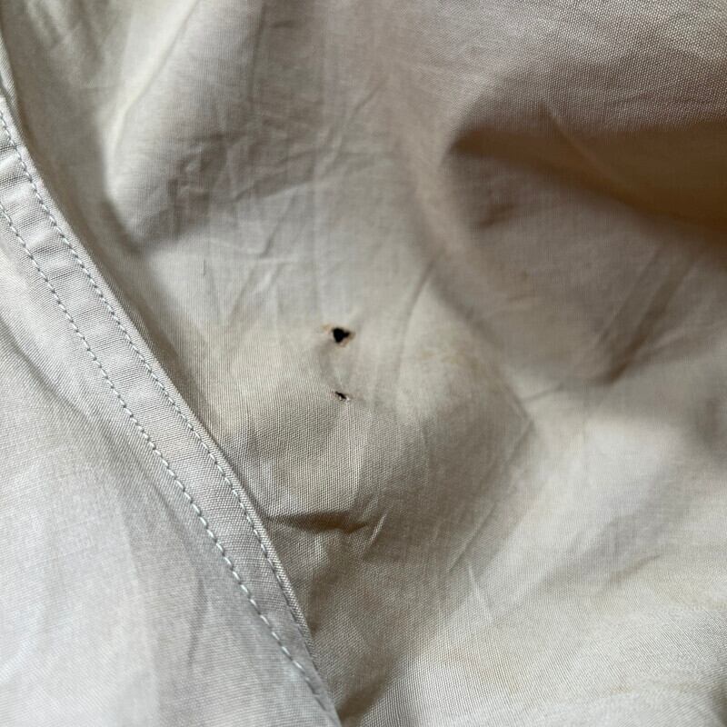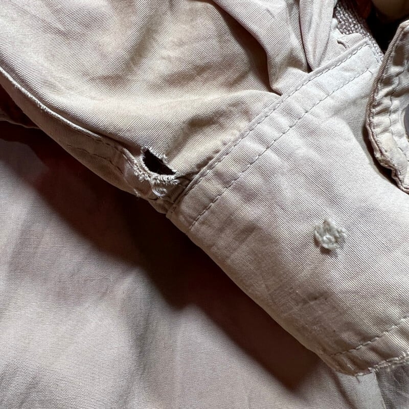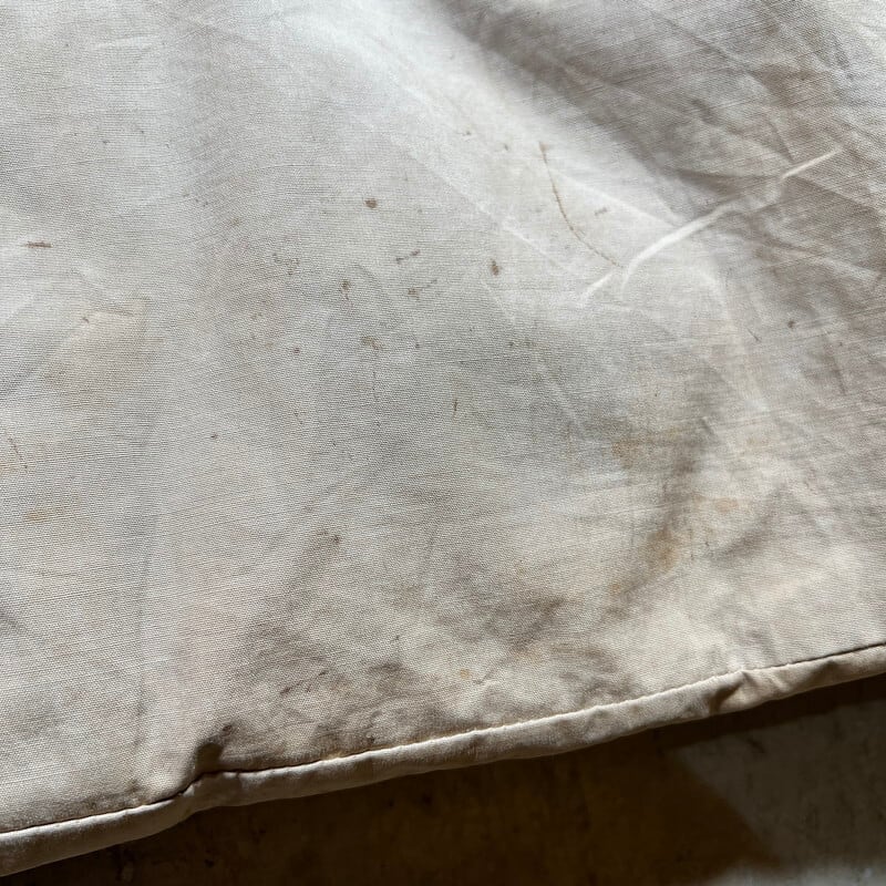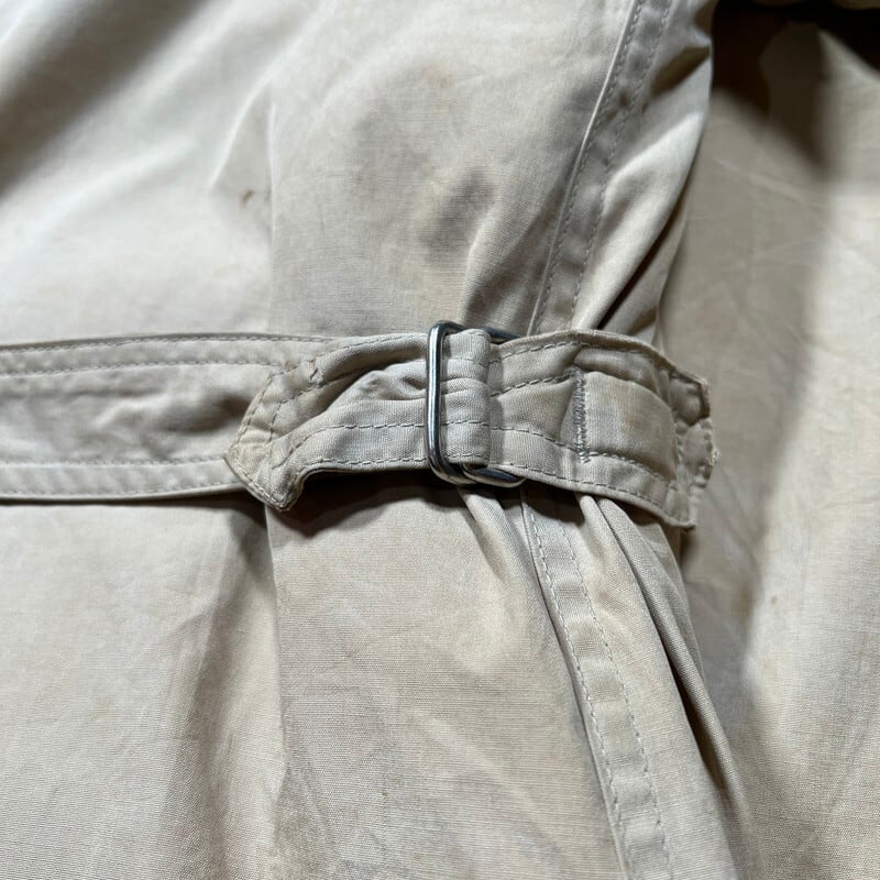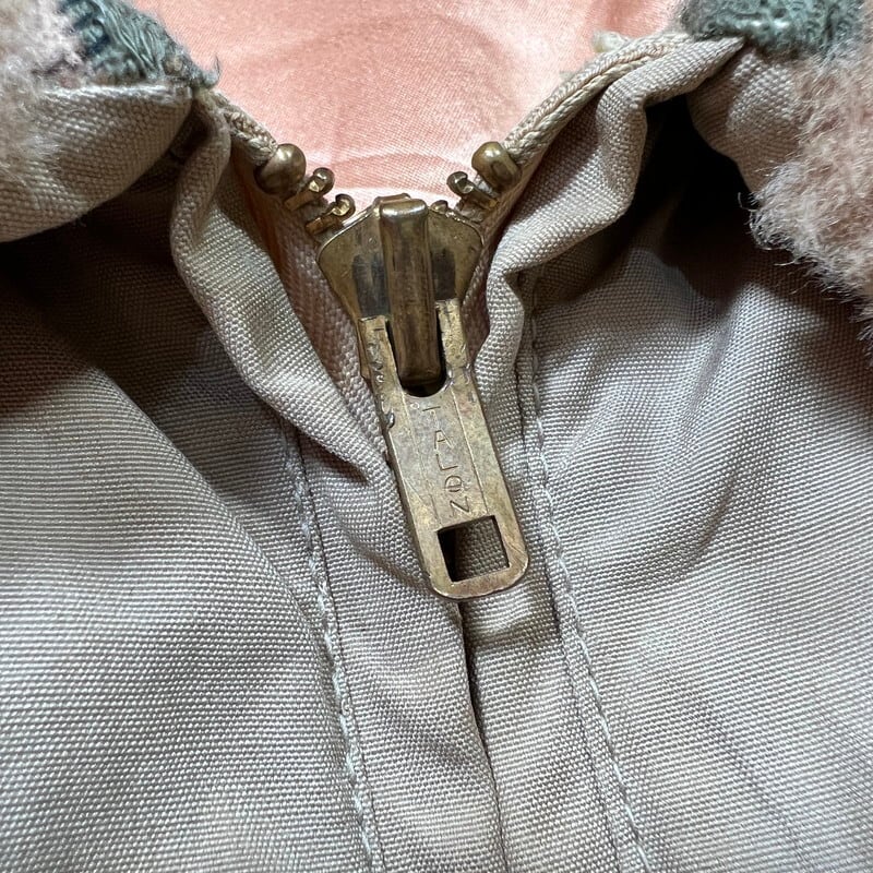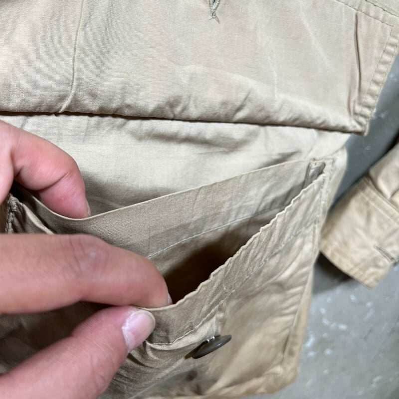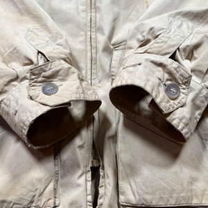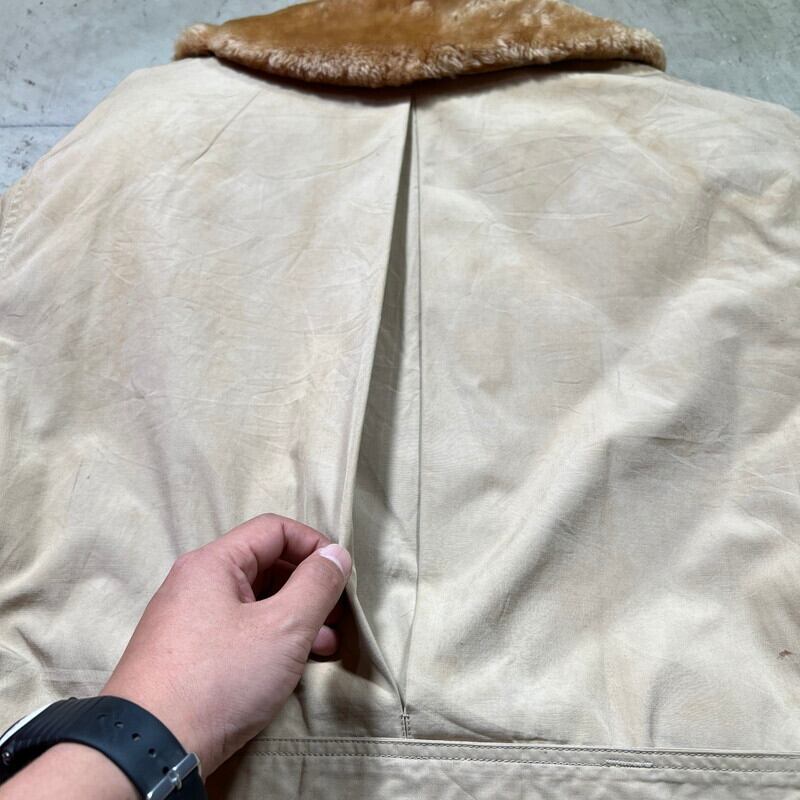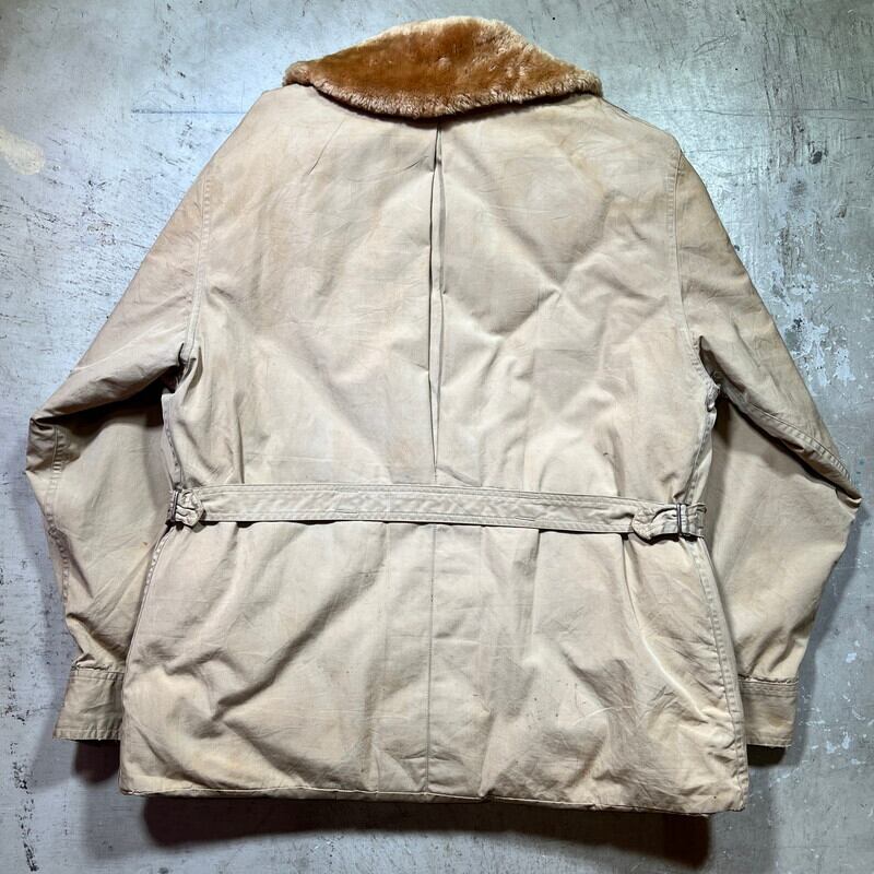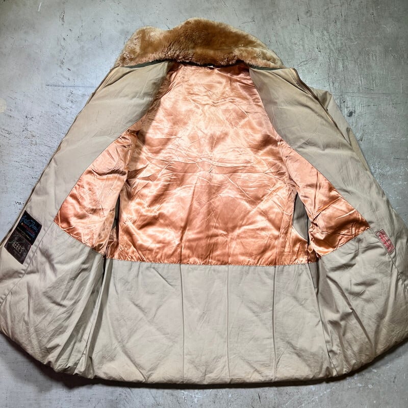 40年代から50年代頃の、Arctic Feather&Down Coのムートンカラーダウンジャケットです。ブランド詳細は不明ですが、1936年頃にEddie Bauerが設立したといった内容の話もあるようなので、子会社的な立ち位置のブランドだったのかもしれません。ご紹介するこちらは、1930年代半ばにビバリーヒルズで創業したハンティングやフィッシングのスポーツ用品等を取り扱うKERR'Sで別注されたと思われるジャケットで、袖意外のボディにダウンが入っています。襟にはリアルムートンが使用されています。胸ポケットとフロントはTALONが使用されています。フラップポケット内部はどちらも2層になっており、サイドにはスラッシュポケットもございます。ウエストにはバックルが付属しているので、調整が可能です。背面にはセンタープリーツが入るクラシックなディティールもポイントが高いのでは無いでしょうか。表面にはシミや小穴、袖先に擦れによるダメージ等ございますが、内側のサテン等は非常に綺麗です。袖のボタンが1つづつ欠損しています。KERR'Sは当時のハリウッドスターなどの著名人が足しげく通うハイエンドな商品を取り扱うショップだったので、高級な1着だったのかもしれません。シミなどは見られますが、雰囲気の良いアイテムですので、古いアウトドアウェアがお好きな方は是非この機会にいかでしょうか。46表記ですが、少しゆとりのあるL相当ですので、良いサイズ感だと思います。