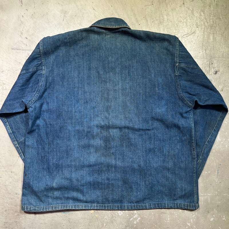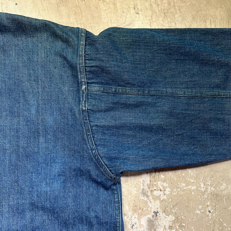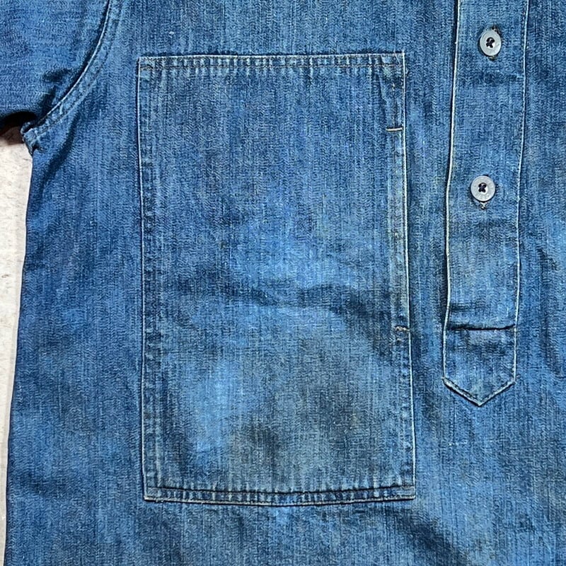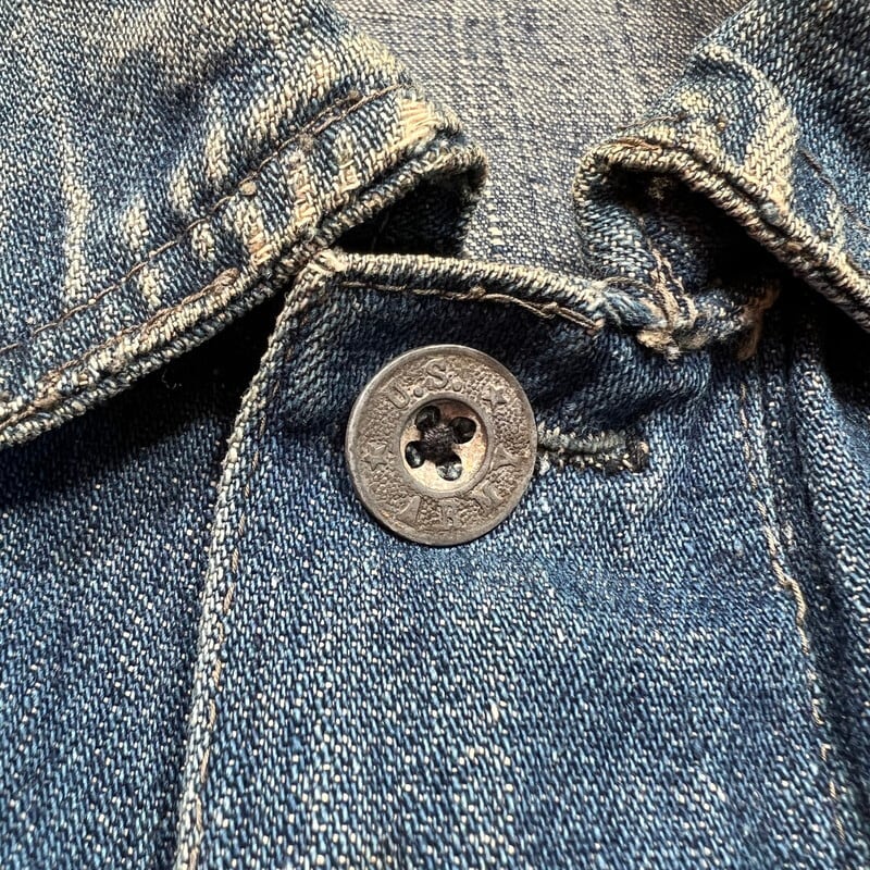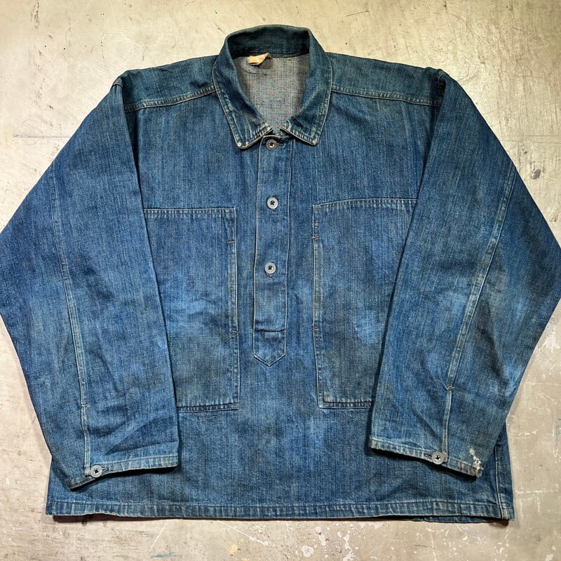 1920年代~1930年代初頭頃のU.S.ARMY デニムプルオーバージャケットです。古いミリタリーの中でも人気の高いアイテムです。今回ご紹介させていただくこちらのアイテムは、一般的に市場で目にするM-35やM-40と呼ばれるデニムプルオーバーよりもう1段階古い個体となります。1919年頃からデニム生地が作用されるようになりましたが、ブラウン地から切り替わった頃は黒ラッカーの打ち込みボタンにブラックステッチで縫製されていたようです。こちらは、ステッチはグレー(恐らくブラックが褪色)で縫製され、ボタンは打ち込み直後の縫い付けメタルボタンに変更となったモデルです。第二次世界大戦以前の仕様ですので非常に希少な1着です。オリジナルのデニムプルオーバージャケット自体市場でも枯渇傾向にあると思いますが、こちらのグレーステッチの個体は見かける機会が少ないのではないでしょうか。色抜けや汚れ等ございますが、色残りもまだ充分あると思います。両袖先のボタンが各1個づつ欠損しています。フロントのボタンは全て縫い直しされています。左袖に小さなダメージと、左脇のステッチが解けています(破れでは無いので、縫い直しだけで済みます)。左袖中腹のステッチが一部飛んでいるので、リペアされる際は補強で縫い直してもらっても良いかもしれません。右脇のステッチに一部ハンドリペア有ります。首元と右ポケット内側のタグは印字が消えていますが残っております。背面に横1直線に糸抜けの様に線が入っていますが、着用に問題はございません。サイズはL相当で、着丈は短めなのでかなり着やすいサイズ感だと思います。後期のホワイトステッチのモデルに比べると格段に球数が少ないので、今後の入荷はまず見込めないのかなと思います。生地もまだしっかりとしていますので、着用はもちろんですが、コレクションとしての所有も非常に価値のあるスペシャルピースです。※余談ですが、ムック本のLightningのMILITARY JACKET改訂版にこちらと同モデルが序盤に掲載されていますので、是非チェックしてみてください。