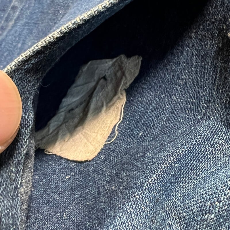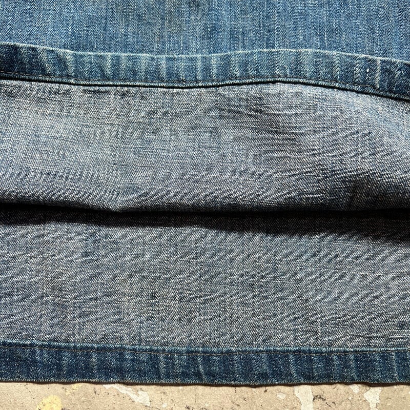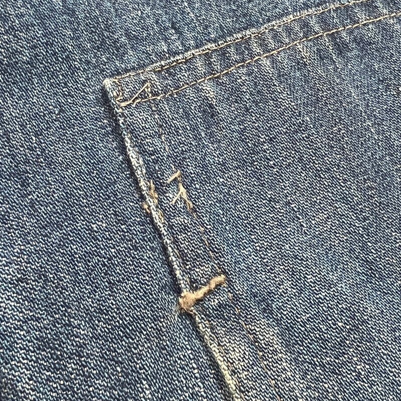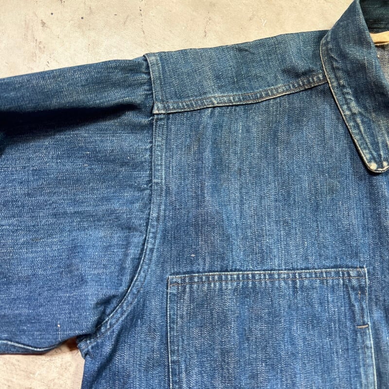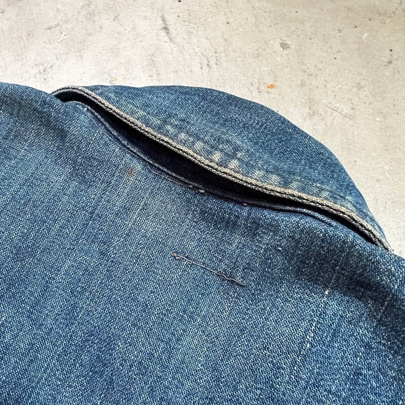 1920年代~1930年代初頭頃のU.S.ARMY デニムプルオーバージャケットです。古いミリタリーの中でも人気の高いアイテムです。今回ご紹介させていただくこちらのアイテムは、一般的に市場で目にするM-35やM-40と呼ばれるデニムプルオーバーよりもう1段階古い個体となります。1919年頃からデニム生地が作用されるようになりましたが、ブラウン地から切り替わった頃は黒ラッカーの打ち込みボタンにブラックステッチで縫製されていたようです。こちらは、ステッチはグレー(恐らくブラックが褪色)で縫製され、ボタンは打ち込み直後の縫い付けメタルボタンに変更となったモデルです。第二次世界大戦以前の仕様ですので非常に希少な1着です。オリジナルのデニムプルオーバージャケット自体市場でも枯渇傾向にあると思いますが、こちらのグレーステッチの個体は見かける機会が少ないのではないでしょうか。色抜けや汚れ等ございますが、色残りもまだ充分あると思います。両袖先のボタンが各1個づつ欠損しています。フロントのボタンは全て縫い直しされています。左袖に小さなダメージと、左脇のステッチが解けています(破れでは無いので、縫い直しだけで済みます)。左袖中腹のステッチが一部飛んでいるので、リペアされる際は補強で縫い直してもらっても良いかもしれません。右脇のステッチに一部ハンドリペア有ります。首元と右ポケット内側のタグは印字が消えていますが残っております。背面に横1直線に糸抜けの様に線が入っていますが、着用に問題はございません。サイズはL相当で、着丈は短めなのでかなり着やすいサイズ感だと思います。後期のホワイトステッチのモデルに比べると格段に球数が少ないので、今後の入荷はまず見込めないのかなと思います。生地もまだしっかりとしていますので、着用はもちろんですが、コレクションとしての所有も非常に価値のあるスペシャルピースです。※余談ですが、ムック本のLightningのMILITARY JACKET改訂版にこちらと同モデルが序盤に掲載されていますので、是非チェックしてみてください。