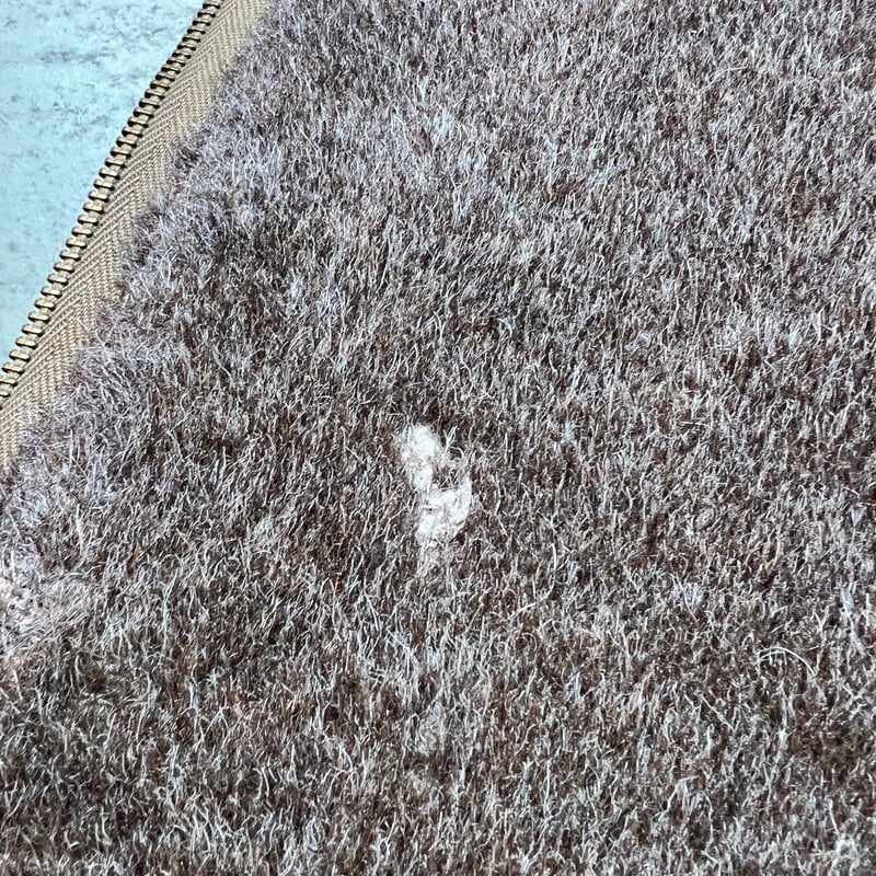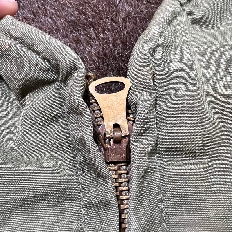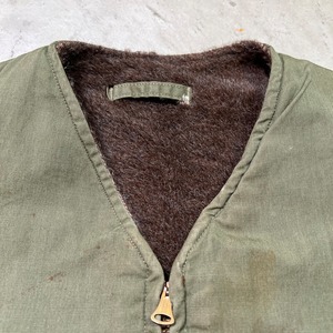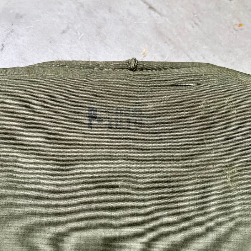 40年代頃のU.S.NAVY デッキベストです。主に米海軍で支給されていたとされるN-1デッキジャケットのベストバージョンです。シェルはシャリ感のあるコットンポプリン、ライニングはアルパカが使用されたアイテムです。フロントはCONMATICのベル型ピンロックジッパーで、コの字エンドです。色味は濃いめのオリーブグリーンで、雰囲気の良い個体です。フロントから再度にかけて錆汚れのようなものがございます。ライニングのアルパカは一部抜けやダメージがあるものの比較的残っています。左胸にうっすらとですが、DAN MANNETTERと読めなくもない文字とイナズマの様な模様が入り、背面首元にはP-1016とステンシルが入ります。元は両サイドが詰められて着用されていたようですが、綺麗に解かれて元の身幅にもどされています。ステッチ跡は残っていますが、目立つ大きなダメージは無く状態は良好です。サイズ表記はございませんが、恐らくM(38)相当かと思われます。非常にシンプルなアイテムですが、インナー、トップスと使い勝手も良いのでお勧めです。