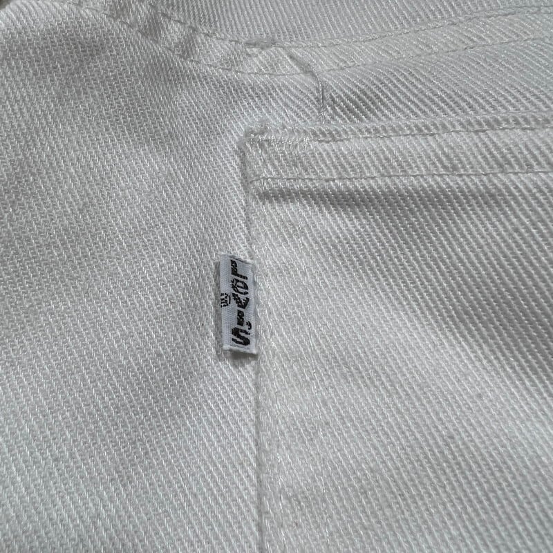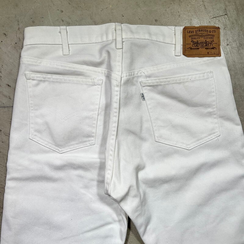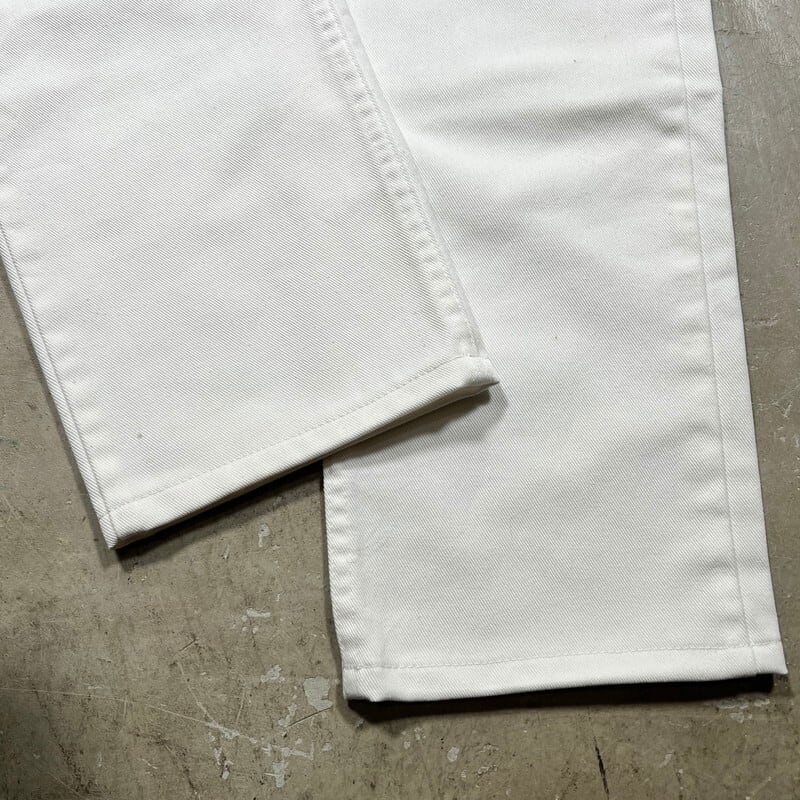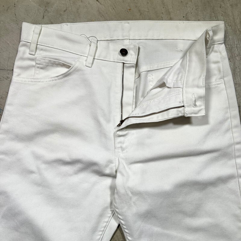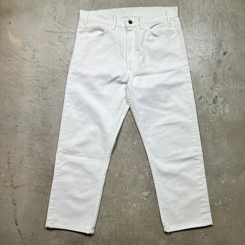 80年代頃のLevi's 505-2851ホワイトツイルパンツです。こちらのモデルはコットン50%ポリエステル50%の混紡のホワイトツイル地です。トップボタン523刻印、社名入りジッパー、スモールe白タブ。内タグの印字は擦れている為判読不可。かなり久しぶりの入荷となるこちらは所謂カツラギと呼ばれます。多少の使用感はございますが、汚れも少なくコンディションは良好な1本です。レングスが少し丈詰めされておりやや短めではありますが、現代のアイビーファッションに取り入れると使い易いのではないでしょうか。素足にローファーや、カラーソックスに短靴等をあわせても良いと思います。ホワイトのパンツをお持ちで無い方は是非この機会にいかがでしょうか、デニムシャツやミリタリーとも相性が良いので1本あると重宝するアイテムです。ウエストはW34インチとゴールデンサイズです。