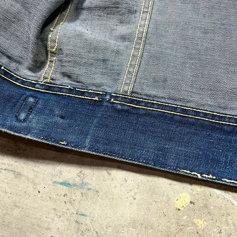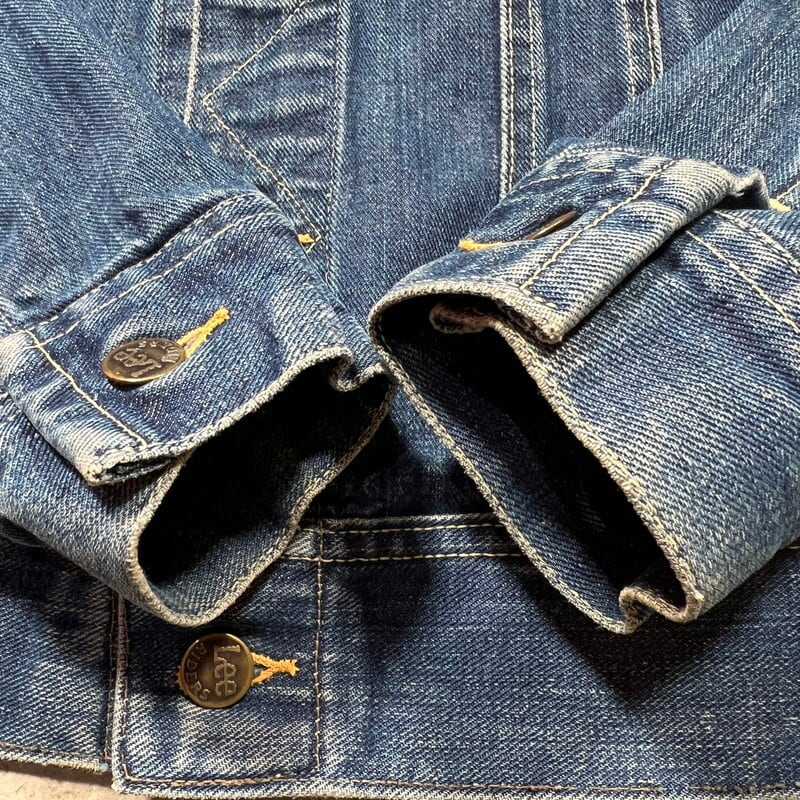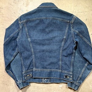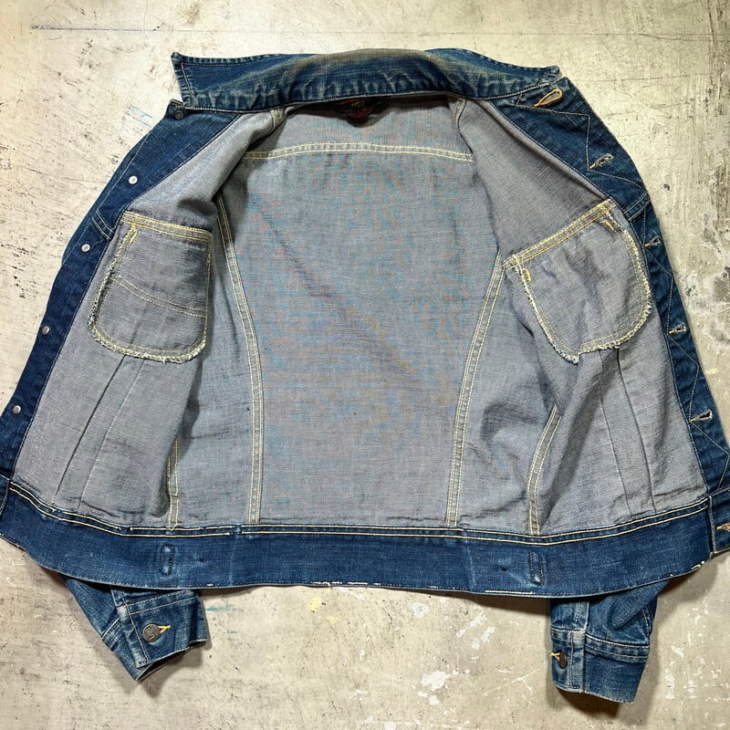 50年代頃のLee101-Jデニムジャケットです。50年代後半頃に極短い期間のみ製造された、三角赤タグの付くモデルです。首タグ、ピスネーム共に®、MR表記はございません。ボタン裏はK刻印です。色残りは5~6割で、袖にはうっすらとハチノスが入ります。襟に色落ちが見られますが、その他ダメージや汚れの少ないグッドコンディションです。サイズはなかなか見かけない34表記です。女性の方でこのサイズをお探しの方も多いのでは無いでしょうか。ヴィンテージデニムと言えばリーバイスの価格高騰が続いておりますが、ヴィンテージLeeもここ最近ではぐんと価格も高くなっております。状態の良いモデルは今後はなかなか出なくなると思いますので、サイズが合う方は是非この機会をお見逃しなく。小さいサイズですので、お手頃な価格帯での販売です。