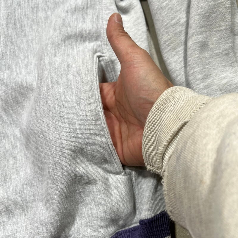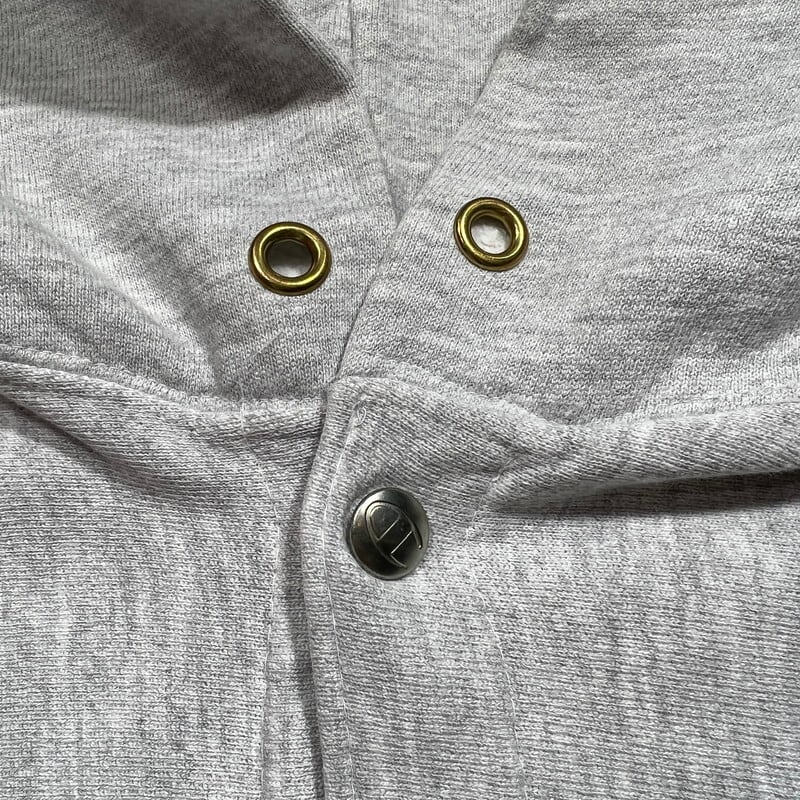 90年代のChampionリバースウィーブフルスナップパーカーです。こちらのアイテムは、リバースウィーブシリーズのフルスナップでも出にくいフードが付いたモデルです。スナップボタンにはチャンピオンの目玉が刻印されており、袖と裾はリブライン仕様です。多少使用感はございますが、目立つ汚れやダメージはございません。ハトメ周りも綺麗です。右のポケットスレーキに小穴があったので、簡易的ではありますが補修済です。サイズはMEDIUMですので男女共に着やすいサイズ感だと思います。カラーはグレー×パープルでこの組み合わせがお好きな方も多いのでは無いでしょうか。お探しだった方は是非この機会にいかがでしょうか。