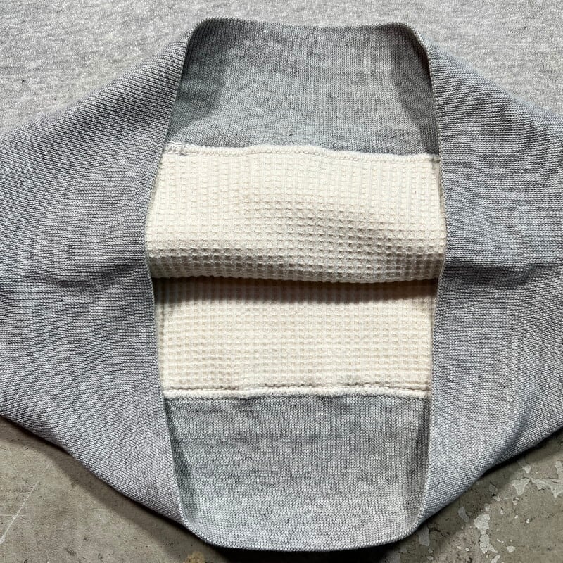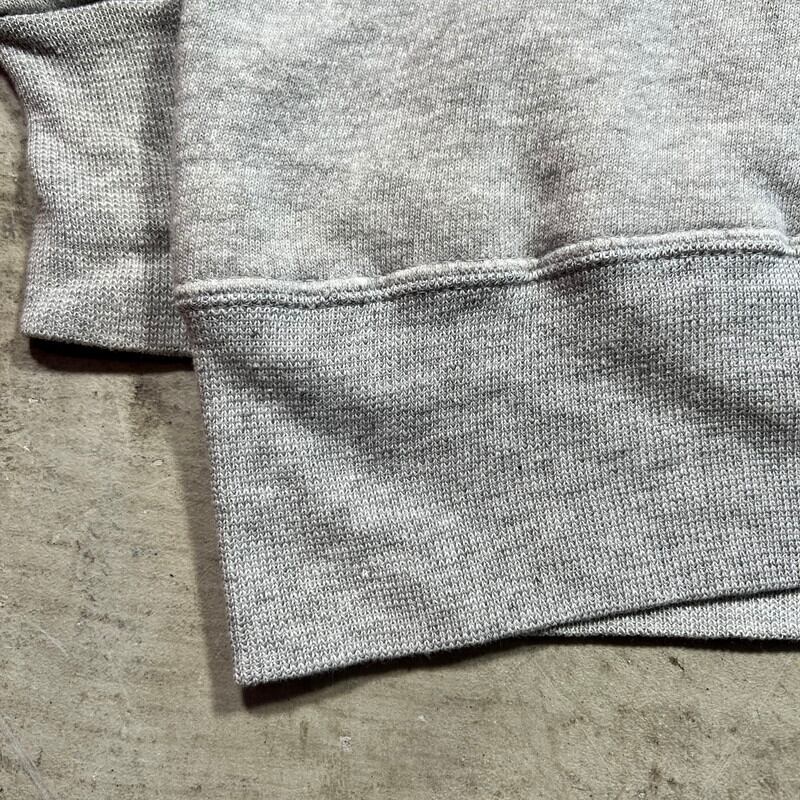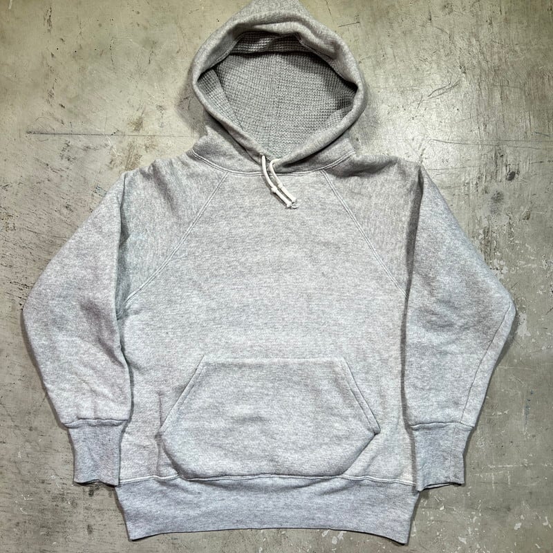 50年代から60年代頃のUnknownダブルフェイススウェットパーカーです。タグが欠損していますので、ブランド名は不明です。裏地にサーマルが付くダブルフェイス仕様です。ボディ、ライニング共にコットン100%です。フード内側のみグレーのサーマルが使われており、裏返すと2トーンになるので、両面共にお使いいただけます。フードや肩付近等にうっすらとした変色はございますが、ダメージは少なくこの年代辺りのヴィンテージスウェットとしてはかなりコンディションの良い個体だと思います。サイズはS~M相当ですが、生地はまだフカフカしてて柔らかいので、スチームアイロンでもう一回り位は伸ばせそうです。オーソドックスなグレーボディですが、オールマイティーに使えるアイテムですので、お探しの方も多いのではないでしょうか。綿100のヴィンテージスウェットは今後どんどん枯渇していくと思われますので、是非この機会にいかがでしょうか。