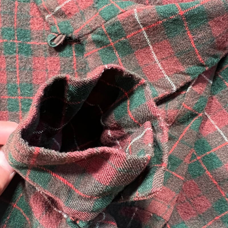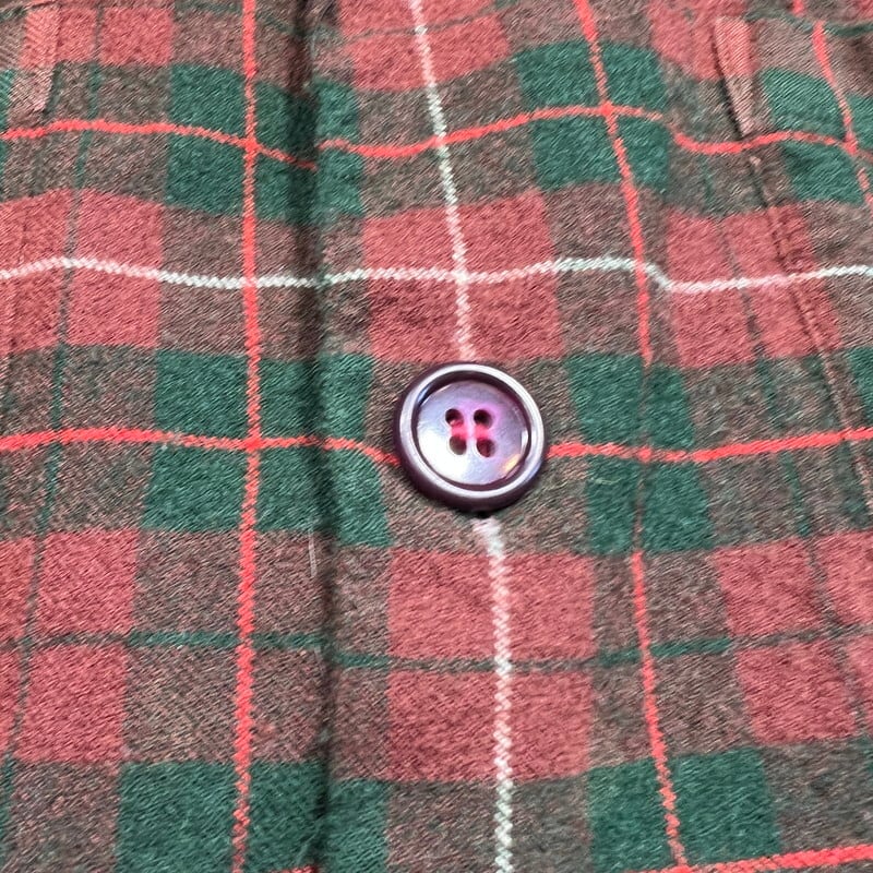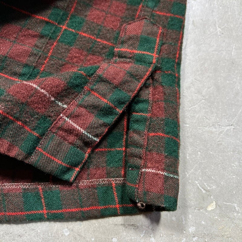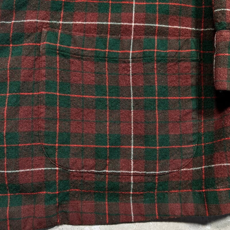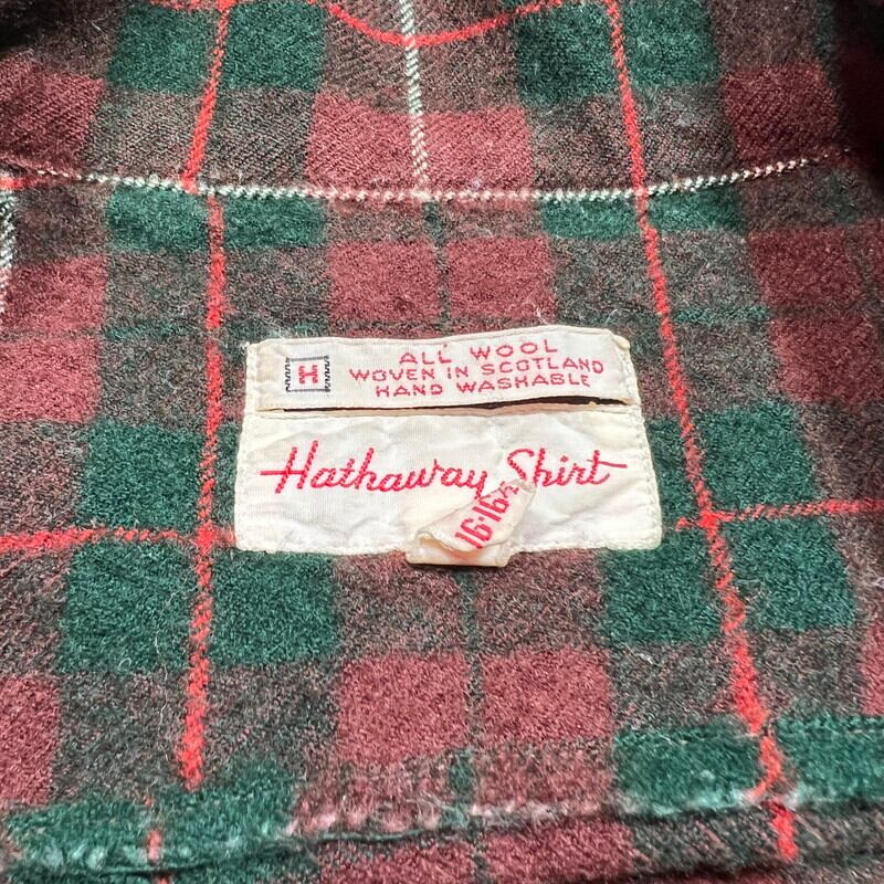 50年代頃のHathaway Shirtウールシャツジャケットです。創業は1837年とも言われる歴史ある名門のシャツメーカーです。眼帯をした「ハサウェイシャツを着た男」という広告が非常に有名なブランドです。ご紹介するこちらは、ウールのオープンカラーシャツですが、ハンドポケットが付くカバーオールタイプです。襟元はループボタンが付き、襟は袋縫いです。ポケットはしっかり柄合わせされています。チェックには様々な色味が存在しますが、こちらのブラウンチェックは意外と見かける機会は少ないのかなという印象です。襟や袖口に擦れが見らえ、毛羽立ちもございます。両袖のボタンが交換されています。その他使用感はございますが、年代を考慮すれば状態は良好だと思います。Lサイズですので需要も高いのではないでしょうか。古いデニムにさらっと羽織るだけでも様になります。使い勝手の良いアイテムですのでお勧めです。