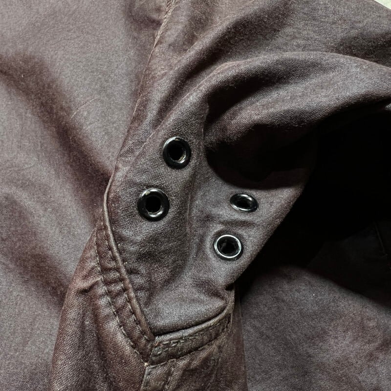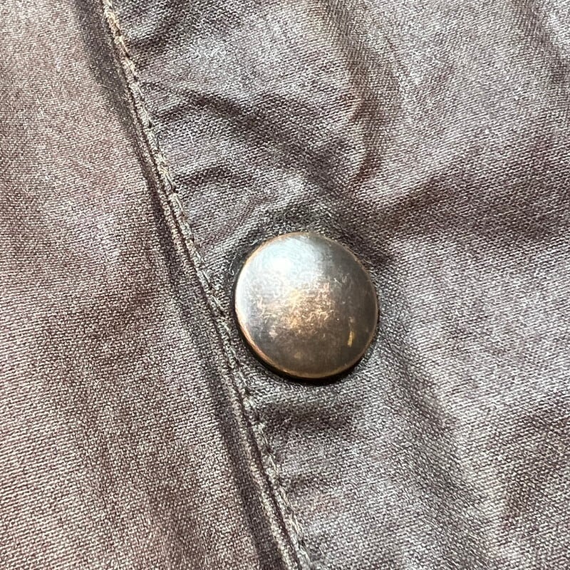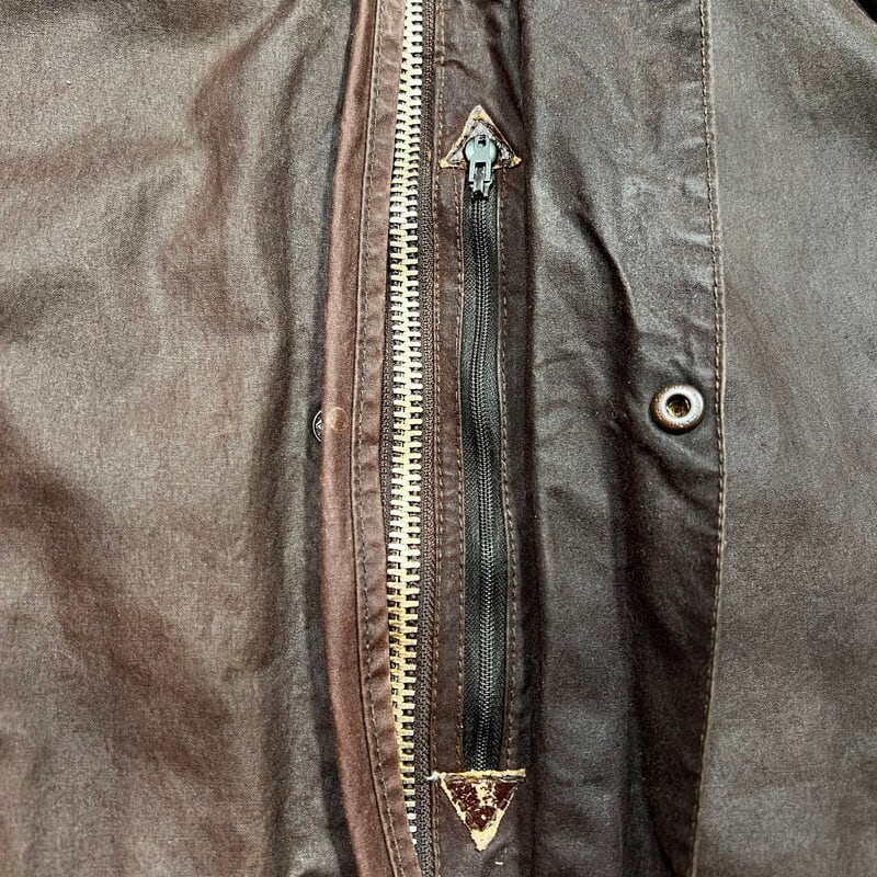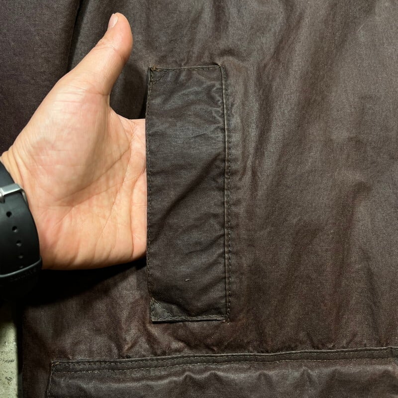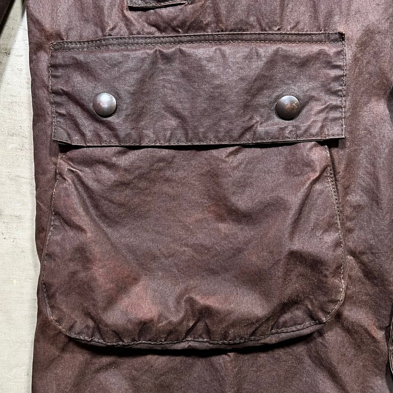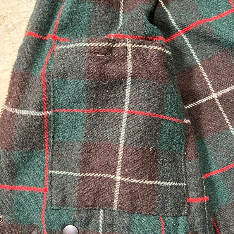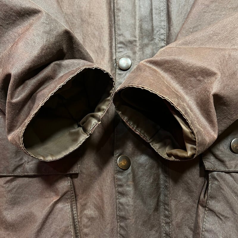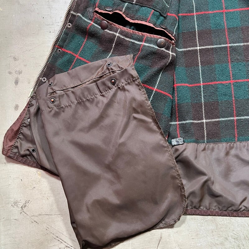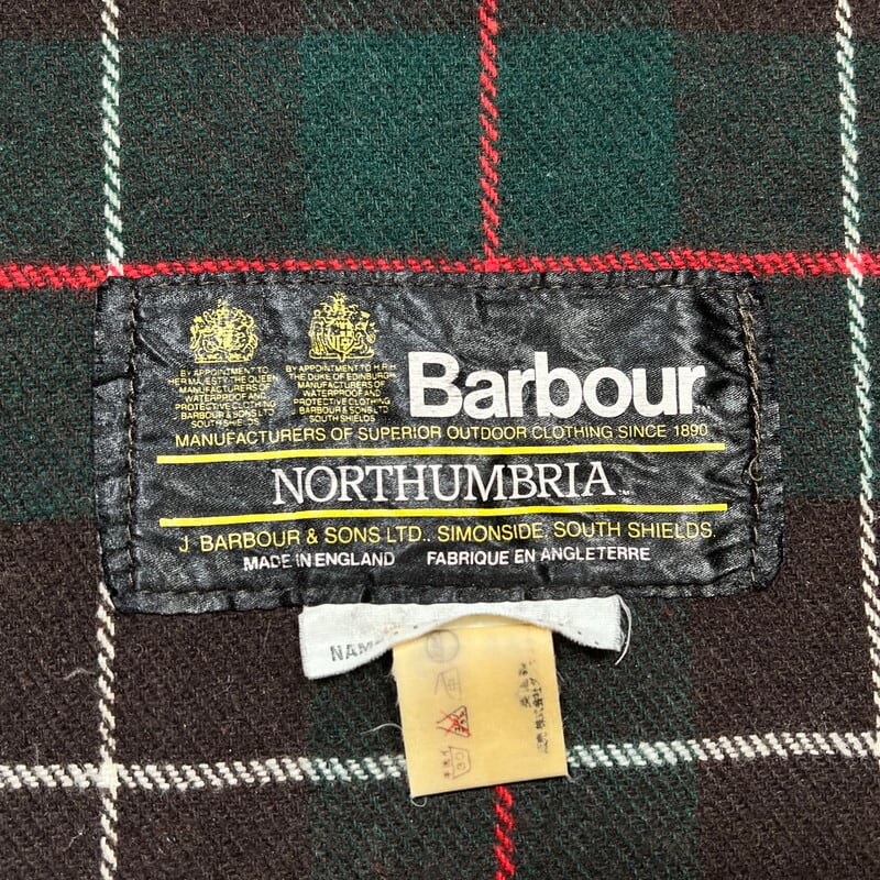 80年代のBarbour NORTUMBRIAオイルドジャケットです。1979年に登場したノーザンブリアは通常モデルの6オンスでは無く8オンスのヘビーコットンを使用したモデルで、マッキノンハンティングというノーザンブリアのみ使用されるチェック柄も特徴です。お色は定番のグリーンと比べると非常に見つかりづらい希少なブラウン。しかも当時物のフードが付くスペシャルピースです。ポケット内側のタグが欠損していますが、2ワラント表記なのでフードと同じ1985年頃のモデルです。着丈がやや長いので、シルエットも野暮ったく無くすっきりとしています。ハンドウォーマーポケット、フロントジッパー横や内胸ポケット、内側下部には取り外し可能なポケットも付いています。ボディは恐らくリプルーフされいますので、若干のオイリー感はあるものの、オイルの匂いは比較的少ないと思います。古いバブアーで見られがちな、袖先や、裾の擦り切れはほぼ無く、リペア等もございません。裾にあるサイズ表記は42インチと記載されていますが、実寸は40インチ位かなと思います。他のモデルと比べるとラグランスリーブでは無い為、アームホールは若干タイトに感じます。ブラウンの濃淡が良い雰囲気で、コンディションはかなり良いと思います。現在は復刻モデルが販売されているようですが、約35年以上前のモデルが経てきた年月が生み出す風合いは復刻モデルでは味わえませんし、今では本当に希少な2ワラント時代でコンディションの良い個体は今後さらに入手が困難になるのではないでしょうか。良いサイズ感なので、お探しだった方は是非この機会にいかがでしょうか。