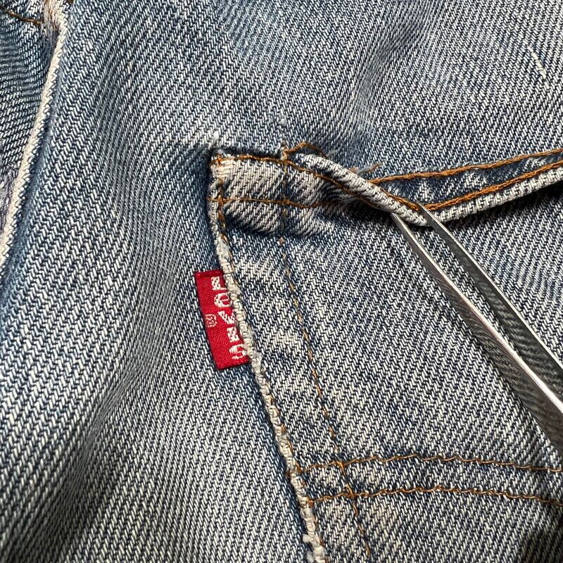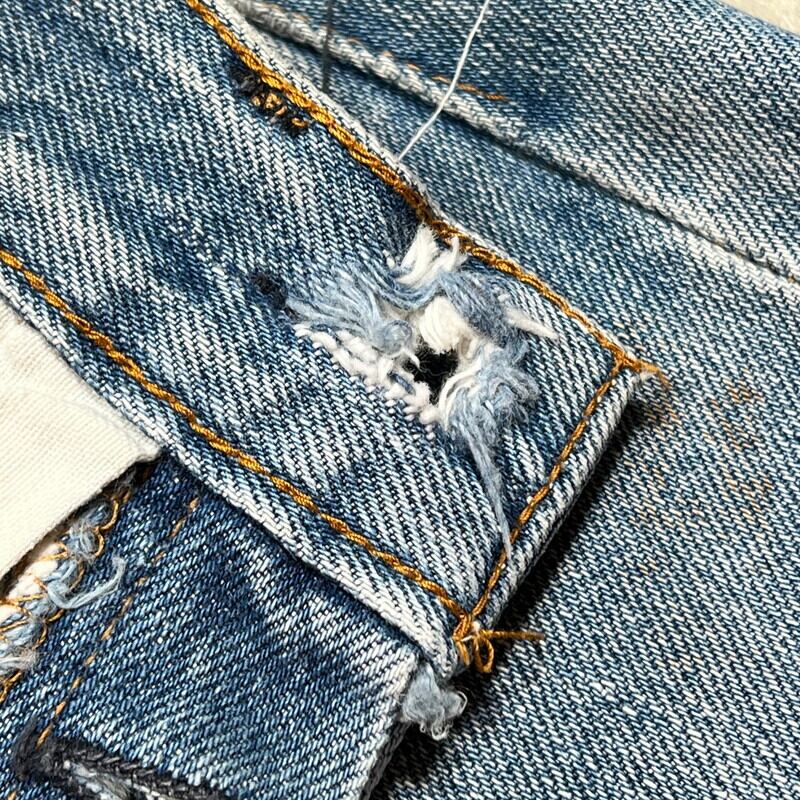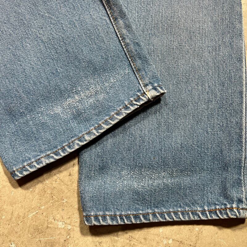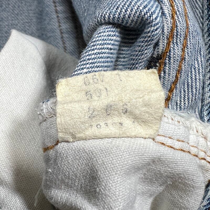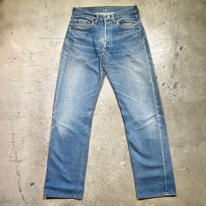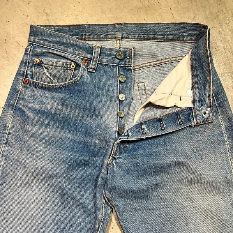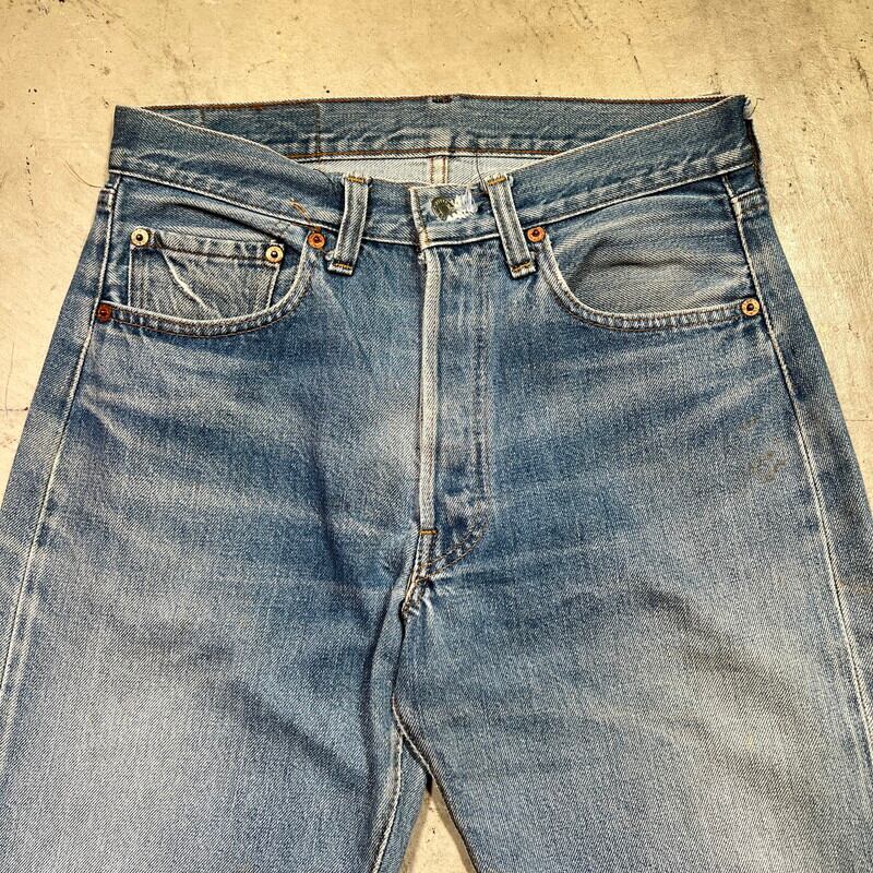 80年代初頭のLevi's501 デニムパンツです。トップボタン裏刻印6、ウォッチポケット裏チェーン、セルヴィッジ、アウトシーム裏シングル+チェーン、縮率8%、赤タブスモールe、バックポケット裏チェーン。全体的に色落ちしており色残りは3割程度でうっすらとヒゲが入る個体です。トップやフライのボタンホールにややダメージが見られ、少し緩くなっています。背面に1カ所タタキリペアがございます。その他目立つダメージは無く状態として良好かと思います。表記はW30インチですが、実寸はW29インチです。少し小さめなので、女性の方にもお勧めしたい1本です。