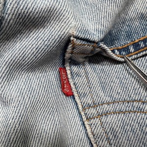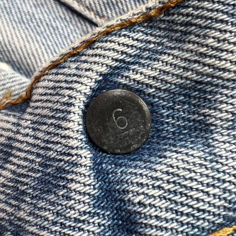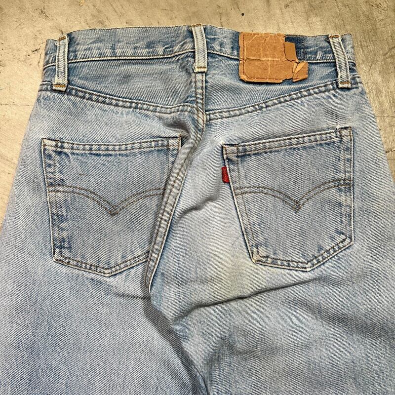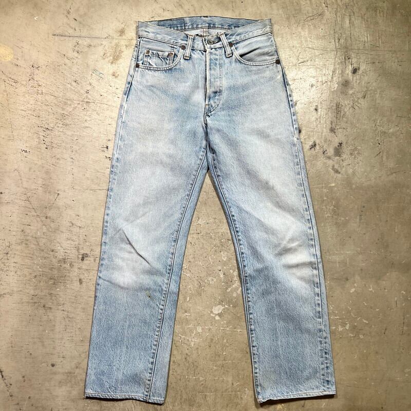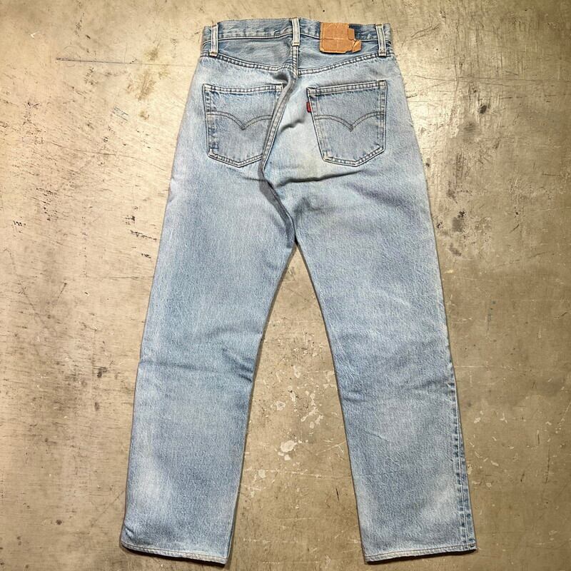 70年代から80年代頃のLevi's501 デニムパンツです。トップボタン裏刻印6、ウォッチポケット裏チェーン、セルヴィッジ、アウトシーム裏シングル+チェーン、赤タブスモールe、バックポケット裏チェーン。全体的に色落ちしており色残りは2割程です。だいぶ褪色していますので、ヒゲはほとんど消えています。右脛に汚れ、背面に薄汚れがございます。内側の紙タグは印字が消えて読めません。ウォッチポケットにも若干ダメージがございます。紙パッチも半分ほど取れかかっています。ウエストは実寸でW27インチと小さめですので、細身な男性や女性にお勧めしたい1本です。色残りとサイズ感考慮で、お買い求めしやすい価格帯とさせていただいております。サイズが合う方は是非いかがでしょうか。