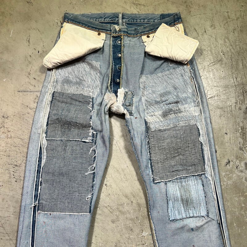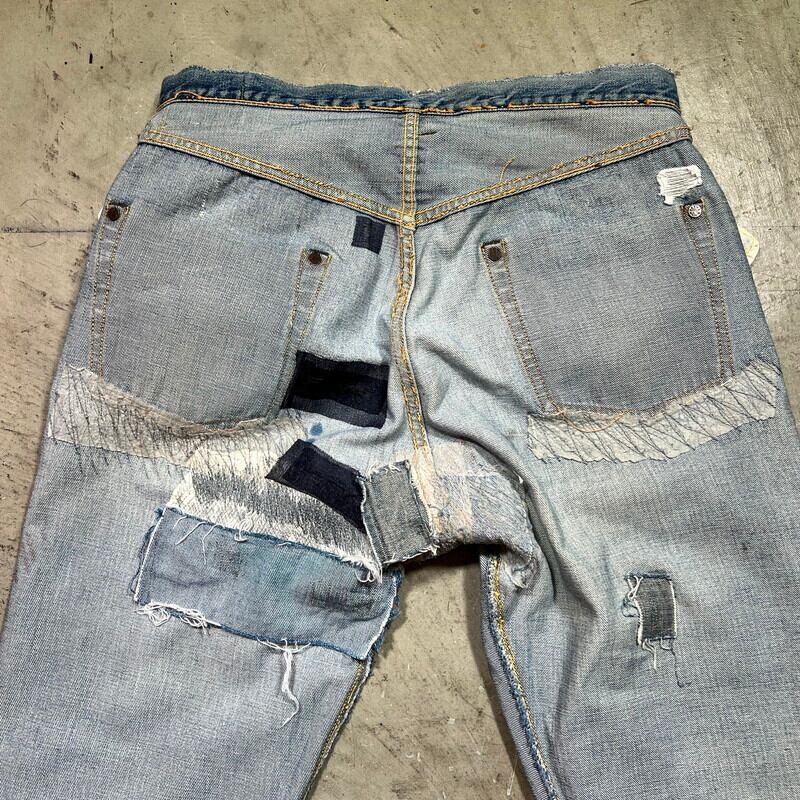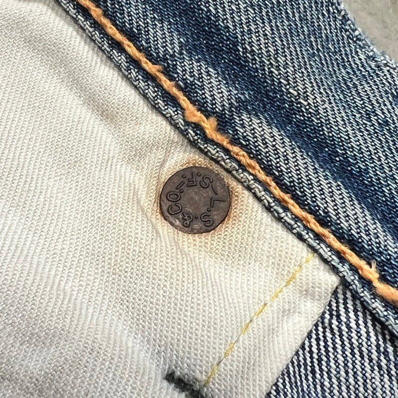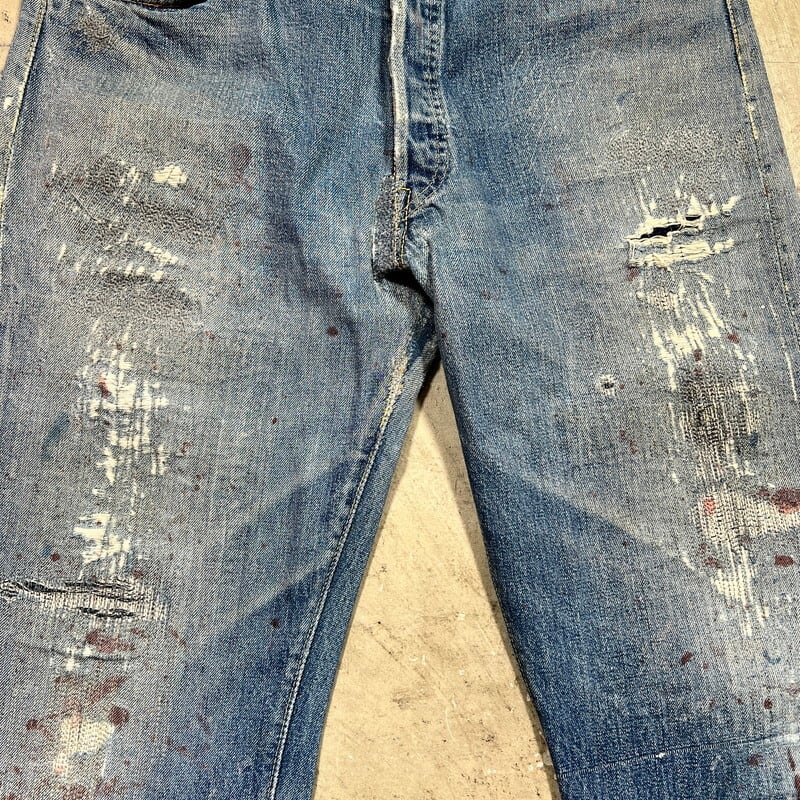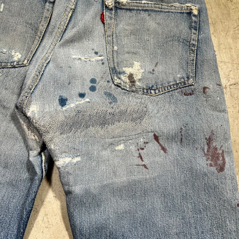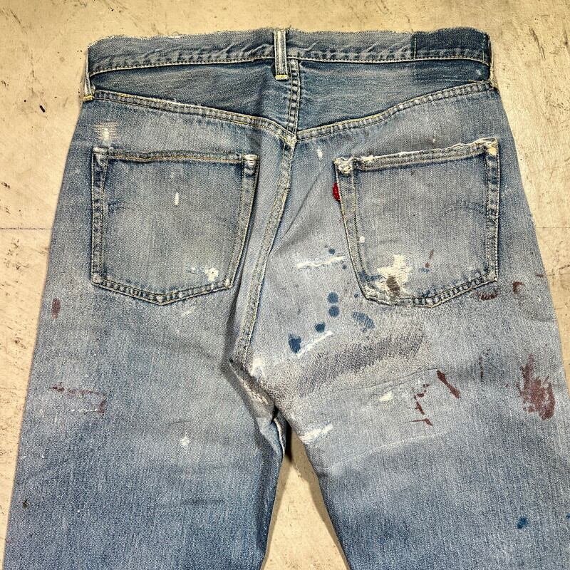 50年代頃のLEVI'S 501XX デニムパンツです。トップ裏ドット刻印、Vステッチ、鉄製同メッキリベット、ウォッチポケット裏耳付き、足長R、オフセットループ、赤タブBig E。パッチが欠損しておりますが、革パッチから移行した後の所謂紙パッチギャラ有りモデルです。デニム全体にリペアが施されており先日ご紹介した501XXのギャラ無しモデル同様にヴィンテージらしい雰囲気です。色残りは3~4割程ですが、リペアや全体的に飛んだインクのような塗料のおかげで最高のグランジ感が味わえる1本です。着用に支障が有りそうな箇所は全てリペアが施されています。赤タブは解れていますので文字がほとんど読めない状態です。ウエストは実寸W34インチとゴールデンサイズです。レングスもしっかりありますので、がっつりロールアップして合わせてみるのも良いかもしれません。無地のトップスに革ジャン等でラフに合わせとも様になるアートピースな1本ですので、お好きな方は是非この機会にいかがでしょうか。グランジファッションがお好きな方にもお勧めな1本です。