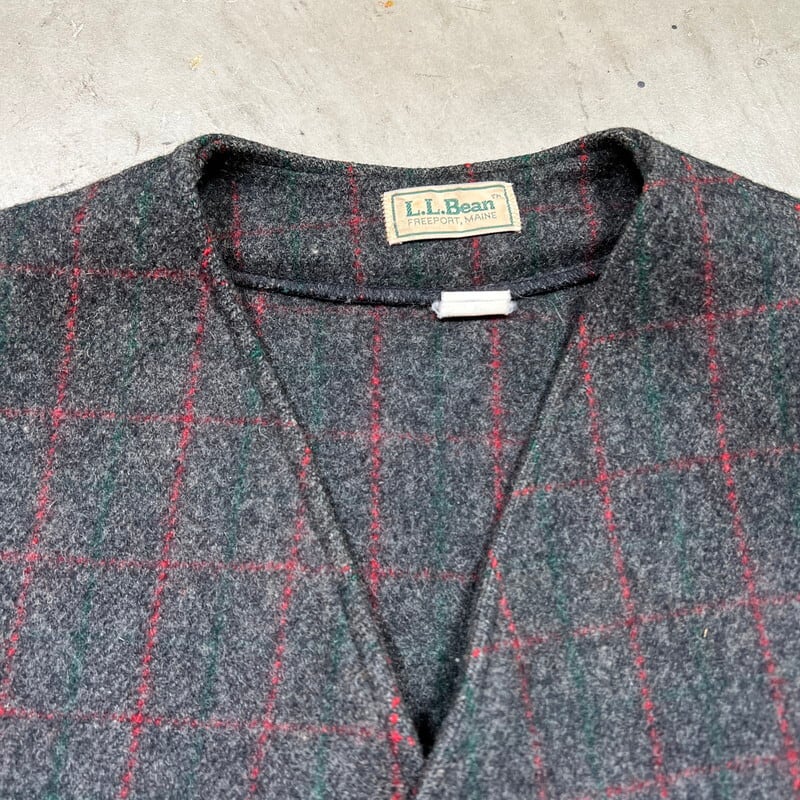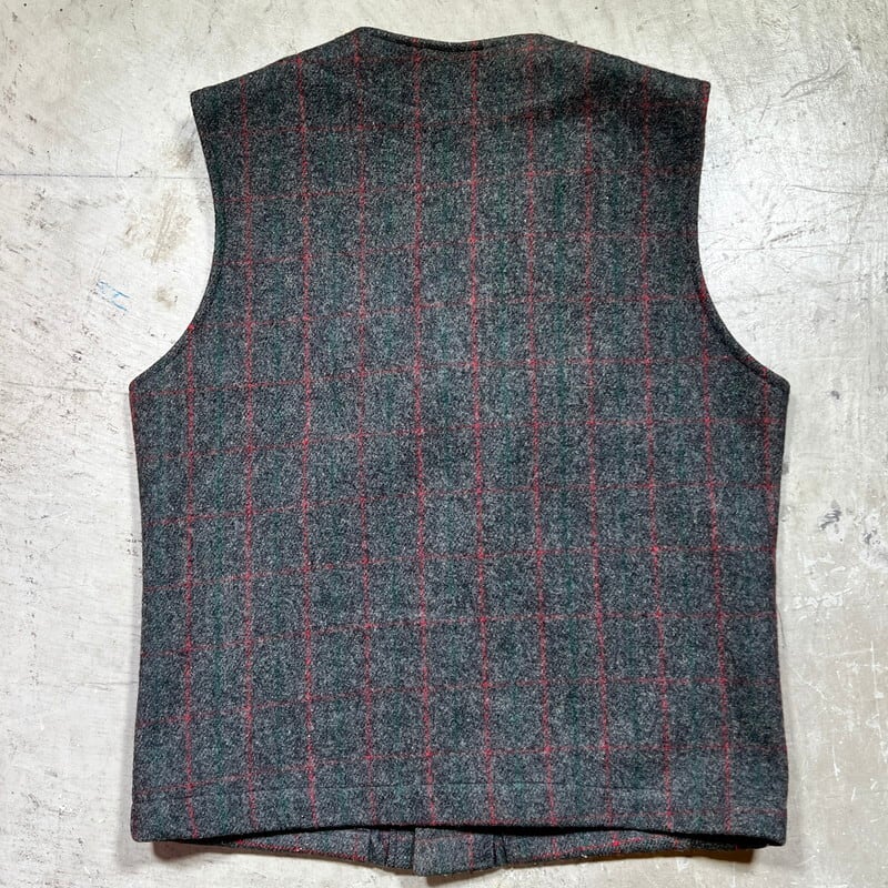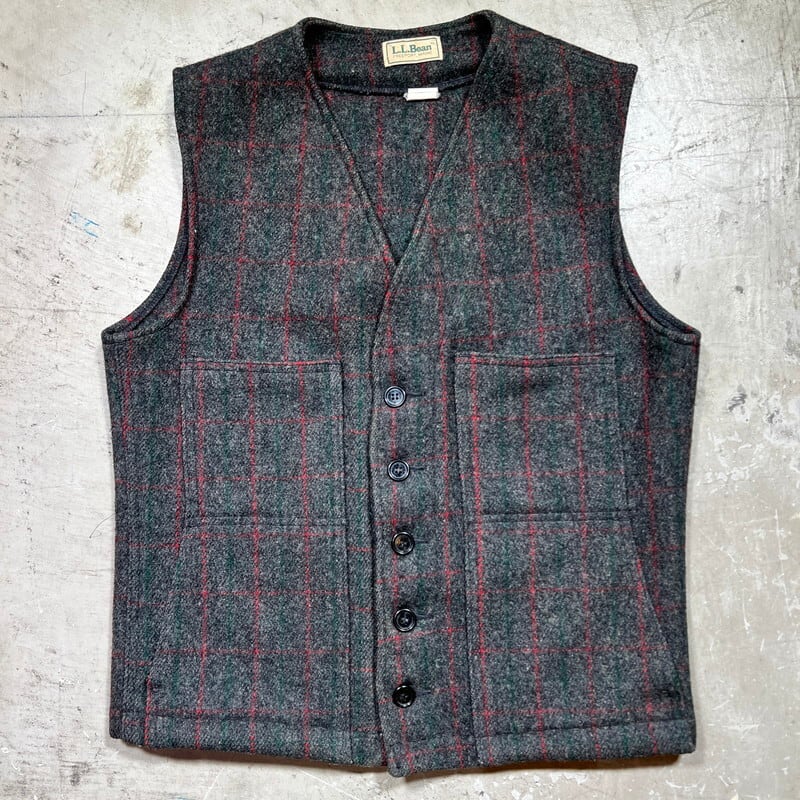 70年代から80年代頃のL.L.BEANウールベストです。他のアウトドアブランドでも古くから使われる事の多い”MALONE"と呼ばれるグレー地にグリーンとレッドのチェック柄のウール地が使用されています。元はJ.O.BALLARDという会社が地名のMaloneと銘打ったウールの衣類を製造していた事が起源だそうです。ご紹介するこちらは、個別のパチポケでは無く縦に一体型となった4つポケ仕様です。FILSONのマッキーノーベストとほぼ同じデザインです。タグに薄汚れはございますが、ダメージなど無く状態は良好です。Sサイズですが、今の季節ですとインナーにも着やすいサイズ感だと思います。L.L.BEANのアイテムの中でも見かける機会が少ないモデルだと思います。筆記体タグから移行した頃のTM表記が入るというのも嬉しいポイントでは無いでしょうか。ベストはジャスト目に着たいという方は是非この機会にいかがでしょうか。