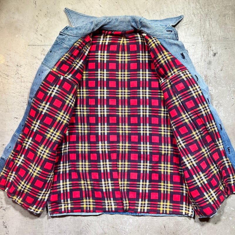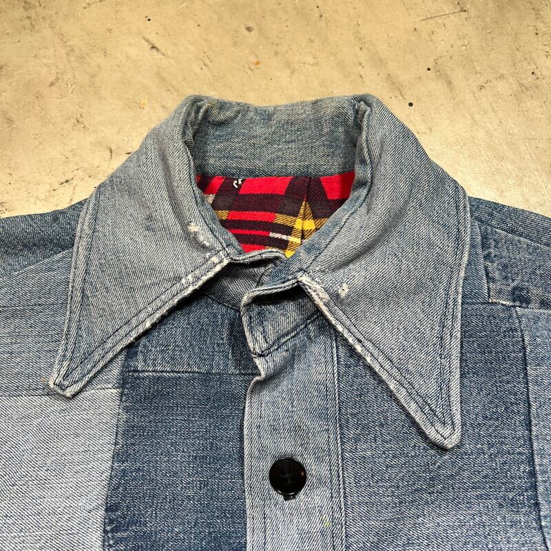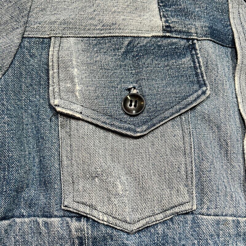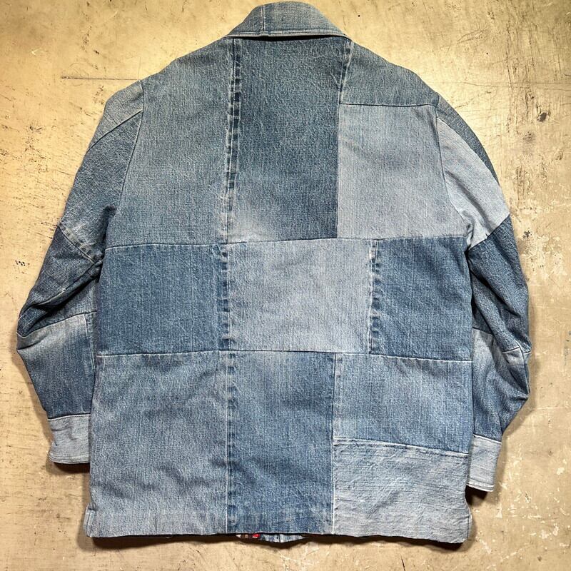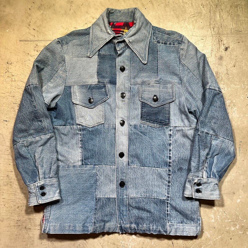 70年代から80年代頃のハンドメイドパッチワークデニムジャケットです。襟が大き目に作られた当時のハンドメイド物で、ヒッピーカルチャーが感じられる素晴らしいデザインです。薄めではあるものの、濃淡の違いも楽しめます。ライニングにはコットンのプリントネルが使われております。ネル生地のステッチが一部解けていたので、内側を確認すると、所々にセルヴィッジ付きのデニムが使用されておりました。生地の感じからすると66後期あたりのデニムが使われているのかもしれません。ほつれは補修していますので現段階では内側は見れません。擦れや小さなダメージ等は見られますが、各パーツごとに異なる色落ちも含め良いアジだと思います。トータル的なサイズはLといったところですが、ライニングがある為着用したフィット感はMサイズ程だと思います。1点1点表情が異なるハンドメイドだからこそ人と被らないというのが魅力的です。70'sカルチャーがお好きな方はぜひこの機会にいかがでしょうか。