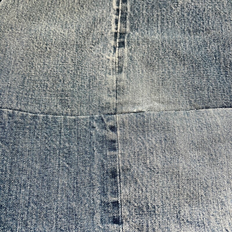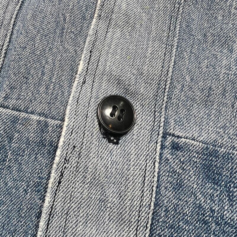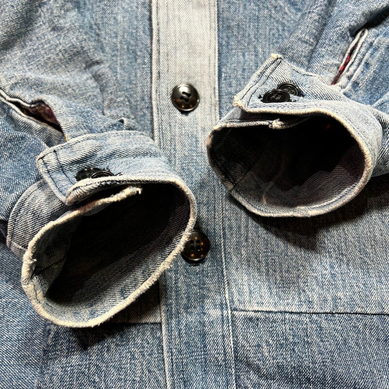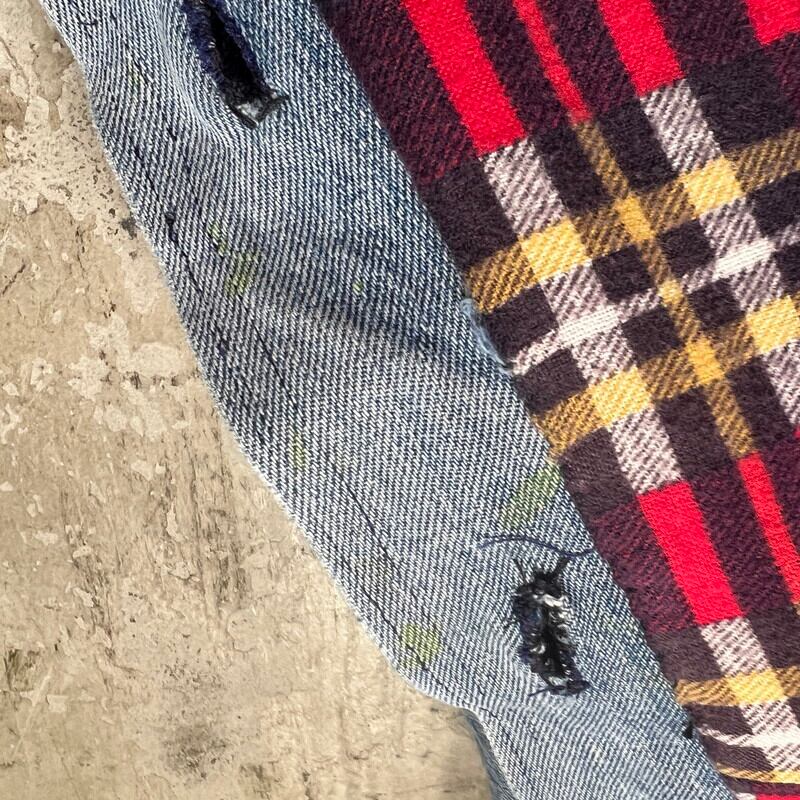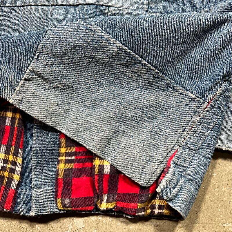 70年代から80年代頃のハンドメイドパッチワークデニムジャケットです。襟が大き目に作られた当時のハンドメイド物で、ヒッピーカルチャーが感じられる素晴らしいデザインです。薄めではあるものの、濃淡の違いも楽しめます。ライニングにはコットンのプリントネルが使われております。ネル生地のステッチが一部解けていたので、内側を確認すると、所々にセルヴィッジ付きのデニムが使用されておりました。生地の感じからすると66後期あたりのデニムが使われているのかもしれません。ほつれは補修していますので現段階では内側は見れません。擦れや小さなダメージ等は見られますが、各パーツごとに異なる色落ちも含め良いアジだと思います。トータル的なサイズはLといったところですが、ライニングがある為着用したフィット感はMサイズ程だと思います。1点1点表情が異なるハンドメイドだからこそ人と被らないというのが魅力的です。70'sカルチャーがお好きな方はぜひこの機会にいかがでしょうか。