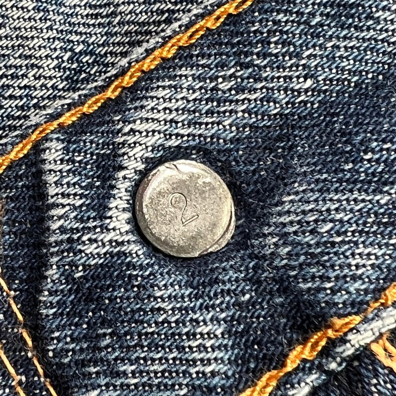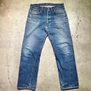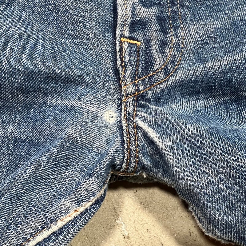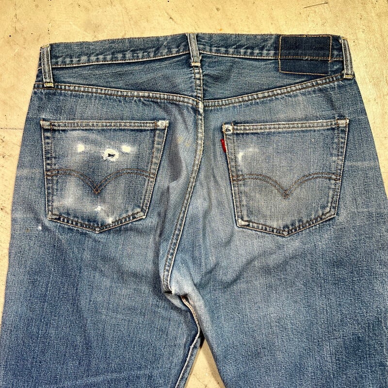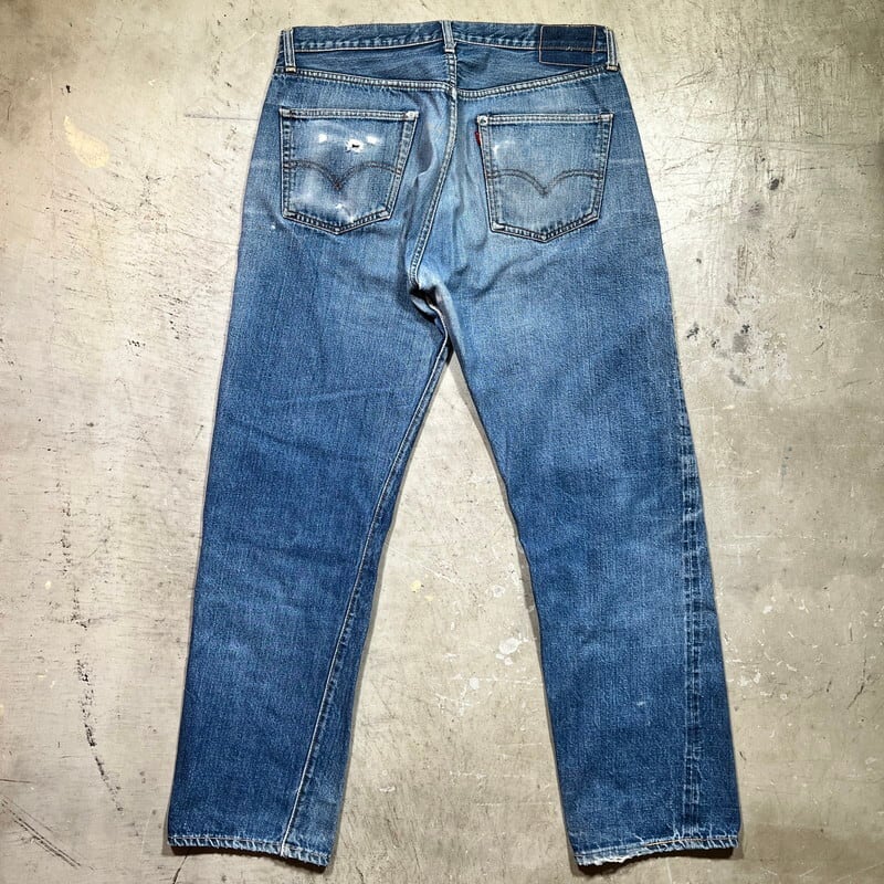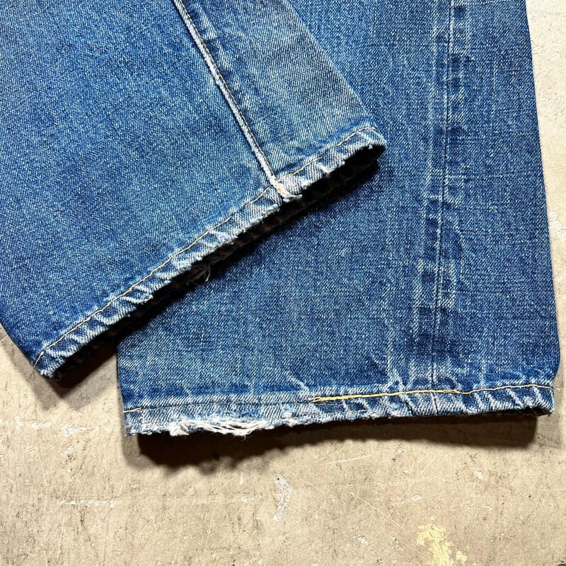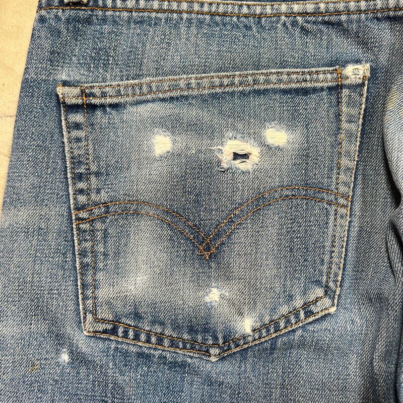 60年代から70年代頃のLEVI'S 501デニムパンツです。トップボタン裏刻印2、足長R、平行ステッチ、バックポケット裏シングル、セルヴィッジ裏両面シングル、赤タブBig E、不均等V。色残りは4~5割程ですが、ヒゲも入り、ヴィンテージデニムらしい色落ちをしています。ポケット縁とバックポケットにダメージが有り、小股部分はリペアが施されています。裾にも擦れたダメージが若干ございます。ウエストは実寸W35インチとゴールデンサイズです。小股のリペアはございますが、腿や膝にはリペアは入らずまだまだ生地はしっかりしていますので、長くお使いいただける個体だと思います。この辺りのサイズを探されている方も多いのでは無いでしょうか。ヴィンテージリーバイスは見つけた時が買い時だと思いますので、お探しだった方は是非この機会にいかがでしょうか。