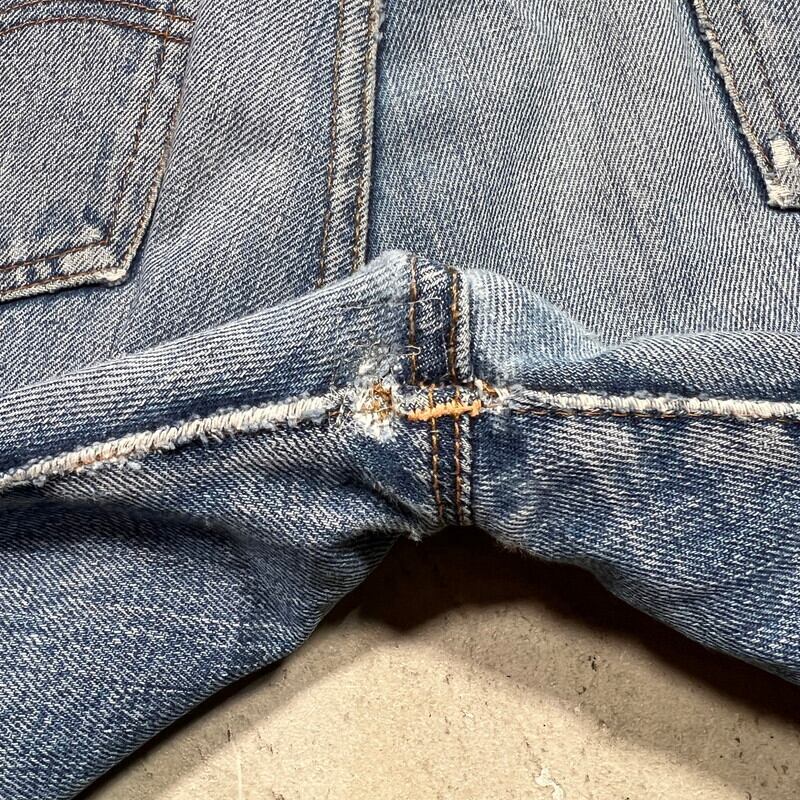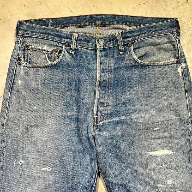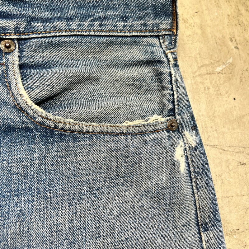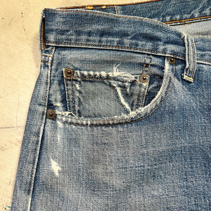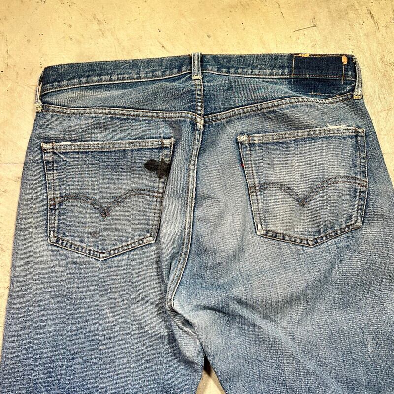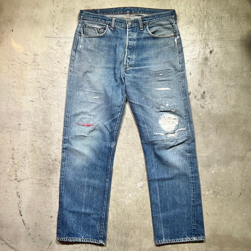 60年代から70年代頃のLEVI'S 501デニムパンツです。トップボタン裏刻印2、足長R、セルヴィッジ裏両面シングル、赤タブ欠損。色残りは2~3割で、全面に多数リペアが入る1本です。ポケットスレーキにも小穴のダメージがございます。かなりざっくりとしたリペアが返ってグランジ感を強めた印象です。股の付け根にも小さなリペアがあり、バックポケットにはインク染みが見られます。レングスはオリジナルで、長さも充分ございます。ウエストは実寸W35インチとゴールデンサイズです。この辺りのサイズを探されている方も多いのでは無いでしょうか。ヴィンテージリーバイスは見つけた時が買い時だと思いますので、グランジ系のダメージデニム等がお好きな方やお探しだった方は是非この機会にいかがでしょうか。