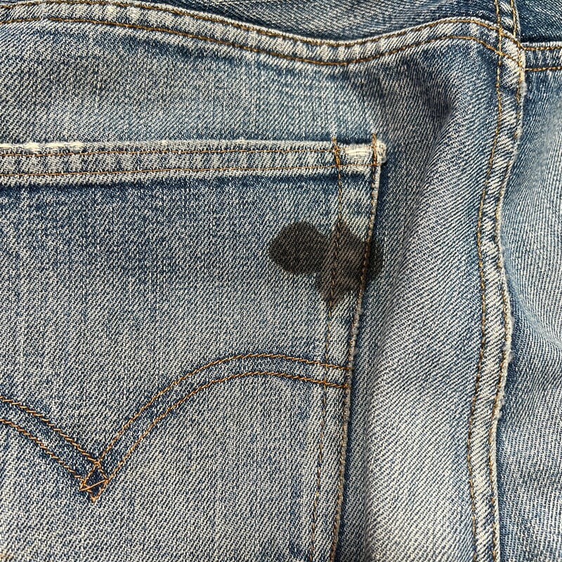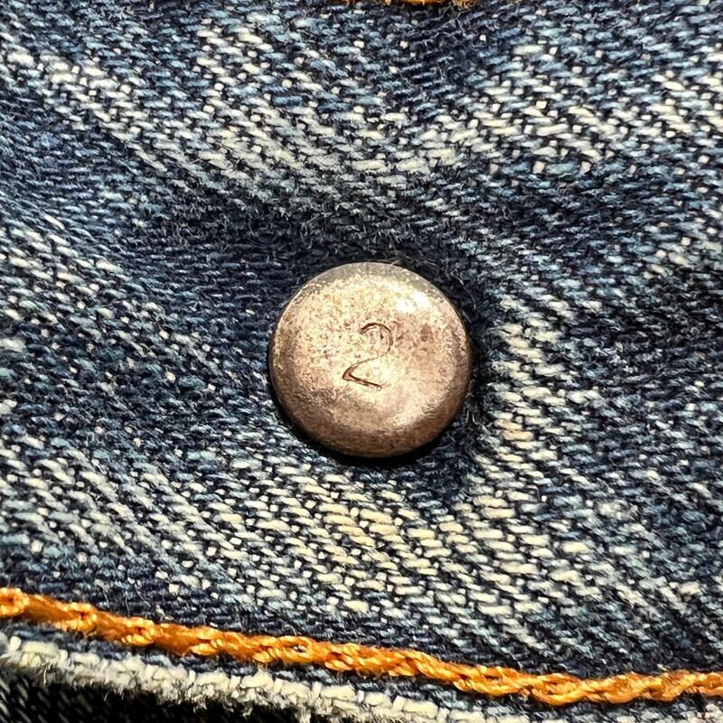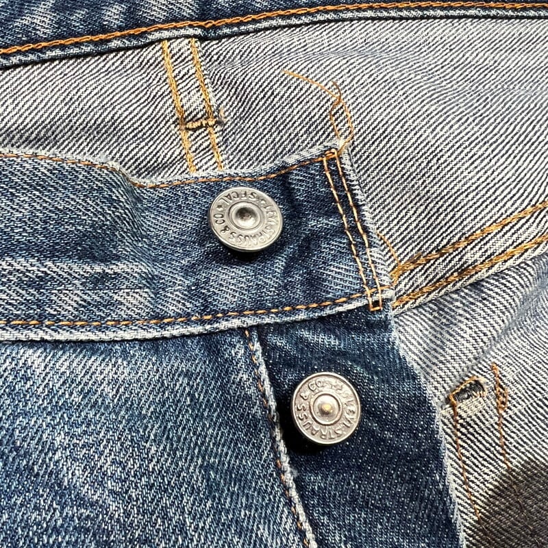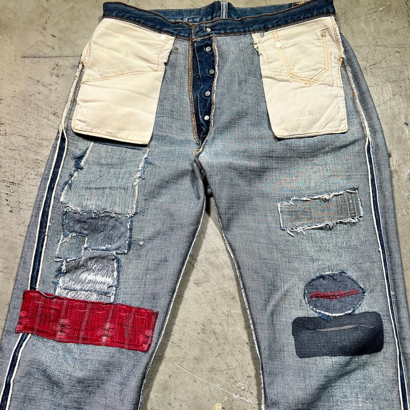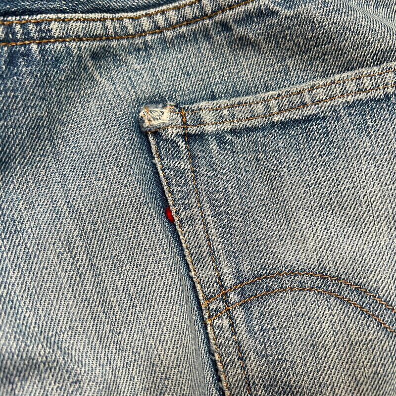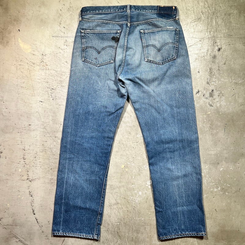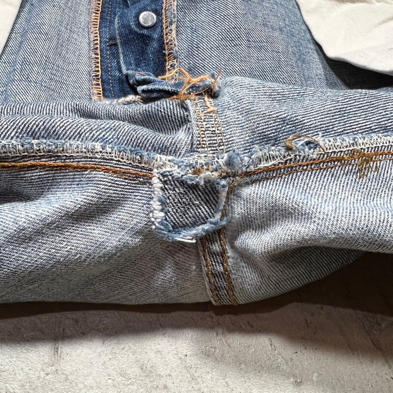 60年代から70年代頃のLEVI'S 501デニムパンツです。トップボタン裏刻印2、足長R、セルヴィッジ裏両面シングル、赤タブ欠損。色残りは2~3割で、全面に多数リペアが入る1本です。ポケットスレーキにも小穴のダメージがございます。かなりざっくりとしたリペアが返ってグランジ感を強めた印象です。股の付け根にも小さなリペアがあり、バックポケットにはインク染みが見られます。レングスはオリジナルで、長さも充分ございます。ウエストは実寸W35インチとゴールデンサイズです。この辺りのサイズを探されている方も多いのでは無いでしょうか。ヴィンテージリーバイスは見つけた時が買い時だと思いますので、グランジ系のダメージデニム等がお好きな方やお探しだった方は是非この機会にいかがでしょうか。