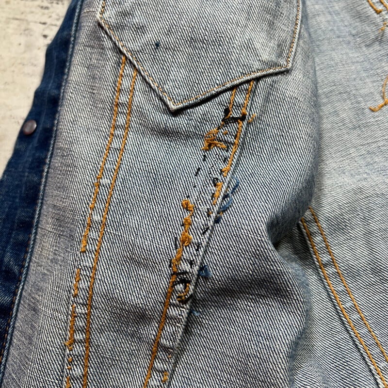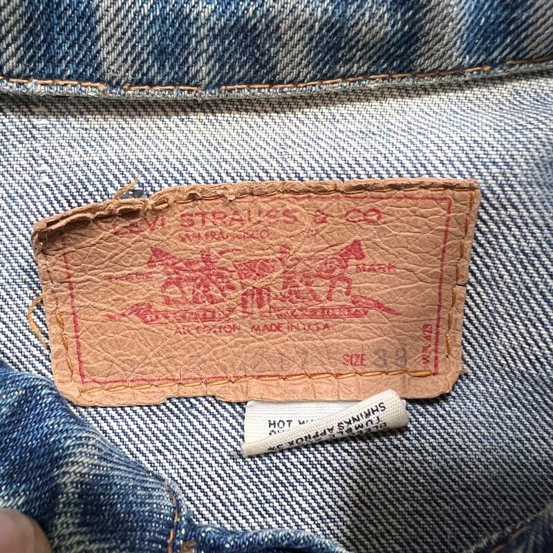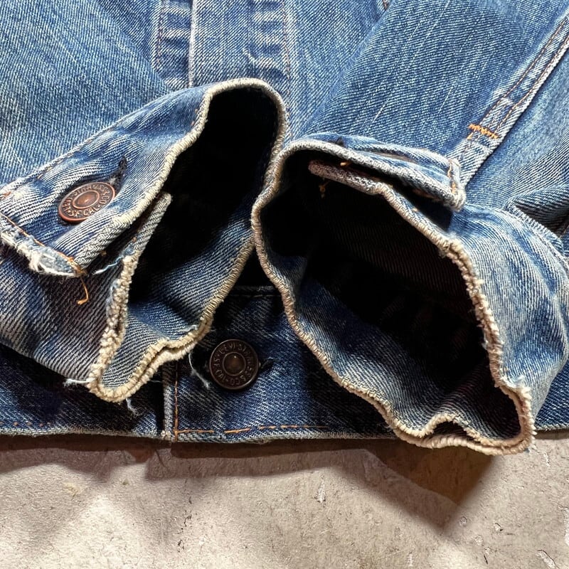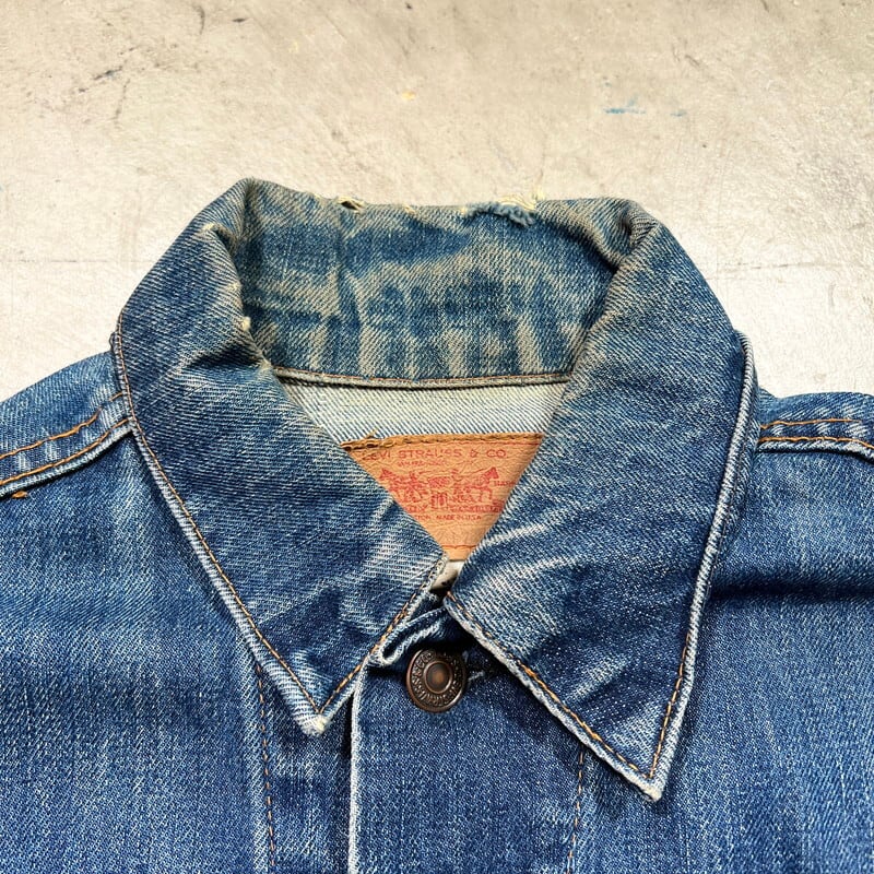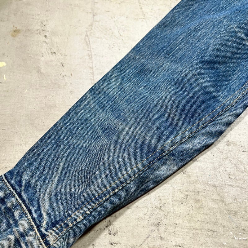 60年代頃のLEVI'S 70505デニムトラッカージャケットです。小紙パッチ、ボタン裏524刻印、赤タブBig E、均等V、ポケット裏シングル、閂ブラック。所謂4thと呼ばれるモデルです。557の3rdに比べ着丈も長いのでファッション性も高く様々なスタイリングに使える優れものです。色残りは4~5割ほどで、着込めばまだまだエイジングが楽しめる色味です。襟と袖先にややダメージがございます。フロントのダーツに一部ハンドステッチによる縫い直しがございます。袖内側にはハチノスも入り雰囲気の良い個体です。38表記ですので男女共に着用しやすいサイズでオススメです。4thモデルのBig Eも年々手に入れづらくなってきていますので、お探しだった方は是非この機会にいかがでしょうか。