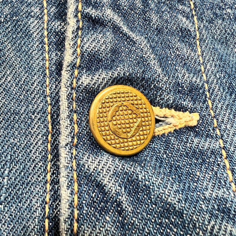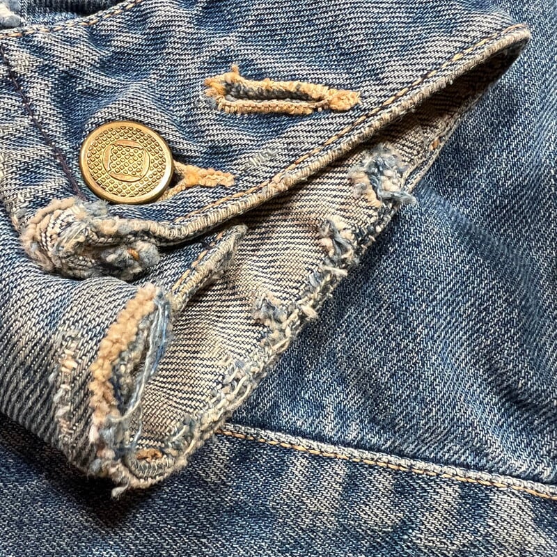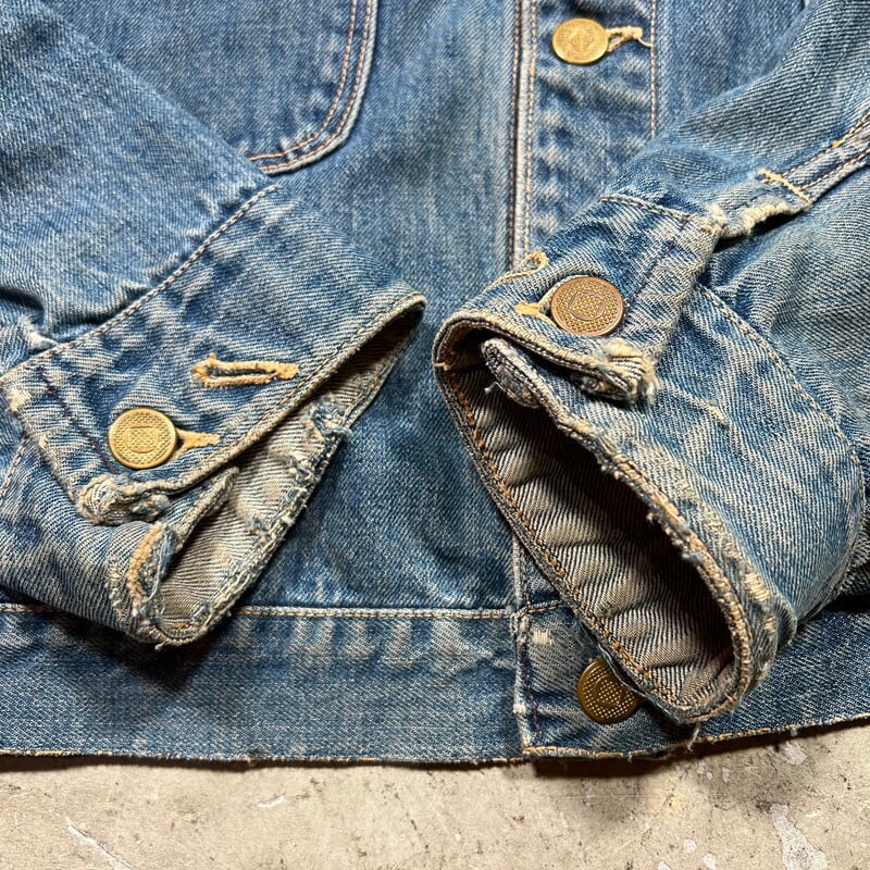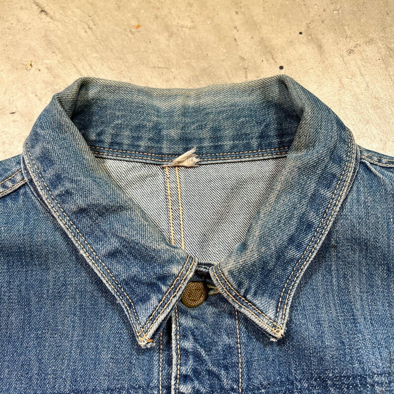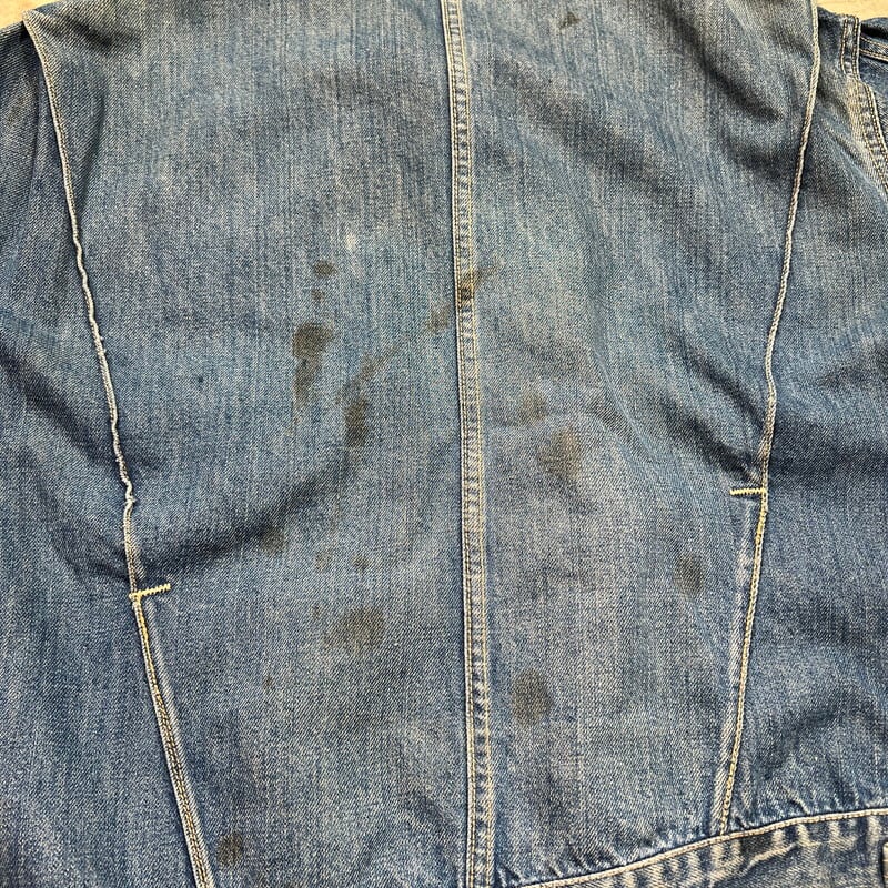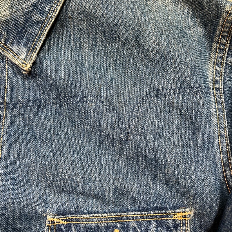 50年代前後頃のUnknownデニムジャケットです。タグや社名の入らないボタンですので、確定ではありませんが、後年のモデルで、MADEWELL刻印やタグが付く個体もございますので、恐らくMADEWELL物なのかなと思います。リーバイスでいう2ndモデルのような2ポケットスタイルで、ウエスト両サイドにはバックルで調整できるアジャスターが付きます。胸元のステッチが非常に特徴的です。このステッチはアーキュエイトのようでもありますが、個人的にはウェスタンヨークのデザインの類なのかなと思います。残念ながら胸元のステッチは全て解かれてしまっています。袖先に若干のダメージが見られます。背面にオイル染みのような汚れがございます。その他ダメージは無くコンディションは良好だと思います。身幅が広く着丈の短いクラシックなスタイルで、サイズ表記はございませんが身幅の広さを考慮すると44-46相当はあるのかなという印象です。着丈が短めなので、ざっくり羽織ってインナーとのレイヤードを楽しむコーディネートを楽しめるのではないでしょうか。