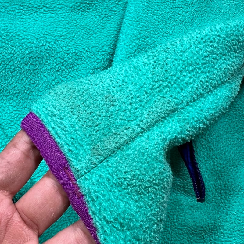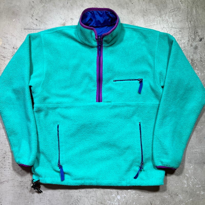 80年代のパタゴニア グリセードプルオーバージャケットです。89年製造の初期頃のモデルです。表がフリース×ナイロンのリバーシブルジャケットで、ナイロン面のポケット内側にタグが付きます。パタゴニアらしい配色で発色の良いエメラルドグリーンが目を惹く1着です。パープルのパイピング部分に毛玉や擦れが見られます。ナイロン面に薄汚れや袖付近に小穴がございます。ナイロン面背面に糸抜けのような線が入っています。その他使用感はございますが比較的状態は良好かと思います。Mサイズですので、男女共に使い易いサイズではないでしょうか。トップスも良し、インナーの差し色にも良しと幅広くお津j会頂けるアイテムですので、古いパタゴニアがお好きな方は是非この機会にいかがでしょうか。
