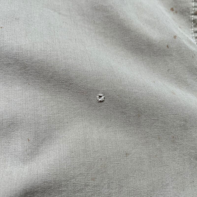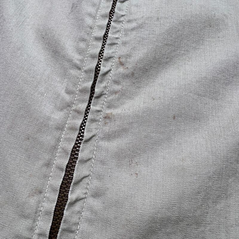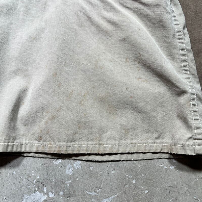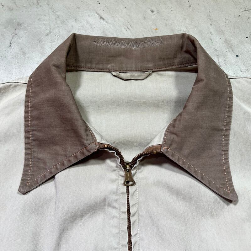 40年代頃のUnknownコットンポプリンジャケットです。タグはございませんので、詳細は不明です。薄手のコットンポプリン地で、襟と袖の色が切り替わっております。ミリタリーのサマーフライトジャケットのようなデザインですが、バックスタイルは古いスポーツジャケットの様でもあります。フロントはCONMAR社のベル型ピンロックジッパーが使用されコの字留めとなっております。襟やポケットには丁寧にリペアが施されています。袖先に擦り切れが見られます。アームホールの縫製で生地がはみ出ている箇所がございますが、製造時のエラーだと思います。着用に問題はございません。その他細かなシミや小穴等ございますが、比較的良好だと思います。2トーンですがシンプルなデザインなので、使い易いアイテムではないでしょうか。身幅にゆとりがありますので、L相当のサイズ感だと思います。薄手ですので春先にお勧めなアイテムです。
