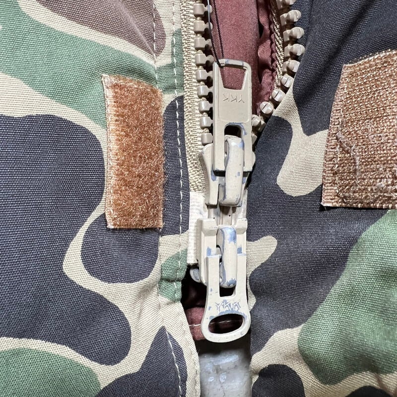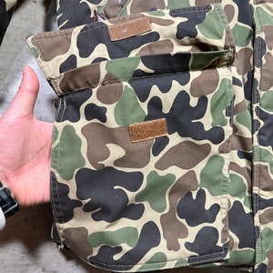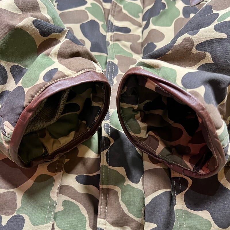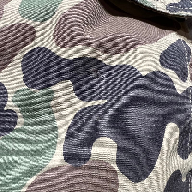 80年代頃のBLACK SHEEP ダックハンターカモダウンジャケットです。BLACK SHEEPは1957年にテキサス州ダラスにて創業したBUDDY SCHOELLKOPF PRODUCTS INCが展開していたハンティングウェア等を製造していたブランドです。ご紹介するこちらは、ダックハンターカモ柄の珍しいタイプのダウンジャケットです。ハンティングジャケットのようなデザインで、ハンドウォーマーポケットに、マチ付きの大きなフラップポケット、サイドにはスラッシュポケットもございます。YKK社のデカダブルジップ仕様です。内側には小さなポケットが左右に付きます。袖先はレザーでパイピングが施されています。袖内側にはリブもございますので、防寒性の高い作りをしています。一部薄汚れはございますが、コンディションの良い個体です。ダウンはパンパンで羽根抜けも殆どなく綺麗です。Mサイズ表記ですが、少しゆとりのある作りをしていますので、体感ではL相当んも大きさはあるかなと思います。BLACK SHEEPのダウンジャケットはほとんど見かける機会もないので、お好きな方は是非いかがでしょうか。かなり温かいのでお勧めです。