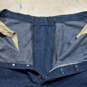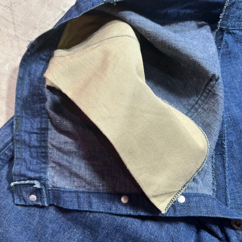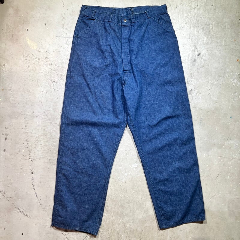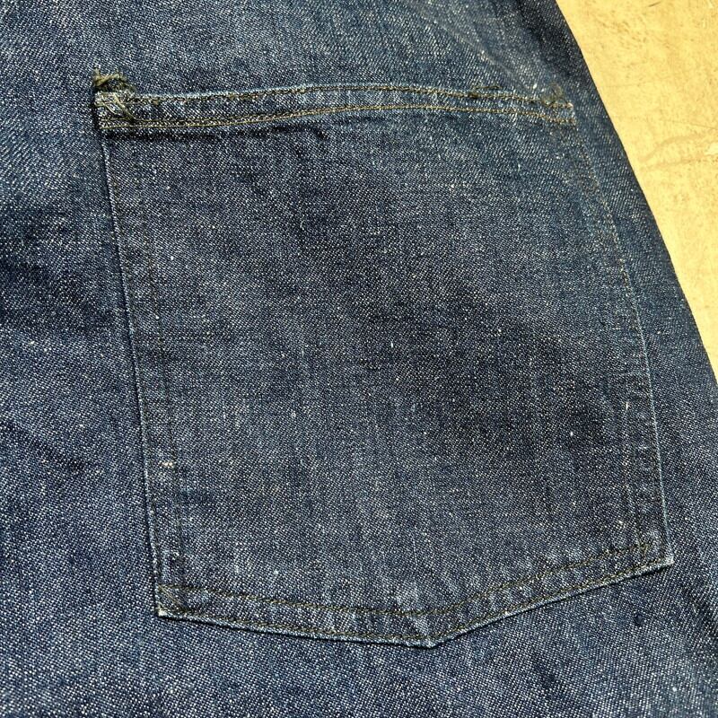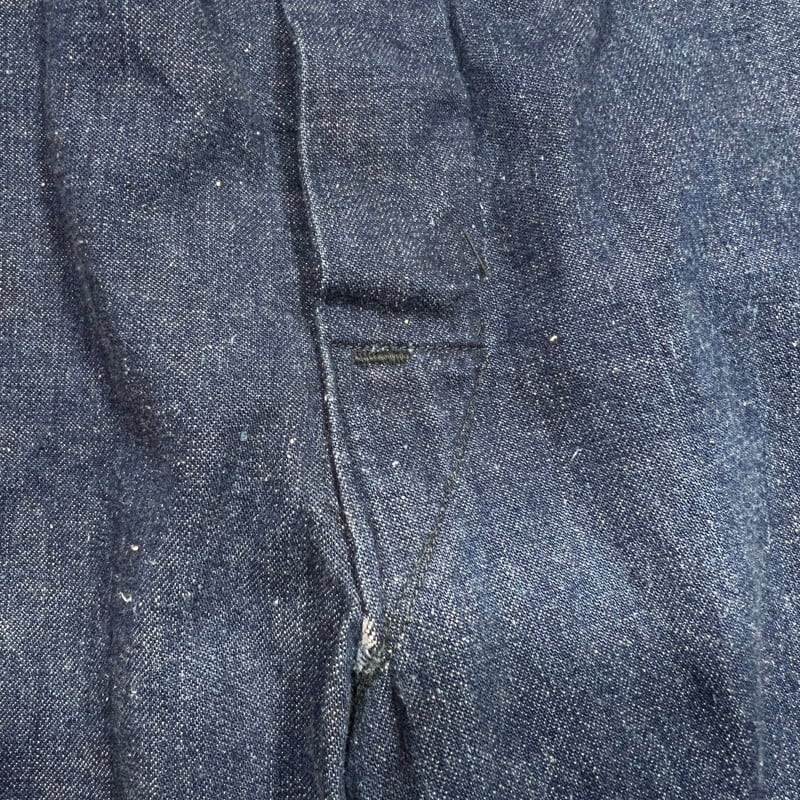 40年代頃のUnknownデニムパンツです。タグ等ありませんので詳細は不明ですが、第二次世界大戦時の物資統制により採用されていた月桂樹ボタンや、スレーキにはチノクロスが使用されています。U.S.NAVYのようなライトオンスデニム、ステッチもブラックステッチで縫製されています。サイドはダブルステッチ仕様です。元々ウエストがW42インチほどありすこし大きすぎたので、お直し屋さんにお願いして10cmほどサイズ直しをしてもらいました。ミリタリーチノでのようにサイズが直せるタイプの作りでしたので、ここからさらに詰める事も出来ますし、元の大きさまで広げる事も可能です。現在でW38~39インチほどあり少し大き目ではありますが、ゆったりとしたシルエットが魅力的ですので、ウエストをぎゅっと絞って穿いてもカッコ良いと思います。この個体は恐らくストア系のマイナーなブランド物だと思いますが、ここまで色が濃くコンディションの良い個体はなかなか見つからないと思います。これからの経年変化も充分に楽しめる1本ですので、大きいサイズを探していらした方や、大戦期のデニムをお探しだった方は是非この機会にいかがでしょうか。