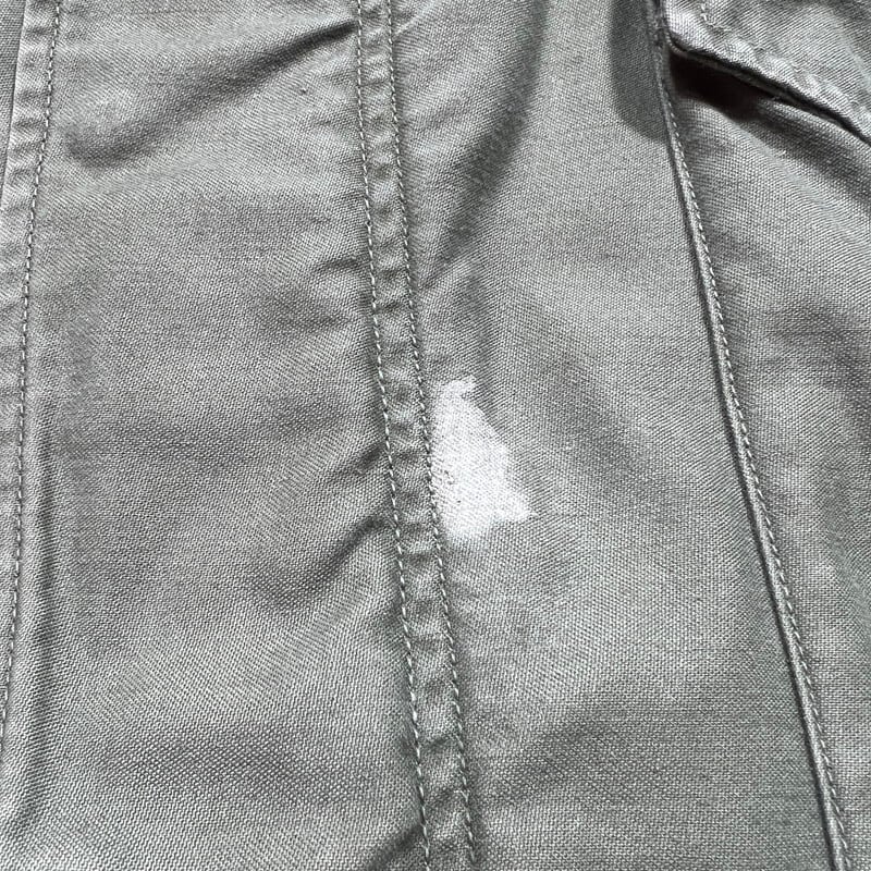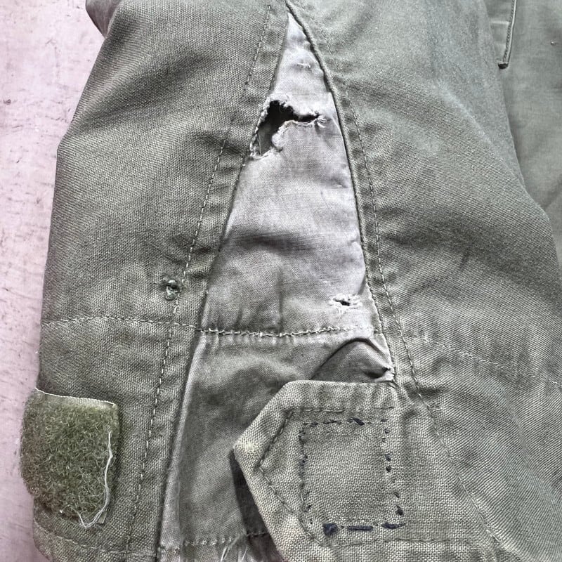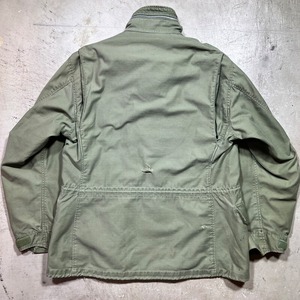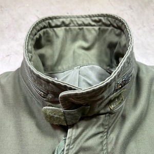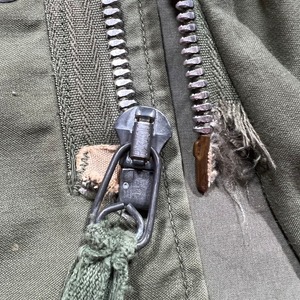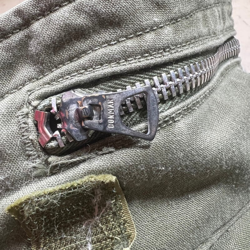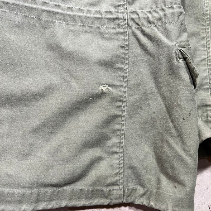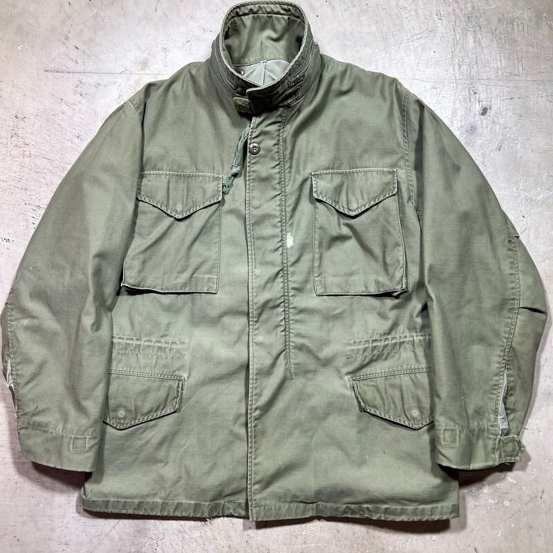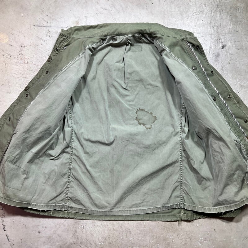 60年代のU.S.ARMY M-65フィールドジャケット1stモデルです。初期モデル特有のエポーレットが付かない仕様です。フロント、襟裏共にあCONMAR社のアルミジッパーが使用されています。タグが欠損していますのミルスペック等は不明です。全体的に使用感が有り、擦れやシミ等ございます。ジッパー付け根にダメージがありますが、ジッパーの開閉は可能です。右袖のマチ部分や、背面にダメージがございます。サイズはL相当でゆったりとした大きさです。ここ数年でM-65の1stモデルは人気も高まり以前に比べると見かけにくくなったように思います。エポーレット無しのこの1stモデルはお探しの方も多いと思いますので、この機会にいかがでしょうか。