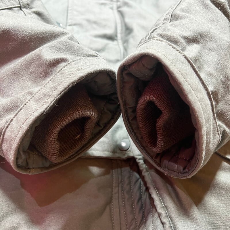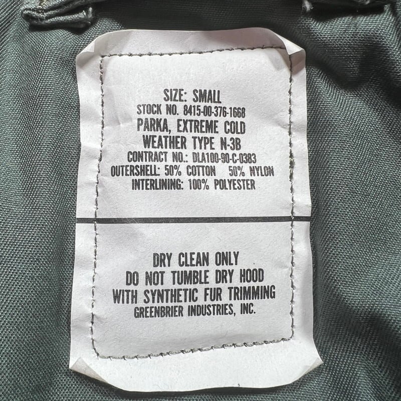 90年代のUSAF N-3Bフライトジャケットです。コントラクターはGREENBRIER INDUSTRIES、ミルスペックはDLA100-90-C-0383。1990年コントラクトのこちらは、使用感の少ないミントコンディションです。恐らく水には通っていない思われ、アクリルファーもダマになっておりません。YKKジッパーが使用されています。使用感は少なく非常に状態の良い個体ですが、背中全面に変色が見られます。前オーナー様にお伺いしたところ、箱入りのデッドストックで所有していたそうですが、長期保管で段ボールが劣化してしまい、そのシミが付いてしまったとの事です。その他は先述の通り使用感も少なく素晴らしいコンディションです。N-3Bではお探しの方も多いSMALLサイズです。年式は比較的浅いですが、デッドストックに近い個体はなかなか出ないと思います。まだまだ気温も低いのでヘヴィーアウターをお探しだった方は是非この機会にいかがでしょうか。
