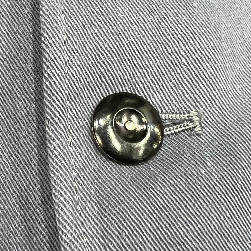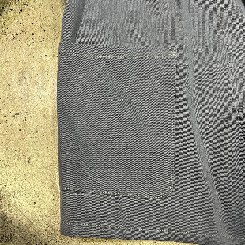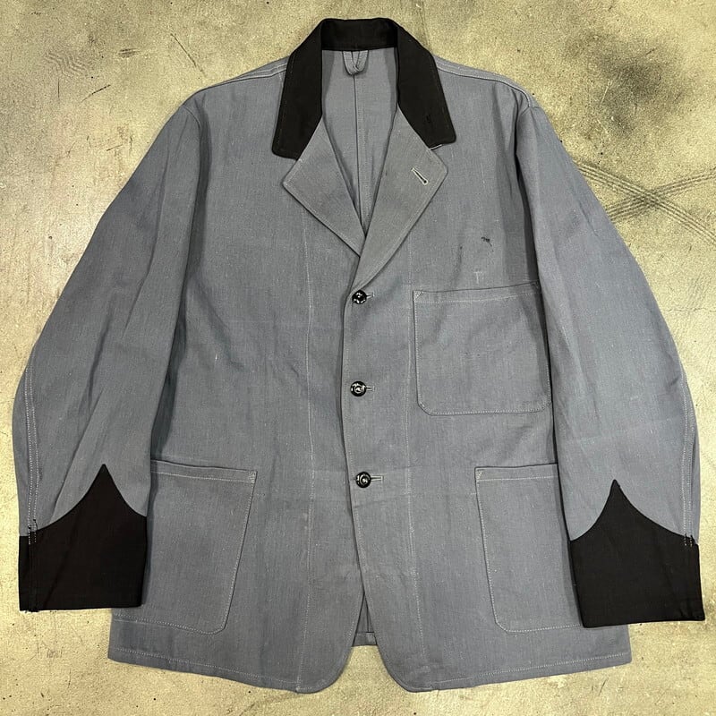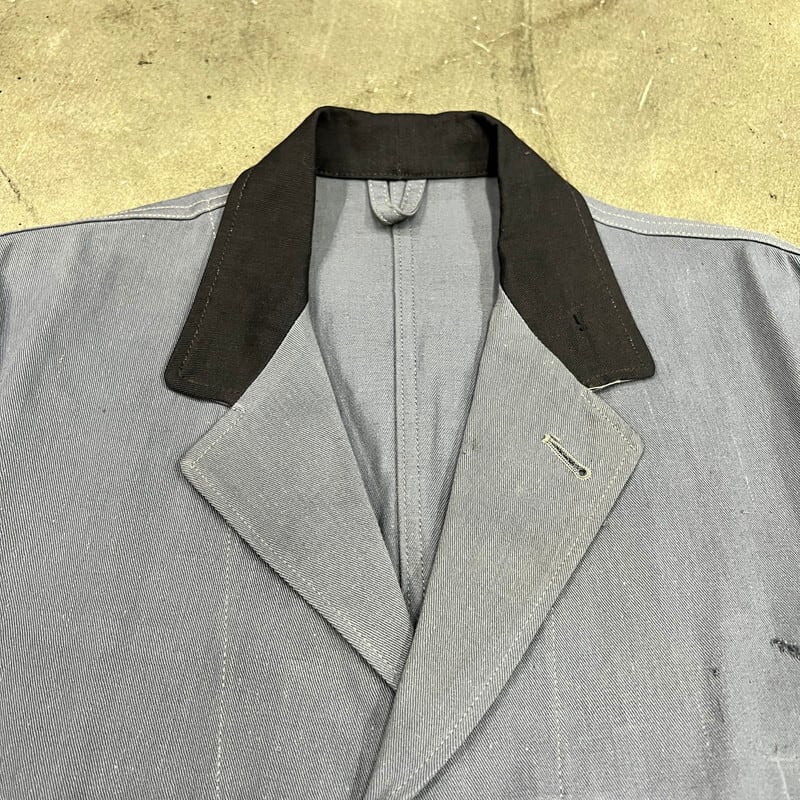 50年代から60年代頃のドライバーズジャケットです。胸元のワッペンが欠損していますので、確証はございませんが、恐らくBRITISH RAILWAYのワッペンが付いていたと思われ、イギリス国鉄で使用されていたジャケットだと思われます、襟と袖先がブラックで、ボタンは全てチェンジボタンです。タグは欠損していますので、製造メーカーは不明です。同じタイプのジャケットで40年代頃の物もあるようですが、ご紹介するこちらは縫製の感じなどから後年のモデルなのかなという印象です。胸元のワッペンが取り除かれた跡に若干ダメージがございます。その他擦れ等の使用感はございますが、状態は良好な個体だと思います。厚手では無いので春先に使い易いアイテムです。イギリスのワークウェアがお好きな方は是非この機会にいかがでしょうか。入荷の少ないアイテムでおすすめです。