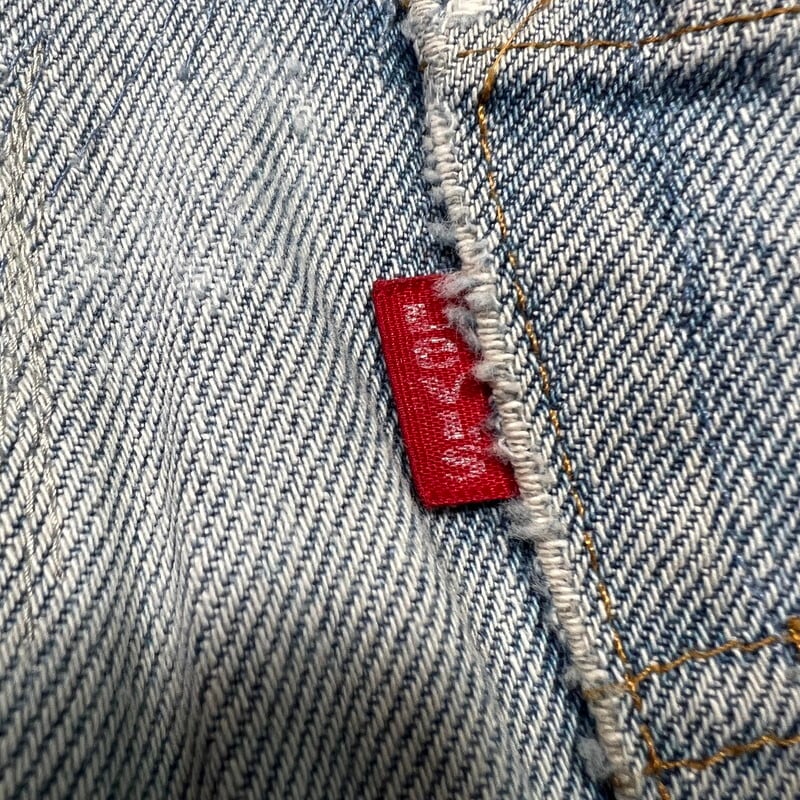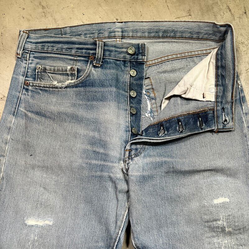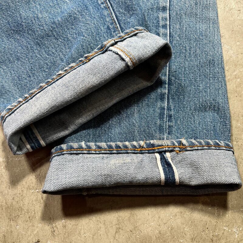 80年代のLevi's501赤耳モデルです。66後期以降でセルヴィッジが使われた最後のモデルで、以前はレギュラー扱いされていることが多かったですが、最近では立派なヴィンテージとして人気が高くなってきています。刻印524、縮率10%、閂ブラック、内股シングル、赤耳、赤タブ。色残りは3割程で、両足、股、お尻付近にリペアが多数ございます。ポケット縁に擦れによるダメージもございます。薄い色落ちながら良い雰囲気の個体で、ウエストも実寸でW33~34とゴールデンサイズです。両腿のリペアは補強程度ですので、しっかりと直せば長く着用していただけると思います。ペンキを飛ばしたりしてもかなりカッコ良いと思います。ダメージやリペアはございますが、やはりセルヴィッジがある事で、ロールアップスタイルも楽しめますので春から夏にかけて大活躍してくれます。リペア等を楽しめる方にはかなりオススメな1本です。
