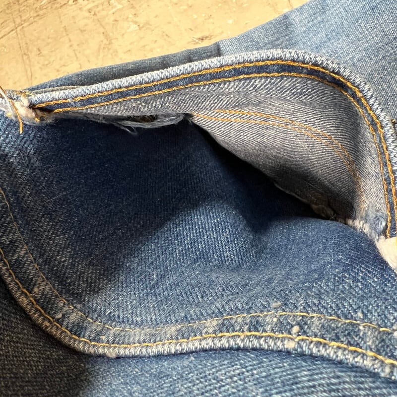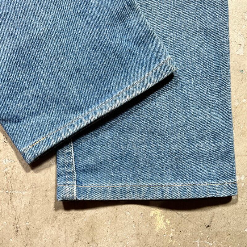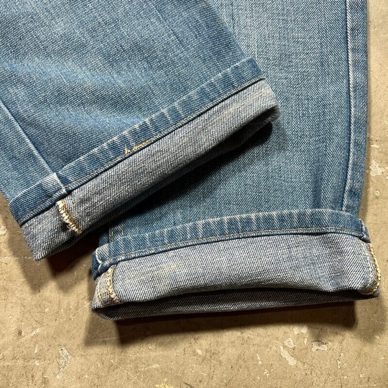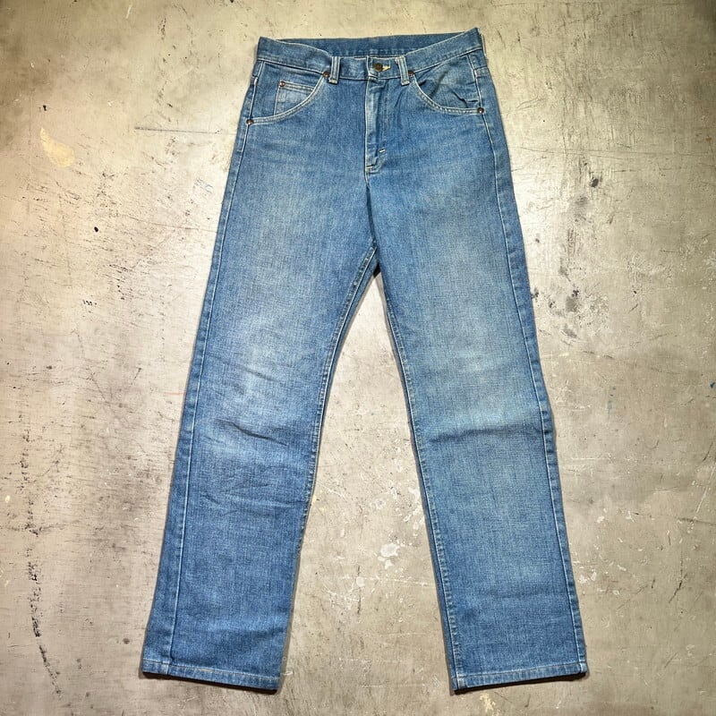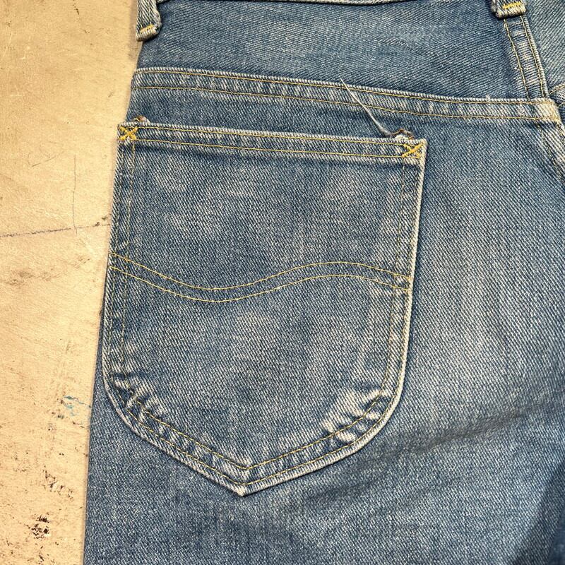 70年代頃のLee 200-0041デニムパンツです。1972年に101から200番へと変更になったモデルです。フロントは42TALONジッパーが使用されており、内側に紙タグが付きます。革パッチには®、MR表記が入ります。色残りは3割程でのっぺりとした色落ちですが、穿き込めば縦落ちもまだまだ楽しめると思います。裾上げの有無は不明ですが、シングルステッチです。バックポケットに色むら等ございますが、特筆するダメージは無くリペアもございません。ウエストは実寸でW30インチですので、男女共に穿きやすいサイズ感だとおもいます。綺麗なストレートシルエットですのでお好きな方も多いのでは無いでしょうか。ヴィンテージデニムの評価が高まる中、この辺りはまだ気兼ねなく着用していただけると思いますので、お探しだった方は是非この機会にいかがでしょうか。