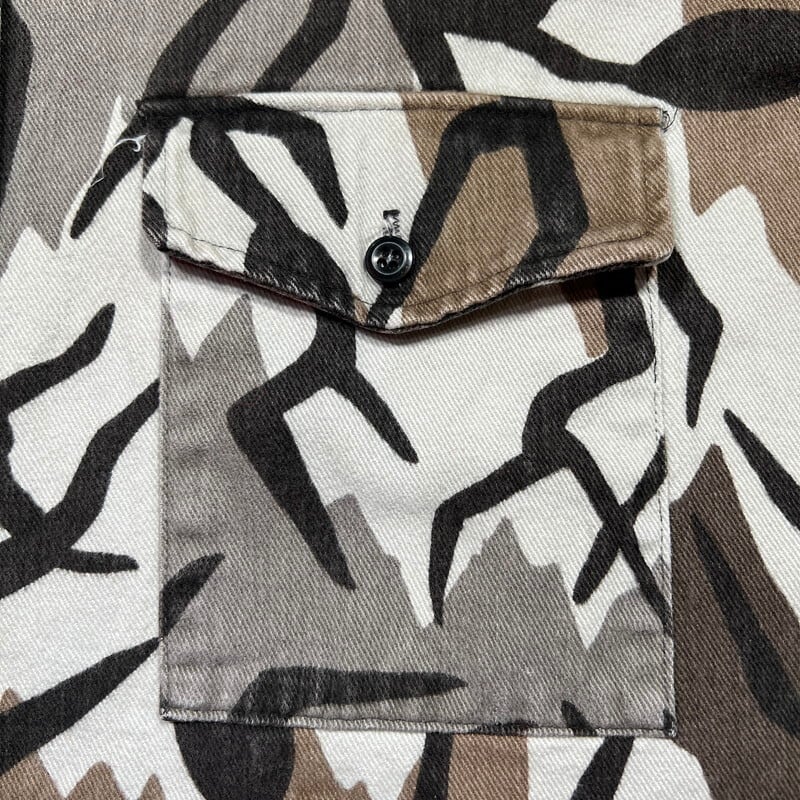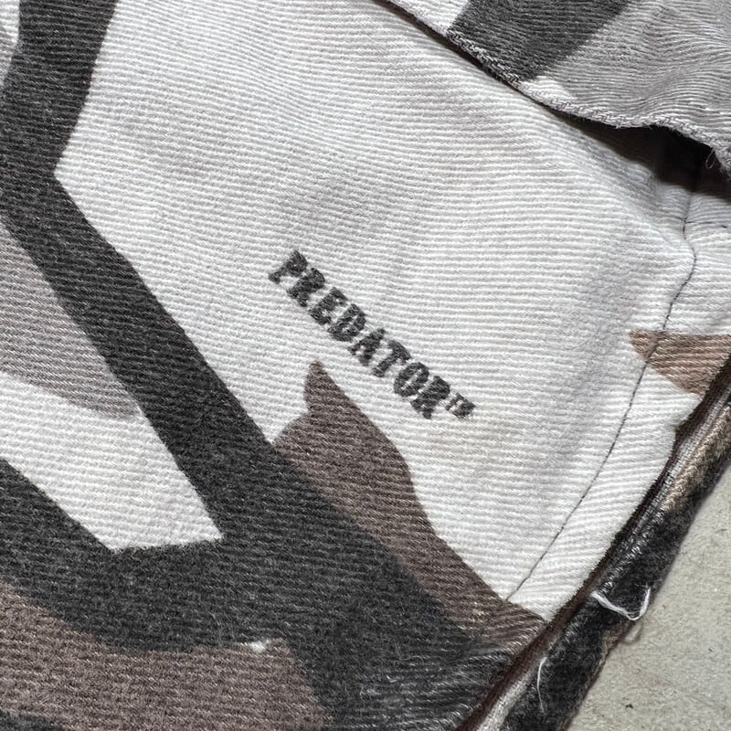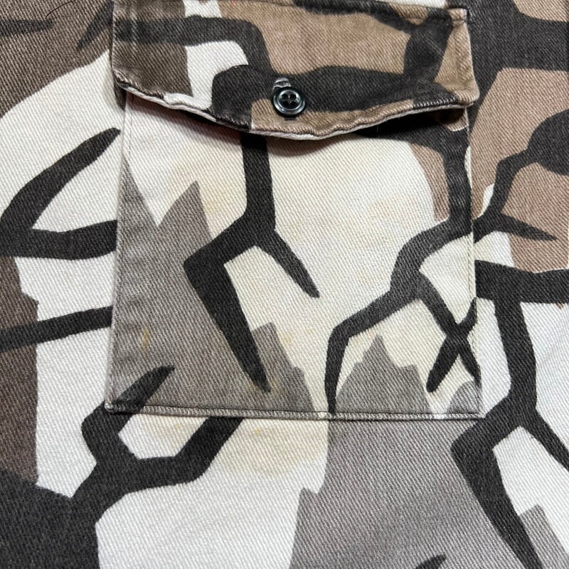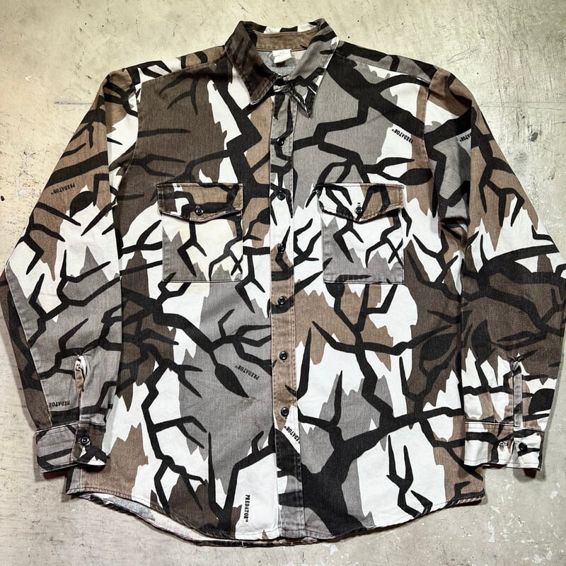 80年代から90年代頃のPREDATOR CAMOUFLAGEのカモフラージュシャツです。1988年に採用された迷彩柄で、ハンティングのシーンごとにいくつかのパターンが今も作り続けられたいます。ご紹介するこちらはフォールグレーというグレーベースの1着です。厚手でしっかりとしたコットンツイル地です。胸ポケットはホームベース型では無くスクエア型です。第3ボタンが付け替えられています。全体的に使用感があり、色褪せや薄汚れ等ございます。ダメージは特にございませんので、コンディションは良好かと思います。サイズ表記はLARGEでほどよくゆったりとしていながらも着丈が長すぎるといった事は無く良いサイズ感です。有名な老舗アウトドアブランドもこのプレデターカモを使ったアイテムを多数製造していたので、当時も注目されていたのかもしれません。現在ではストリートブランドがサンプリングしていた事で認知も高くなり、お探しの方も多いかと思います。タウンユースからアウトドアまで幅広くお使いいただけます。