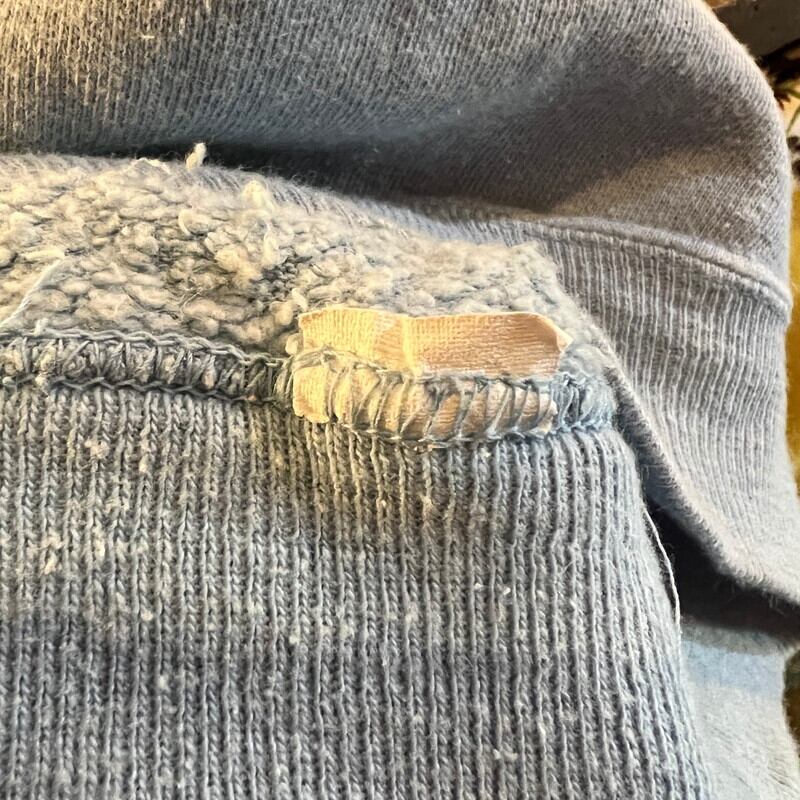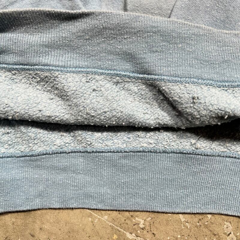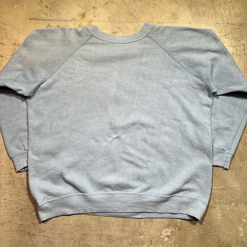 60年代頃のラグランスウェットです。紙タグが裾についておりますが、カットされていますので、ボディの製造ブランド等は不明です。淡いサックスブルーでフロントにはインディアンヘッドのプリントが3段で入ります。プリントの歪みも良い雰囲気です。ネックと裾は2本針、袖先は内縫い、ショルダーや袖は4本針です。脇下はガゼット付き。全体的に使用感があり、色褪せや毛羽立ちが見られます。右袖リブにハンドリペア、左袖に小穴がございます。身幅が60cm以上あり、ヴィンテージスウェットとしてはかなり大きい個体だと思います。着丈はやや短めですが、生地はまだまだ柔らかくスチームで幾分伸ばせそうです。インディアンヘッドのプリントが入るヴィンテージスウェットも年々見つかりづらくなってきていますので、大き目なサイズでお探しだった方は是非この機会にいかがでしょうか。
