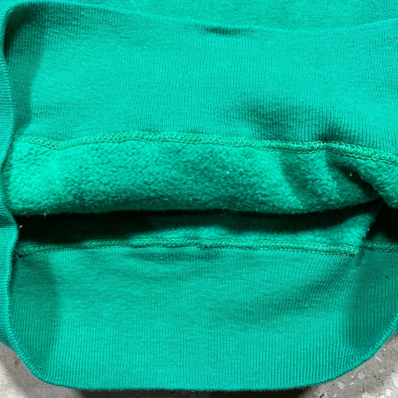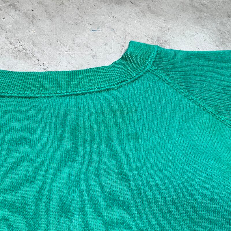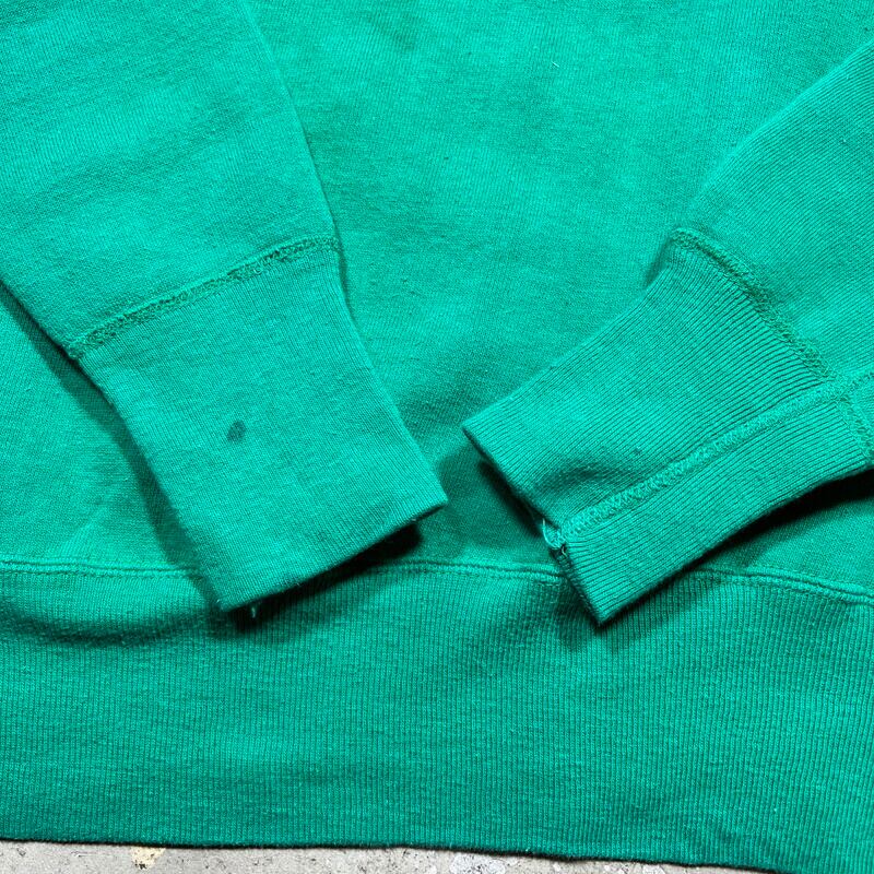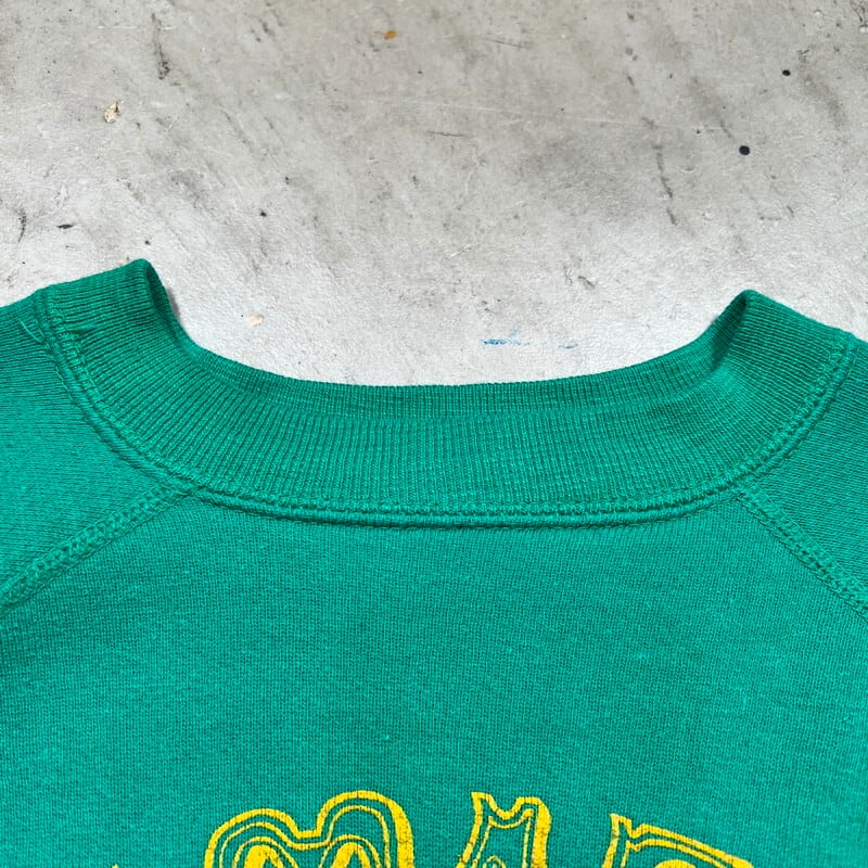 50年代から60年代頃のカレッジスウェットです。タグ欠損の為ブランドは不明です。ネック、裾は2本針、その他はズべ手4本針で縫製されています。脇下はガゼット仕様です。発色の良いグリーンボディにイエローのプリントが入ります。元々はフロッキープリントの様ですが、フロッキー部分はほとんど残っていません。プリントの歪みが絶妙です。リブは9.5cmと長めです。多少毛羽立ちはありますが、若干の色褪せや、右脇に小穴がございます。袖に薄汚れはございますが、総合的に見てもコンディションの良い個体だと思います。この年代辺りのスウェットとしてはサイズも大き目でL~XL相当はあります。この色の組み合わせのスウェットもなかなか見かけなくなったので、明るい色味のスウェットをお探しだった方は是非この機会にいかがでしょうか。