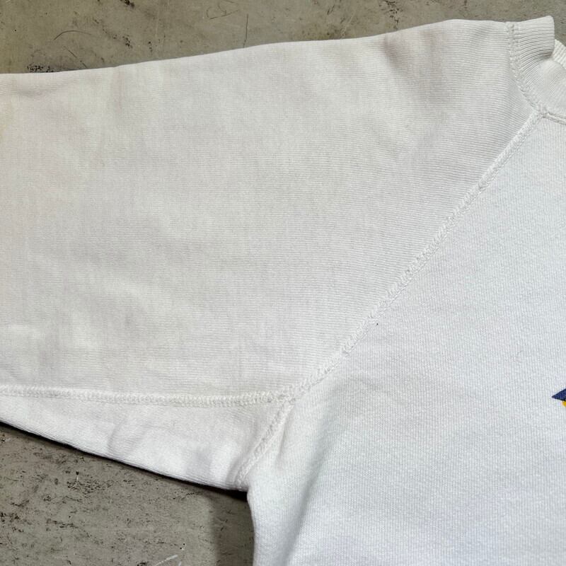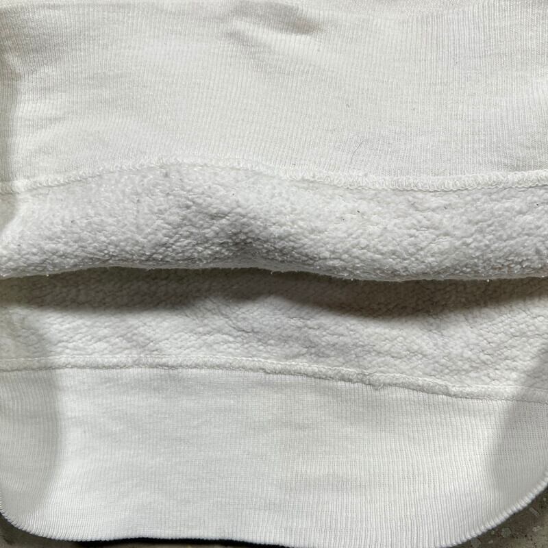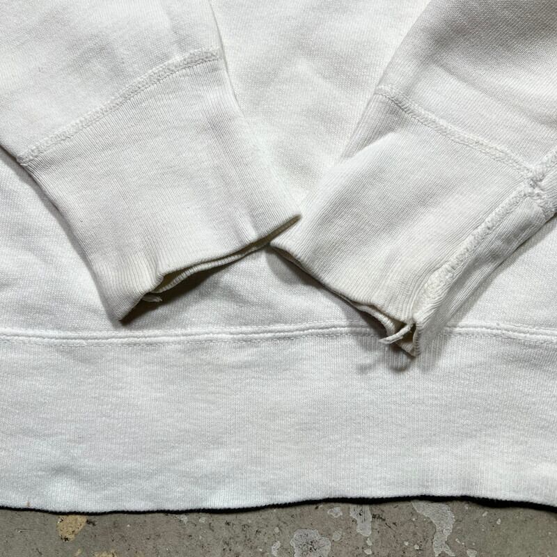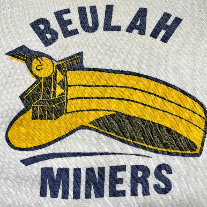 50年代頃のカレッジスウェットです。タグ欠損の為製造ブランドは不明です。ネックと裾は2本針、その他は全て4本針で縫製されています。脇下にはガゼットが付く仕様です。フロントにはBEULAH HIGH SCHOOLのクラブチームが使用するBEULAH MINERSのプリントが染み込みで3段入ります。MINERSのこの炭鉱夫が被るヘルメットのアイコンは主に1950年代から1960年代初頭頃に使用されていたようです。全体的に使用感がありプリントはやや褪色しています。プリント部分や袖、背面にピンホールや小さなダメージが見られます。薄いシミ等もございます。こちらもヴィンテージスウェットとしては比較的大き目でM~L相当はあるかと思います。単色の染み込み物に比べ、多色刷りは少ないと思いますので、お探しだった方は是非この機会にいかがでしょうか。とても雰囲気の良い1着です。