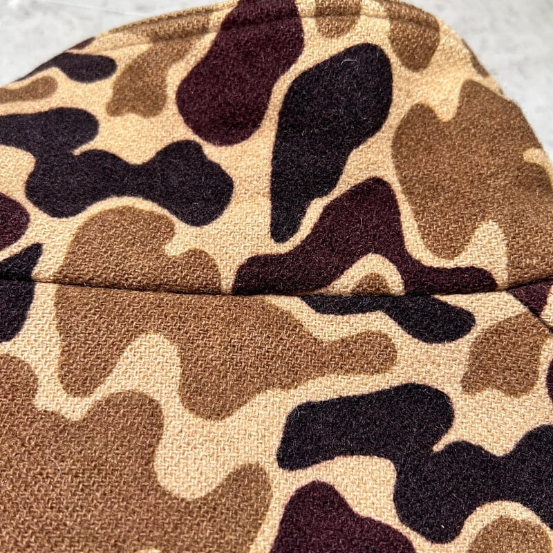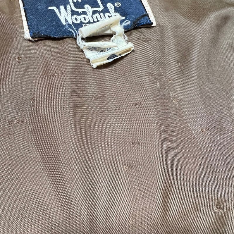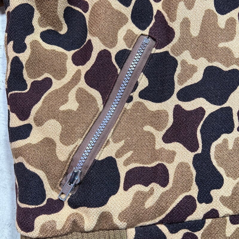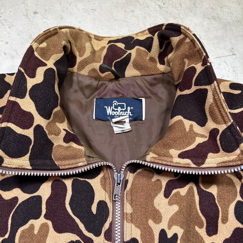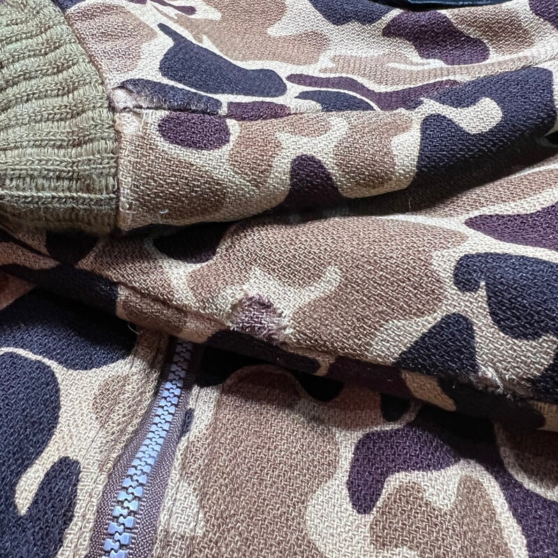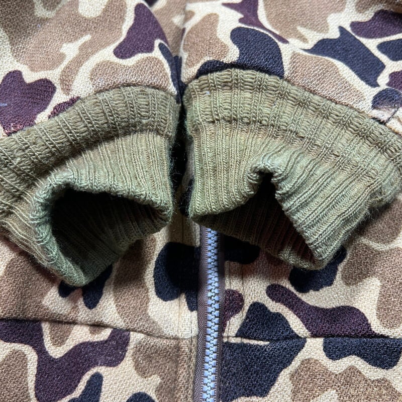 80年代頃のWoolrichダックハンターカモジップアップジャケットです。ご紹介するこちらの商品は、首元にウールリッチの紺タグが付きますが実はその紺タグの下にはL.L.BEAN社のタグが縫い付けられています(社名が入る中央部分は切り取られています)。元々ウールリッチがL.L.BEANの商品をOEMで製造しており、L.L.BEANへ納入したアイテムとなりますが、なんらかの理由で在庫が返却された商品に自社のタグを貼り付けて流通させていたようです。ブラウンベースのダックハンターにカーキのリブのバランスが良く、肘にはスエードのエルボーパッチが縫い付けられています。袖の縫い目に破れがいくつかございます。ライニングにも細かい引っ掻きのようなダメージがいくつかございます。ジッパーは上から16cmの所まではスムーズに開閉できるのですが、一番上まで占めると開閉は可能ですが、噛み合わせが良くない為開いてきます。サイズ表記は薄れていますがXLです。身幅が広くゆったりとしていますが、着丈は短めですっきりとしています。ヘヴィーアウターでは無いので春先の羽織りに丁度良いと思います。