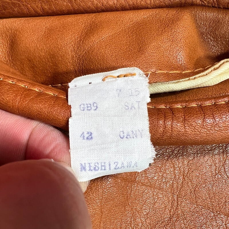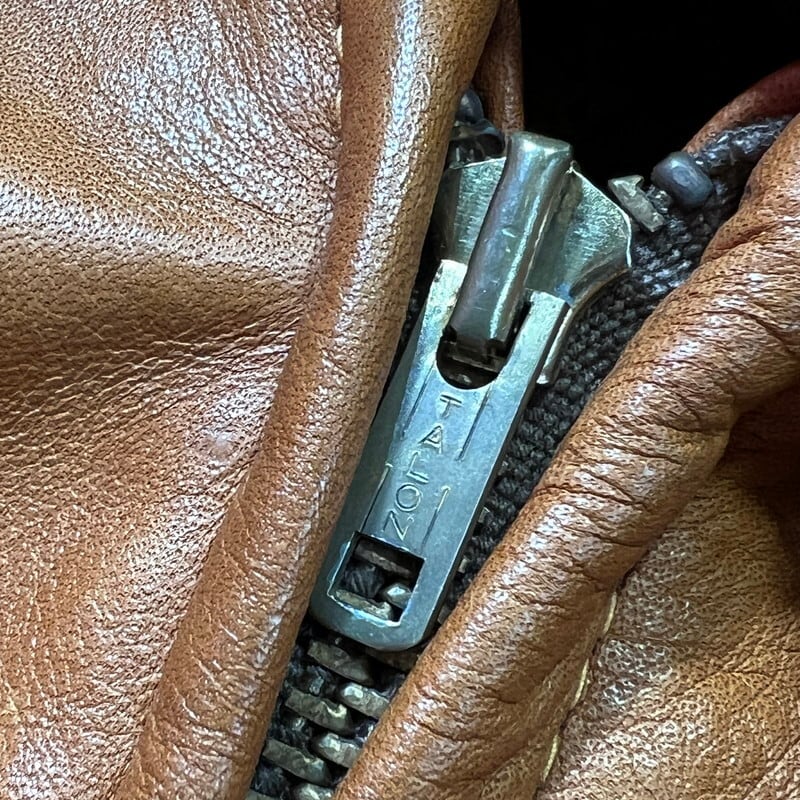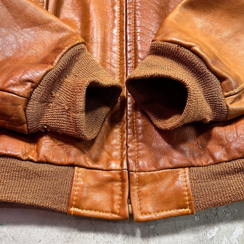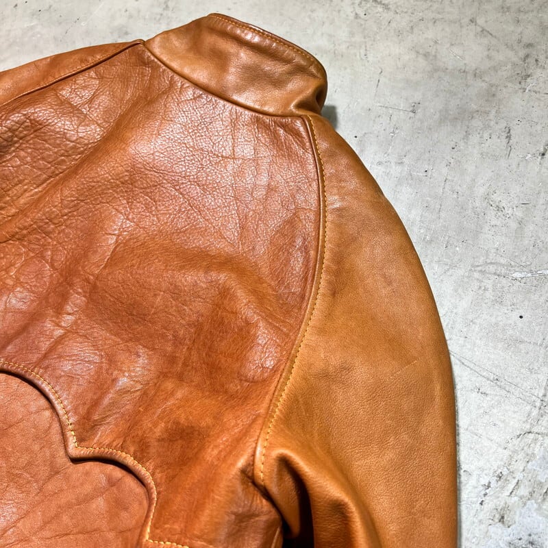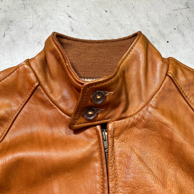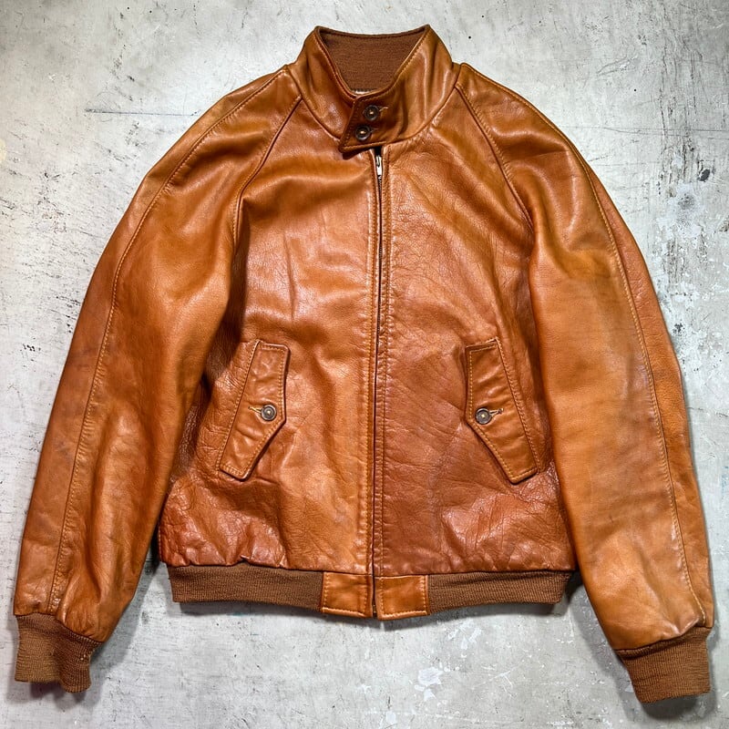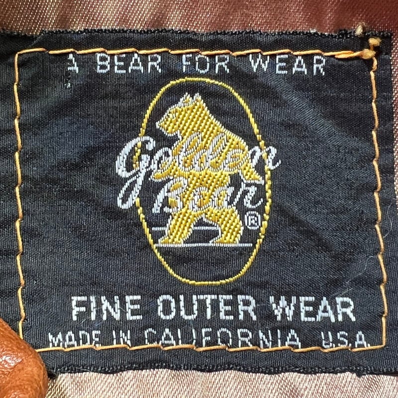 60年代頃のGolden Bear レザーハリントンジャケットです。1922年にサンフランシスコで創業し港湾労働者の為のコート等を製造していたブランドです。現在ではアワードジャケットが有名なブランドです。ご紹介するこちらは、黒タグ付くモデルで、裏地はチェックでは無いものの形はハリントンジャケットそのものです。レザーはとても柔らかくしなやかです。フロントはブラスのTALONジッパーが使用されています。背面のヨークデザインが素敵です。肩から袖にかけて若干にヤケが見られますがオイルメンテで幾分目立たなくなると思います。袖と裾のリブにいくつか虫食いによるダメージがございます。ライニングは綺麗でダメージや汚れはございません。サイズ表記は42で良い大きさです。オイルメンテナンスをしながら着用すればエイジングも楽しめますのでお勧めです。