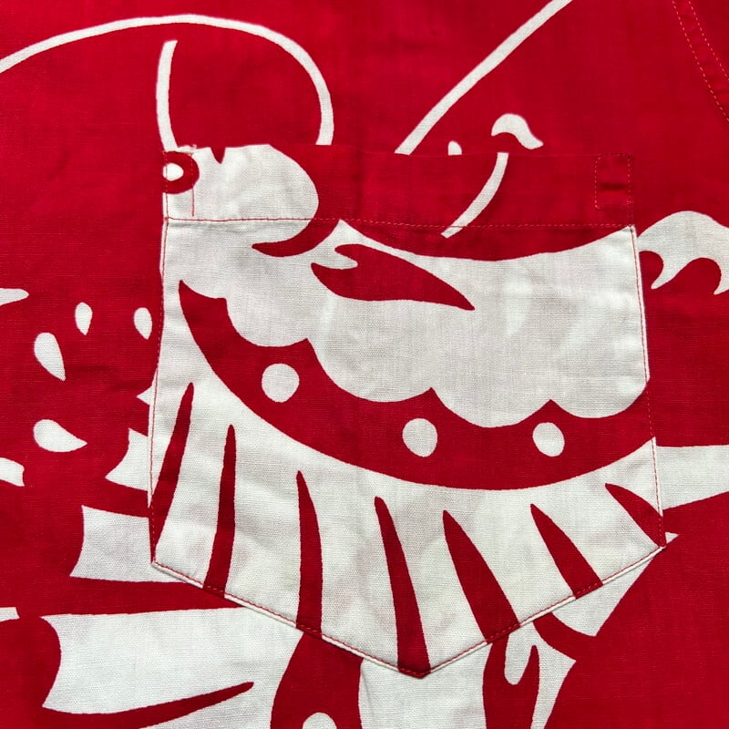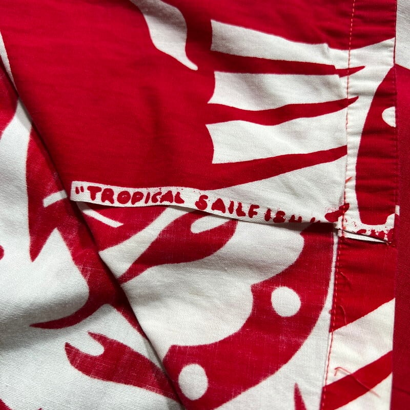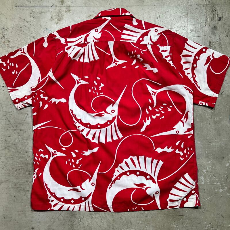 50年代頃のLINN'S HAWAIIAN SPORTSWEARコットンハワイアンシャツです。LINN'Sは、アロハシャツが普及し始めた黎明期には存在していたブランドのようですが、創業年等の詳細は不明です。ご紹介するこちらは、コットン生地を用いたシャツで、大判なTROPICAL SAILFISH(バショウカジキ)柄が全面に施されたオールオーバーパターンです。ココナッツボタンが使用されています。サイズ図表記はございませんがLサイズ相当のボックスシルエットで。需要の高いサイズ感だと思います。前面に1箇所背面に小さなピンホールが2箇所ございますが、さほど気にならないかと思います。古い年代のコットンハワイアンシャツはお探しの方も多いのではないでしょうか。年代を考慮するとかなりコンディションが良いのでお勧めです。