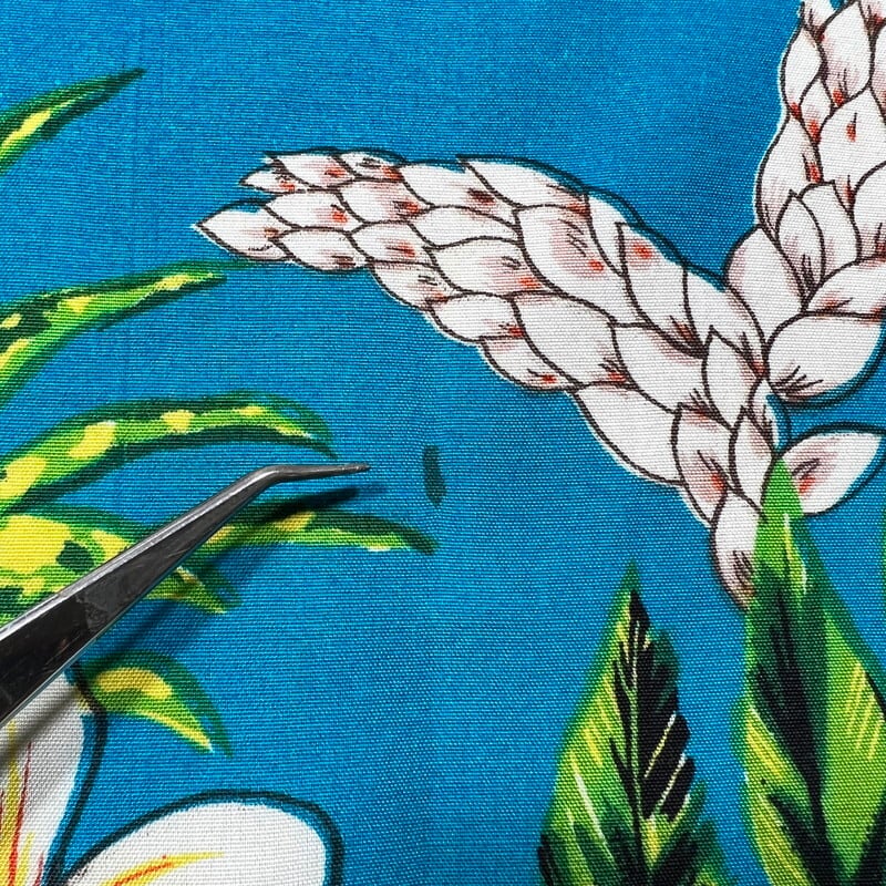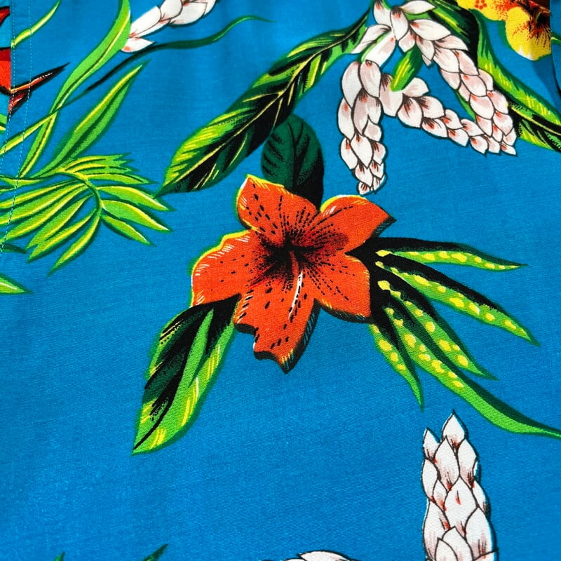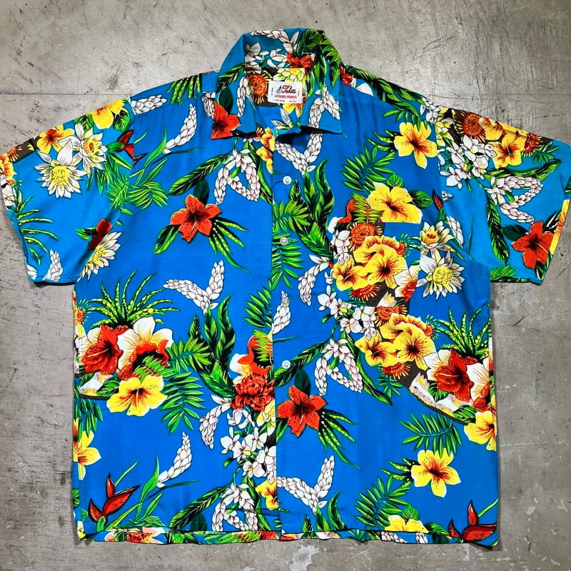 60年代頃のTahitiレーヨンハワイアンシャツです。1つ前にご紹介したハワイアンシャツと同じRN14848表記で、日本製造された1着です。襟芯が入りループボタンのオープンカラー仕様です。鮮やかなブルーに南国の花々がプリントされたデザインです。背面に小さなシミがございますが、こちらのシャツも使用感は少なく大変コンディションの良い個体です。Tahitiとタグに入る事からタヒチ等のポリネシアの島々で販売されていたのかもしれません。色味がとても綺麗なので真夏にお勧めな1着です。Lサイズ表記で綺麗なボックスシルエットです。明るめなデザインのハワイアンシャツをお探しの方は是非いかがでしょうか。