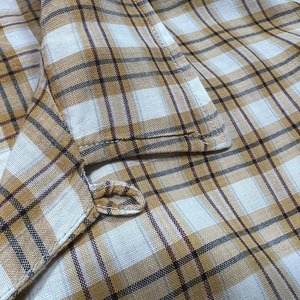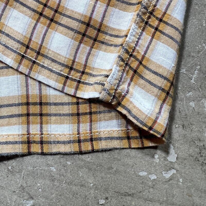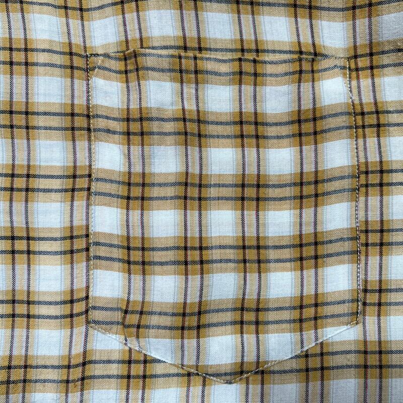 60年代頃のWearever Shirts Co コットンオープンカラーシャツです。こちらのWeareverは1945年にニューヨークで創業したブランドです。マスタードとブラック細かいレッドで構成されたチェック柄がレトロな雰囲気を醸し出しています。襟芯が入り、トップはループボタン仕様です。全体的にやや色あせはありますが、ダメージは無く良好です。Lサイズ表記でこちらも綺麗なボックスシルエットです。スタプレの様なスラックス系のボトムスとの相性が良いので、足元にはローファー等を合わせてみても良いと思います。チェック柄のシャツは定番ではありますが、どこか懐かしさのある落ち着いたカラーリングが秀逸ですので、気になる方は是非いかがでしょうか。