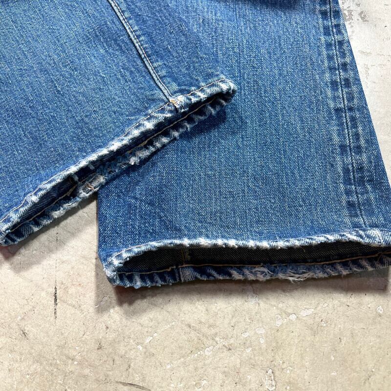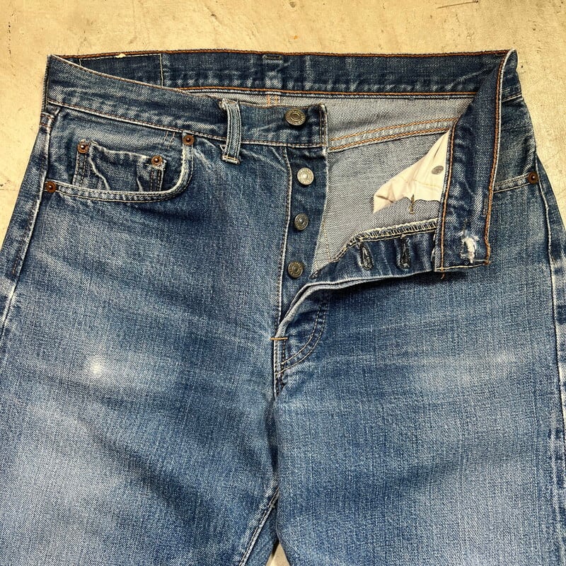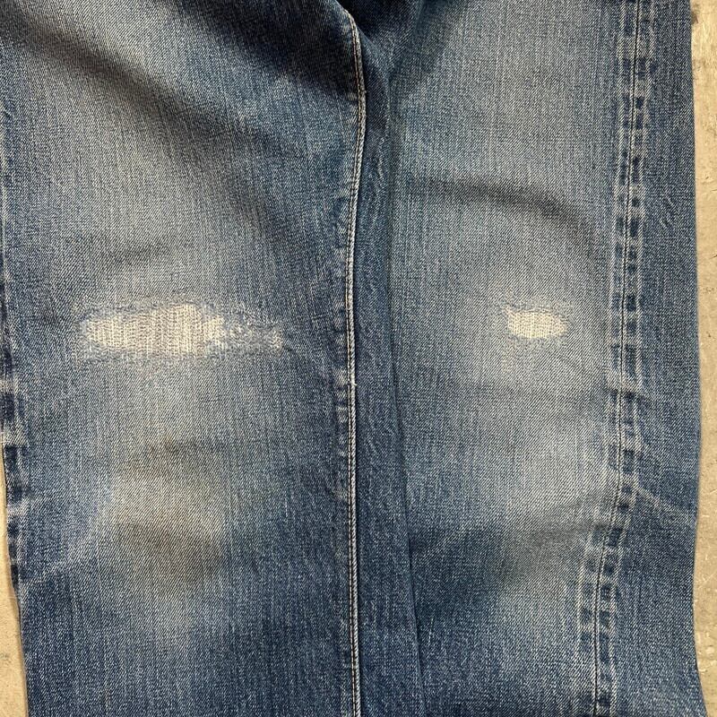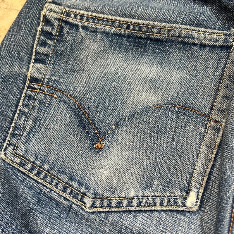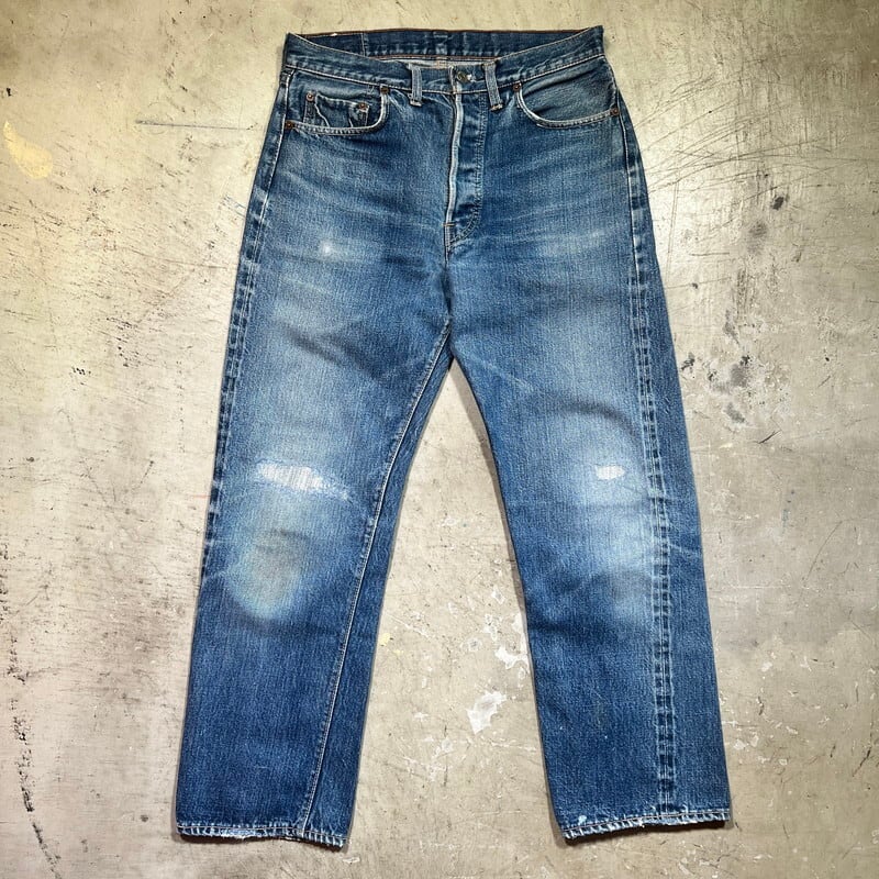 60年代から70年代頃のLEVI'S 501デニムパンツです。平行ステッチ、トップ裏刻印4、足長R、アウトシーム裏両面シングル、赤タブBig E、不均等V。色残りは4割程で、うっすらとヒゲが確認できます。右腿と両膝にリペアが施され、スレーキにもダメージ箇所に当て布が貼り付けられています。股の付け根と裾には擦れによる細かなダメージが見られます。紙パッチの大部分は欠損しております。リペアは綺麗に施されていますので問題なく着用していただけます。アウトシームには背ヴィッジのアタリがしっかと出ており、雰囲気の良い個体です。ウエスト実寸はW31インチ位ですので男女共に穿きやすいサイズ感だと思います。これからの季節に使い易い色味で、白Teeにキャンバススニーカーだけでも充分かっこ良く合わせていただけます。是非この機会にいかがでしょうか。