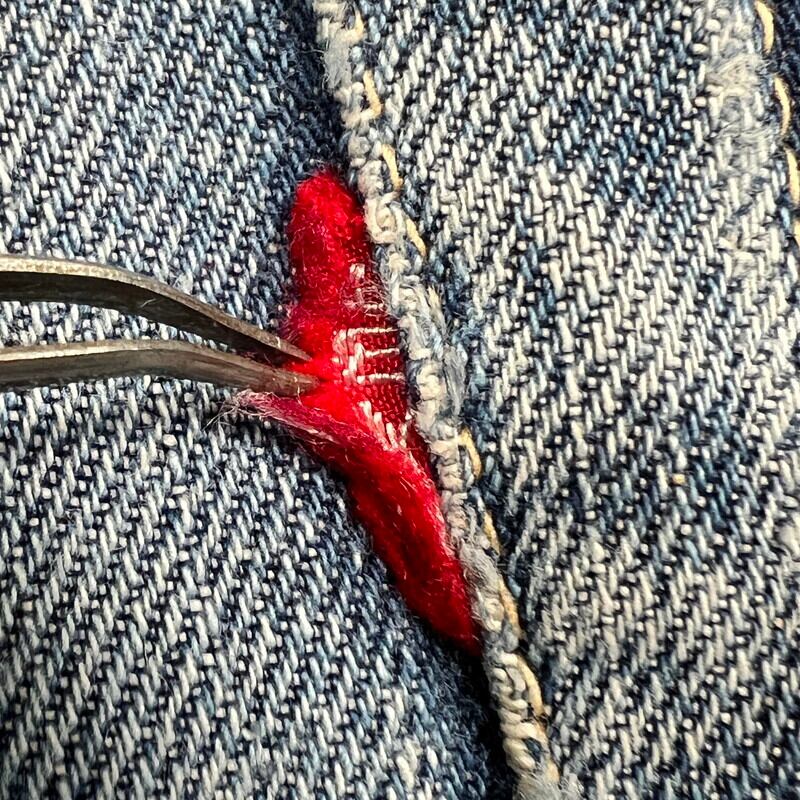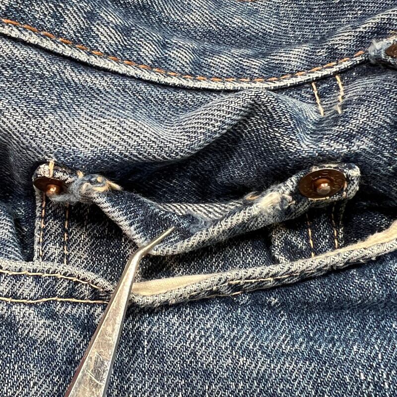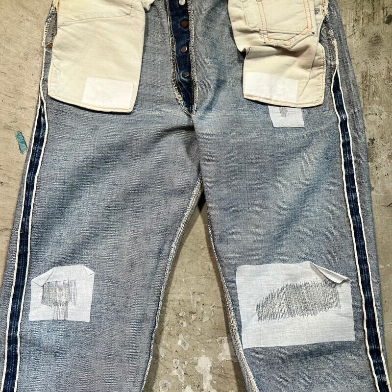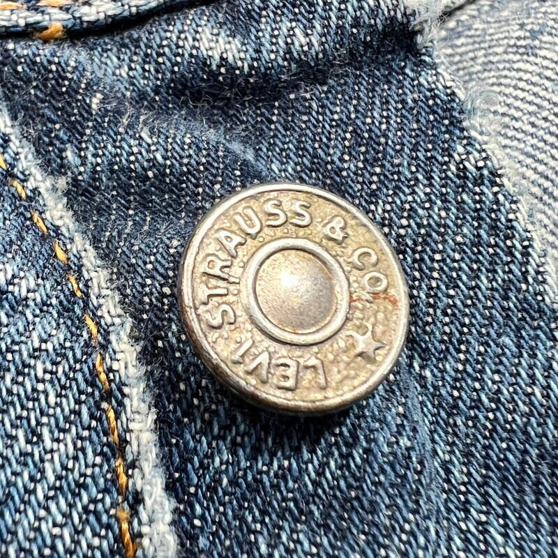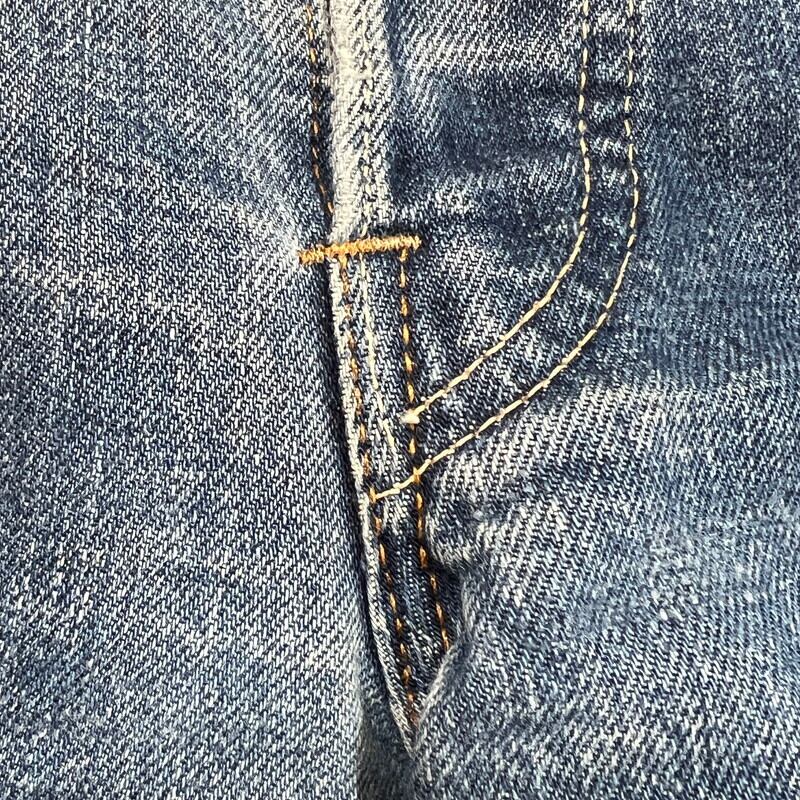 60年代から70年代頃のLEVI'S 501デニムパンツです。平行ステッチ、トップ裏刻印4、足長R、アウトシーム裏両面シングル、赤タブBig E、不均等V。色残りは4割程で、うっすらとヒゲが確認できます。右腿と両膝にリペアが施され、スレーキにもダメージ箇所に当て布が貼り付けられています。股の付け根と裾には擦れによる細かなダメージが見られます。紙パッチの大部分は欠損しております。リペアは綺麗に施されていますので問題なく着用していただけます。アウトシームには背ヴィッジのアタリがしっかと出ており、雰囲気の良い個体です。ウエスト実寸はW31インチ位ですので男女共に穿きやすいサイズ感だと思います。これからの季節に使い易い色味で、白Teeにキャンバススニーカーだけでも充分かっこ良く合わせていただけます。是非この機会にいかがでしょうか。