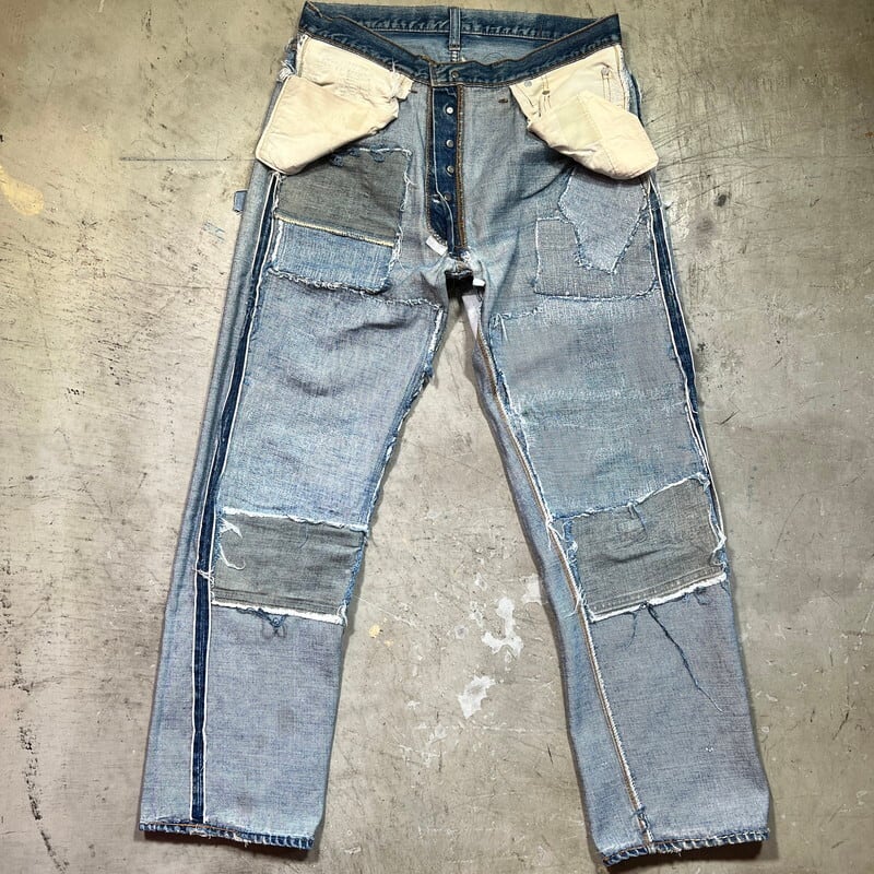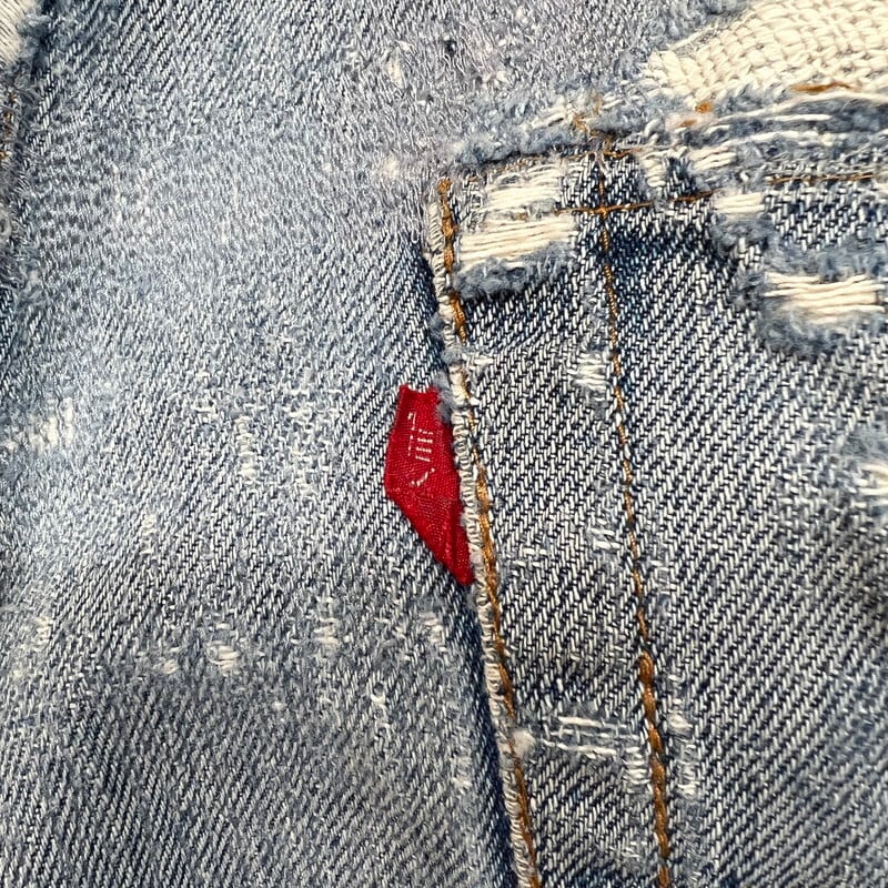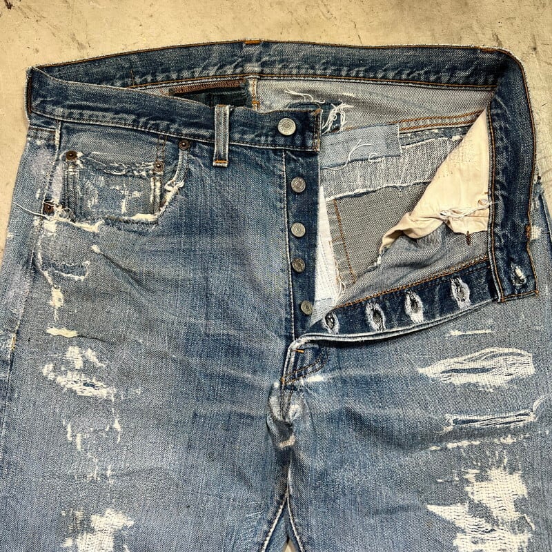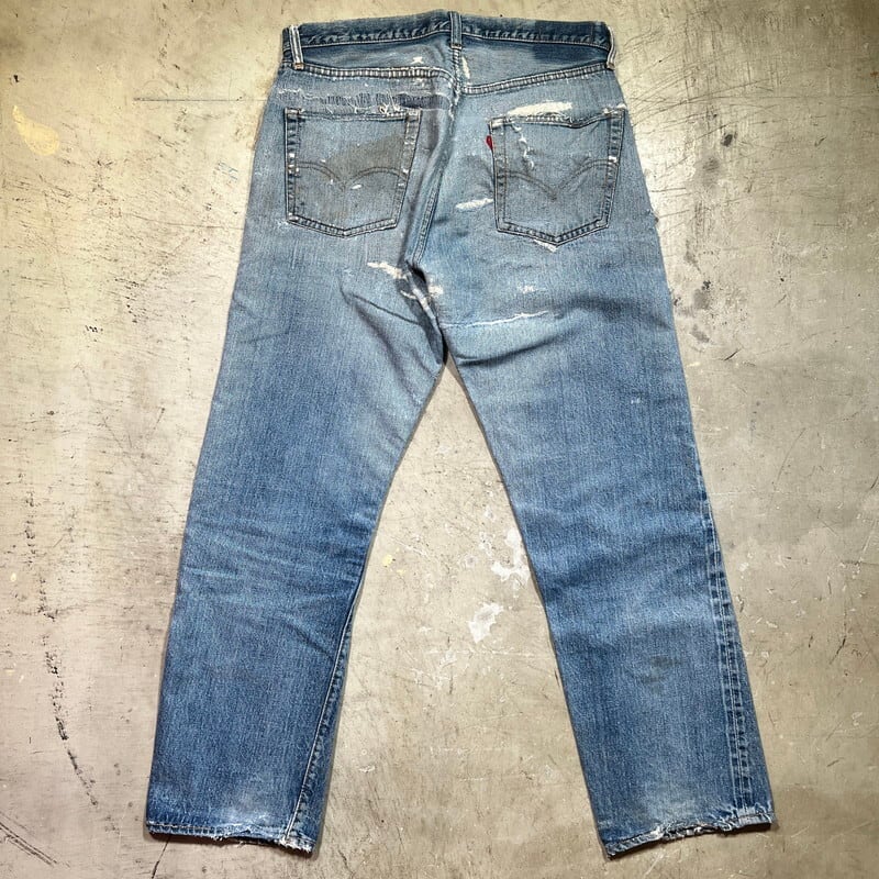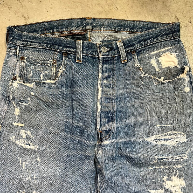 70年代頃のLEVI'S 501デニムです。トップ裏刻印6、通常R、アウトシーム裏シングル+チェーン、赤タブBig E。ビッグEからスモールeへと変わる過渡期のモデルと思われます。前面にリペアが施された非常にグランジ感の強いデニムです。ポケット縁や裾にはダメージもございます。スレーキにボックス型のスタンプが押されていたような形跡はありますがほぼ消えています。かなりジャンクな雰囲気ですが、ダメージ箇所はほとんどリペアが施されていますので着用に問題は無いかと思います。ヴィンテージデニムでここまでリペアが施されている個体は意外と見つかりづらいのではないでしょうか。ウエストは実寸でW35インチと程よくゆったりしていますので、サイズ需要は高いと思います。グランジ系のダメージデニム等がお好きな方にお勧めしたい1本です。カートコバーンの様にジャックパーセルを合わせてラフに合わせてみるのもカッコ良いのではないでしょうか。