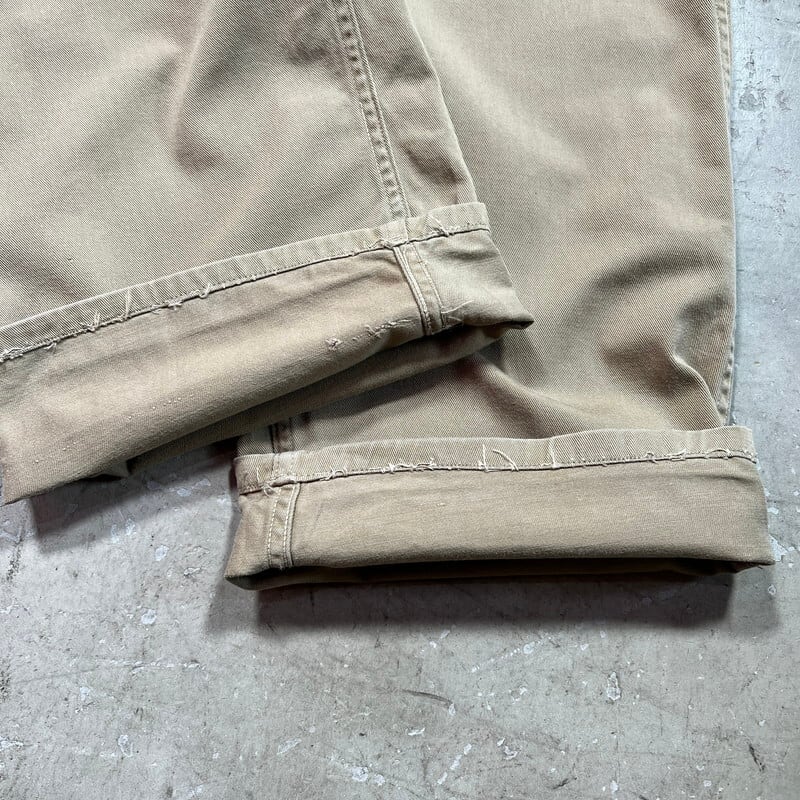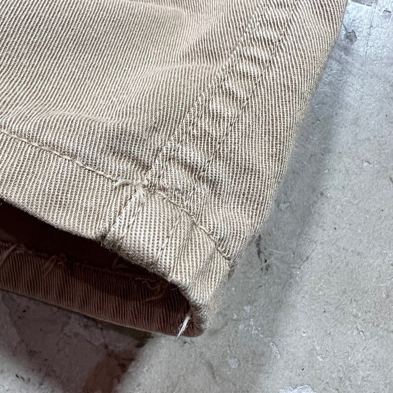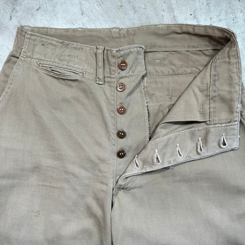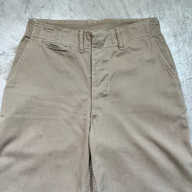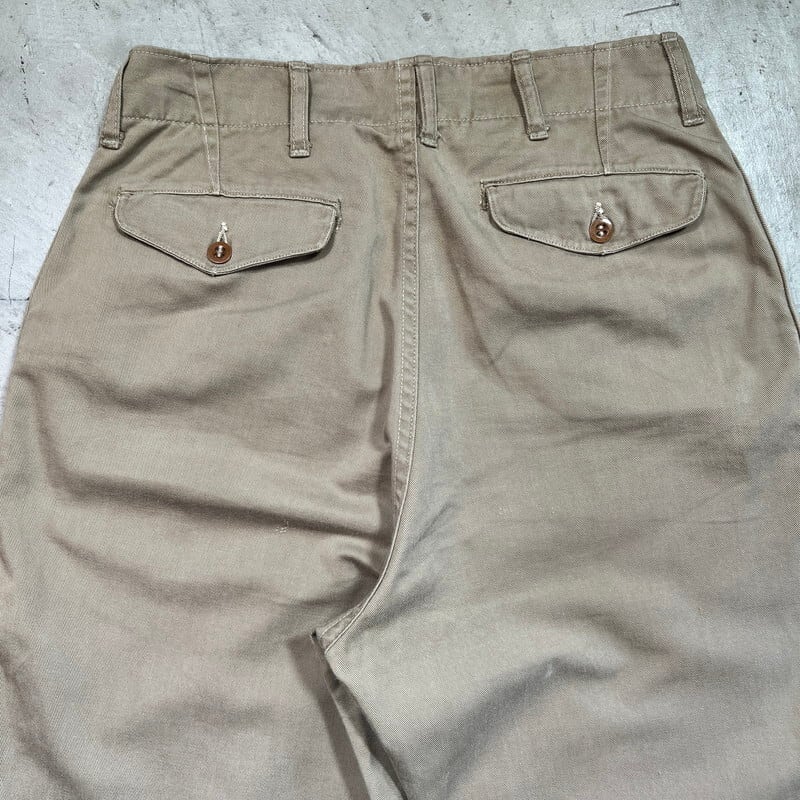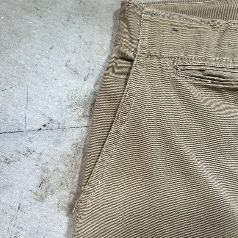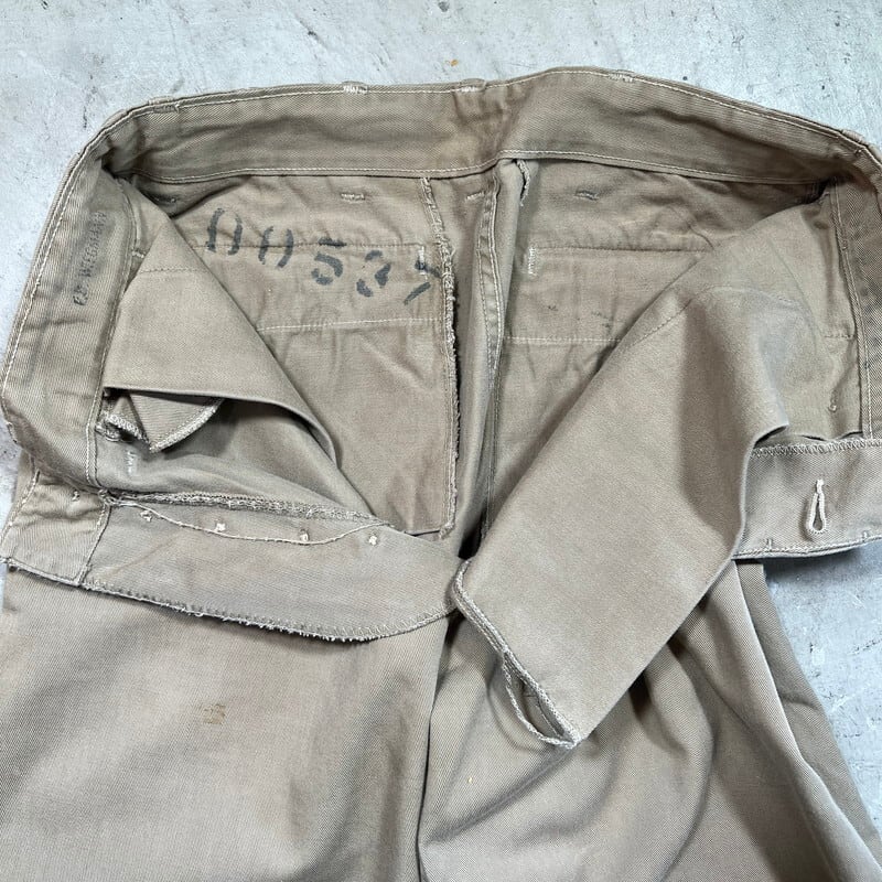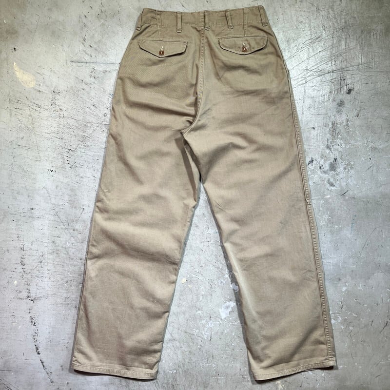40年代頃のUSMCミリタリーチノトラウザーズです。ミルスペックは欠損しています。バックポケットにフラップが付くタイプで、スレーキはボディと同じ共布が使用されています。コインポケットは両玉縁、アウトシームはこの年代に見られるダブルステッチ。ボタンはフロントの2個以外はオリジナルで、全て隠れる比翼仕立てとなっています。内側にはステンシルが入っています。ほとんどテーパードが入らないゆったりとしたストレートシルエットです。薄汚れ等の使用感は多少あり、右裾付近に折り返し部分に若干ダメージがございます。年々古いミリタリーチノは見つかりづらくなり、ダブルステッチ仕様のモデルでUSMC物はお探しの方も多いのでは無いでしょうか。今回ご紹介したこちらは実寸W28とやや小さいサイズですが、細身な男性や女性でも穿きやすいかと思います。無地Teeをタックインしてデニムジャケットを羽織るとグッと雰囲気も出てカッコ良いと思います。サイズが合う方は是非この機会をお見逃しなく。