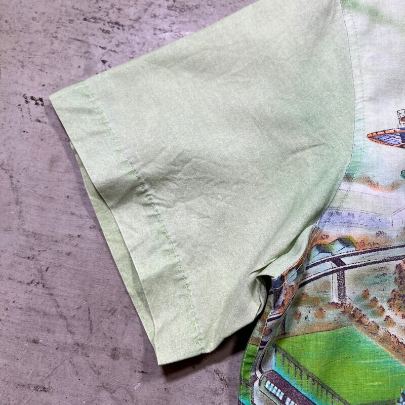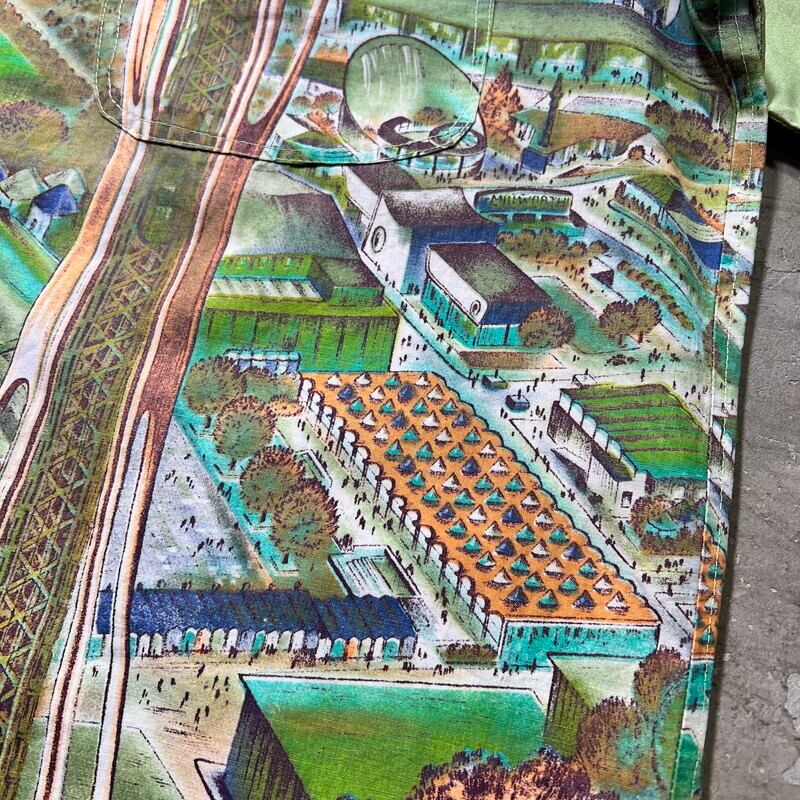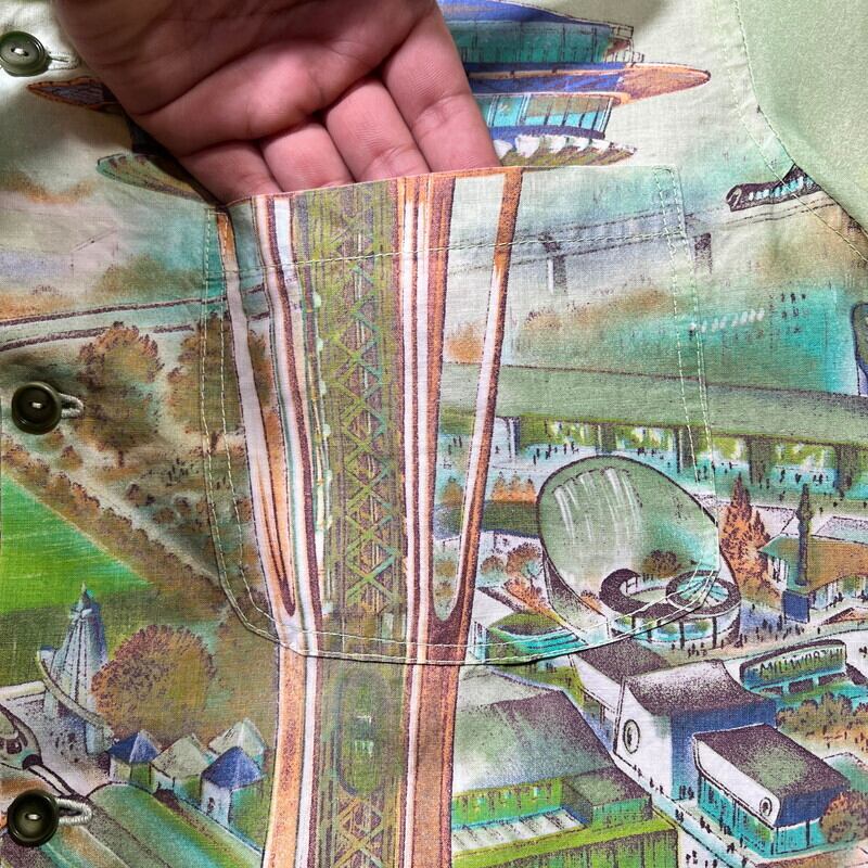 60年代頃のシアトル万国博覧会”COME TO FAIR"ファブリックオープンカラーシャツです。1962年アメリカのシアトルで開催された万国博覧会の際に販売されていたMILLWORTH社の ”COME TO FAIR”という名前のコットンファブリックを使用して作られたシャツです。「宇宙時代の人類」というテーマで開催され、万博のシンボルとなったSPACE NEEDLEと呼ばれる塔が目を惹くデザインです。ボタンはベークライトと思われ、左胸のポケットは柄合わせされています。丁寧に作られていますが、ステッチが一部歪んでいたりしますので、どこかのメーカーが作ったというよりはハンドメイドなのかもしれません。他h壮の使用感はございますが、目立つ汚れやダメージは無くコンディションは良好です。たぐが付いていませんが恐らくLサイズ相当かと思います。綺麗なボックスシルエットで夏に着やすいサイズ感です。この手のシャツはヴィンテージアロハシャツと比べてもなかなか出ないアイテムだと思いますので、EXPO関連がお好きな方は是非この機会にいかがでしょうか。