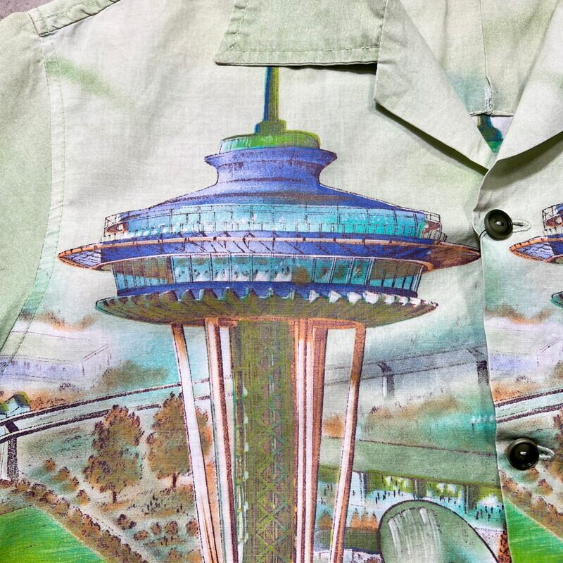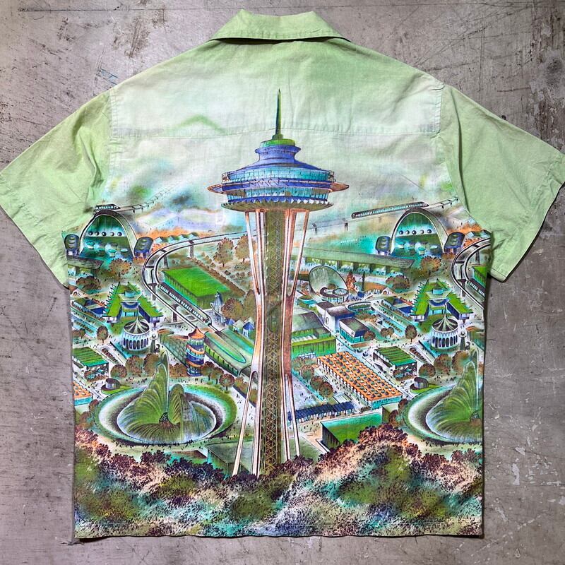60's~ Seattle World's Fair シアトル万国博覧会 1962 ”COME TO FAIR" ファブリックオープンカラーシャツ ハンドメイド スペースニードル レア L相当 希少 ヴィンテージ BA-2183 RM2602H