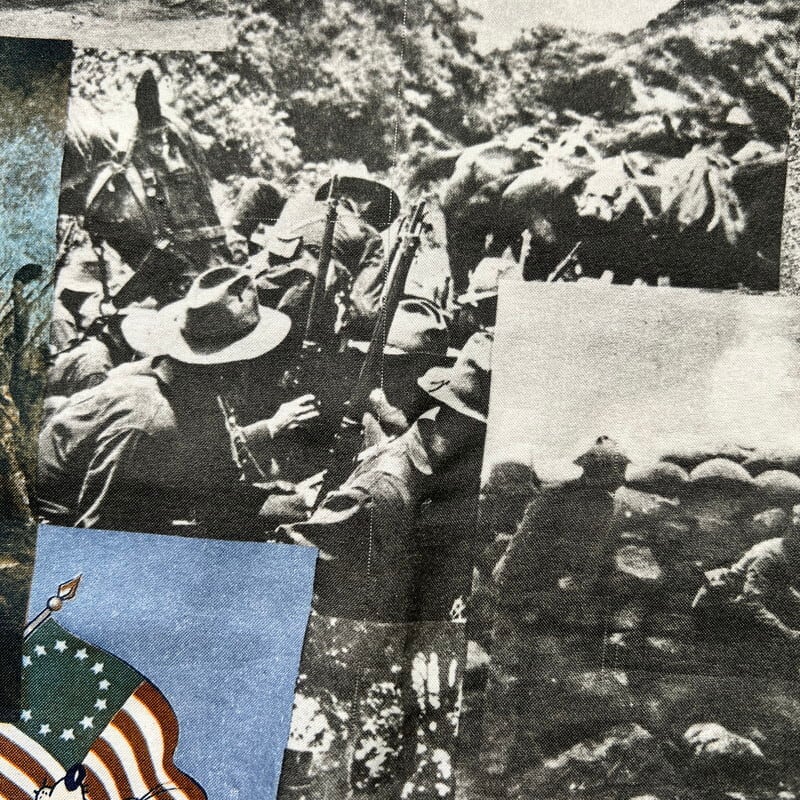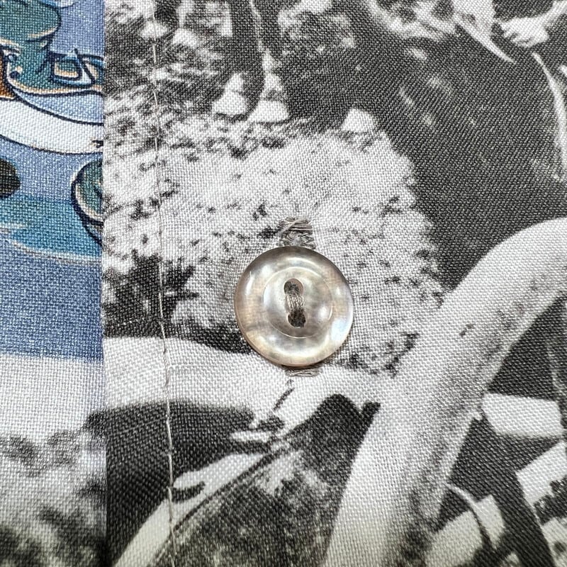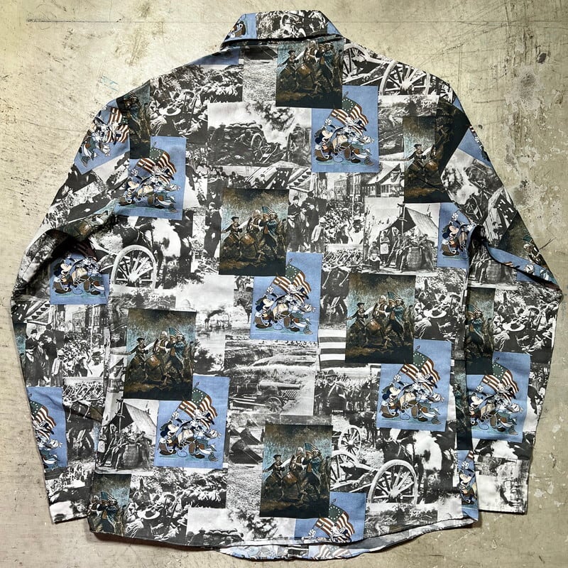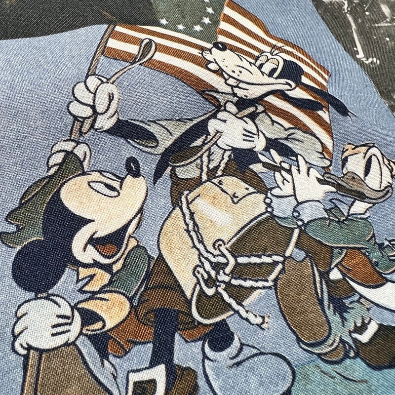 70年代頃のKENNINGTONポリエステルシャツです。KENNINGTONは1957年に創業したブランドで、眼鏡をかけた男性がタグに描かれているのも特徴的なブランドです。タグの印字が消えてしまっていますが、WALT DISENEY PRODUCTIONSのオフィシャルアイテムです。ご紹介するこちらのシャツには、独立戦争や西部開拓時代を彷彿とさせるフォトや独立記念日に良く歌われると言われる「Yankee Doodle」を演奏する人々、それをモチーフにしたディズニーキャラクター達が描かれたコラージュタイプのデザインです。70年代らしい長く大きな襟や、少しシェイプされたウエストなど時代を感じるシルエットです。素材はポリエステルで、さらっとした肌さわりです。多少の使用感はございますが、ダメージや汚れの少ないグッドコンディションです。実寸はLサイズ相当です。以前に入荷した魔法使いの弟子バージョンと同じシリーズだと思われますので、ミッキーシリーズがお好きな方は是非この機会にいかがでしょうか。