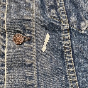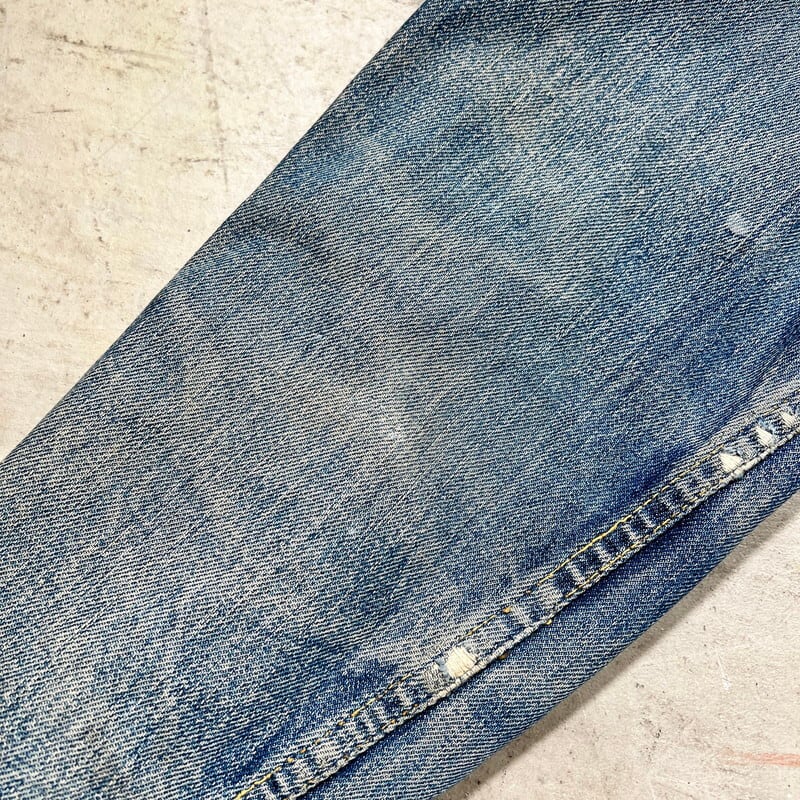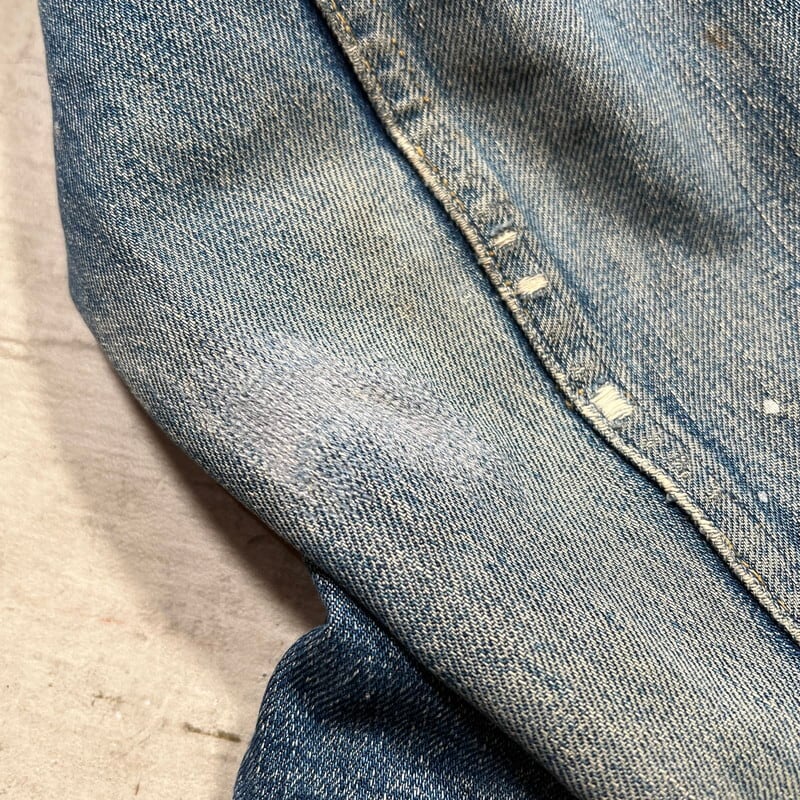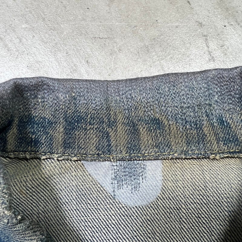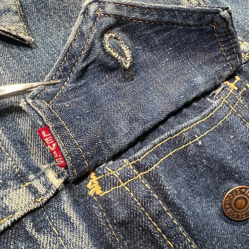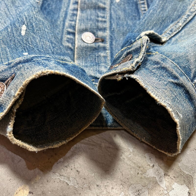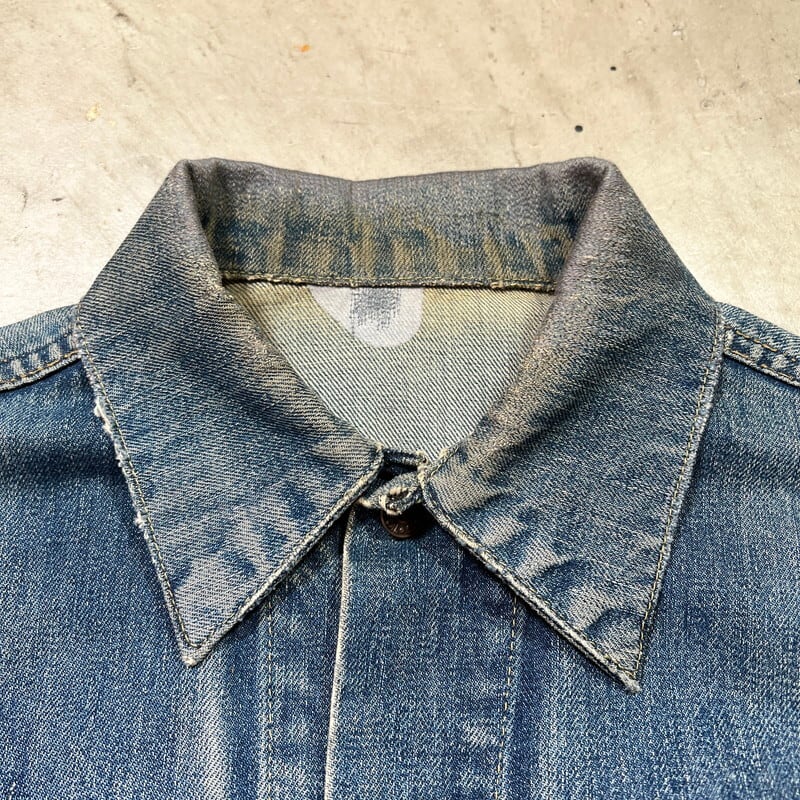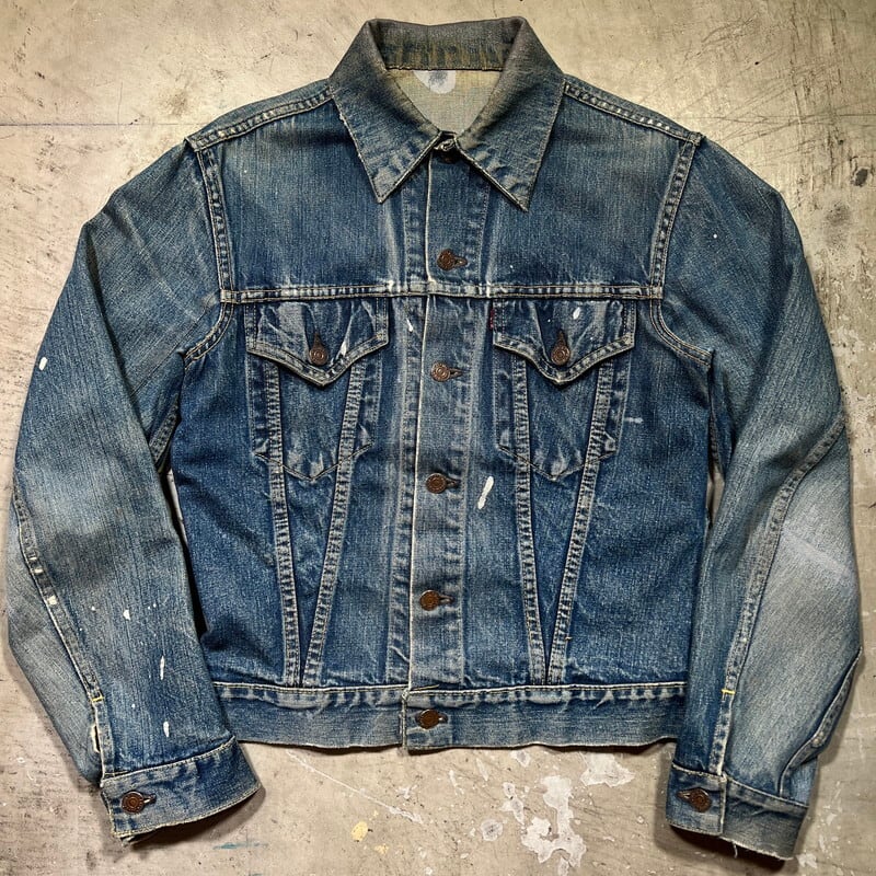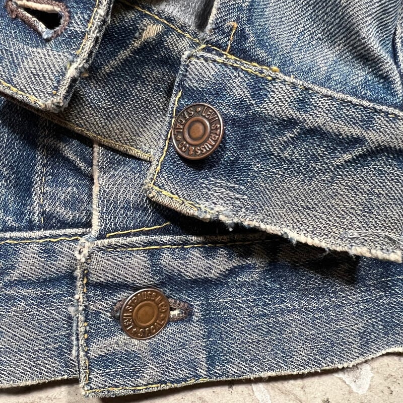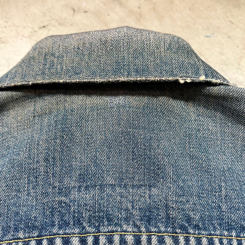 60年代のLEVI'S 557XXデニムトラッカージャケットです。ボタン裏17、フラップ裏ライトオンスデニム、閂オレンジイエローステッチ、赤タブBig E、均等V、カフス折り返しステッチあり。506XX(1st)、507XX(2nd)に続き3rdと呼ばれる個体で、後の70505の前身にあたるモデルです。パッチが欠損しておりますが、上記ディティールから3rdの初期頃のモデルだと思われます。襟や両袖にダメージがありましたのでリペアしていただきました。擦れ等細かなダメージはございますが、色の濃淡が良く出ており、とんだペンキやハチノスの雰囲気がとても良い1着です。他の個体でほぼ同じ実寸で、表記42のパッチが付く個体がいくつかありましたので、こちらの個体は恐らく42表記の物が縮んだものだと思われます。リペアこそございますが、557XXの初期モデルはなかなか出ませんので、お探しだった方は是非この機会にいかがでしょうか。