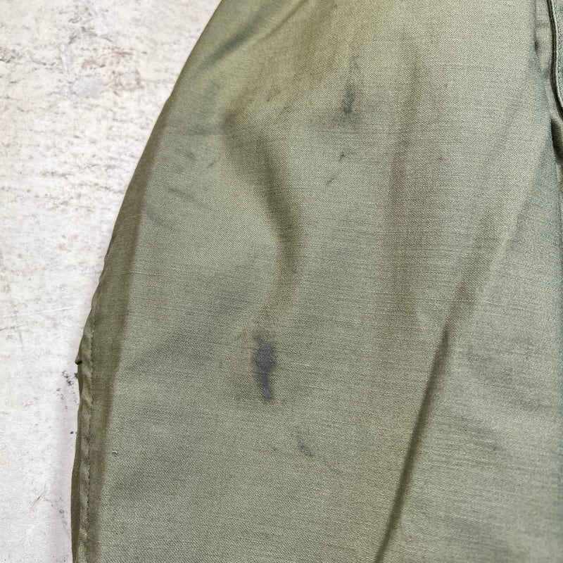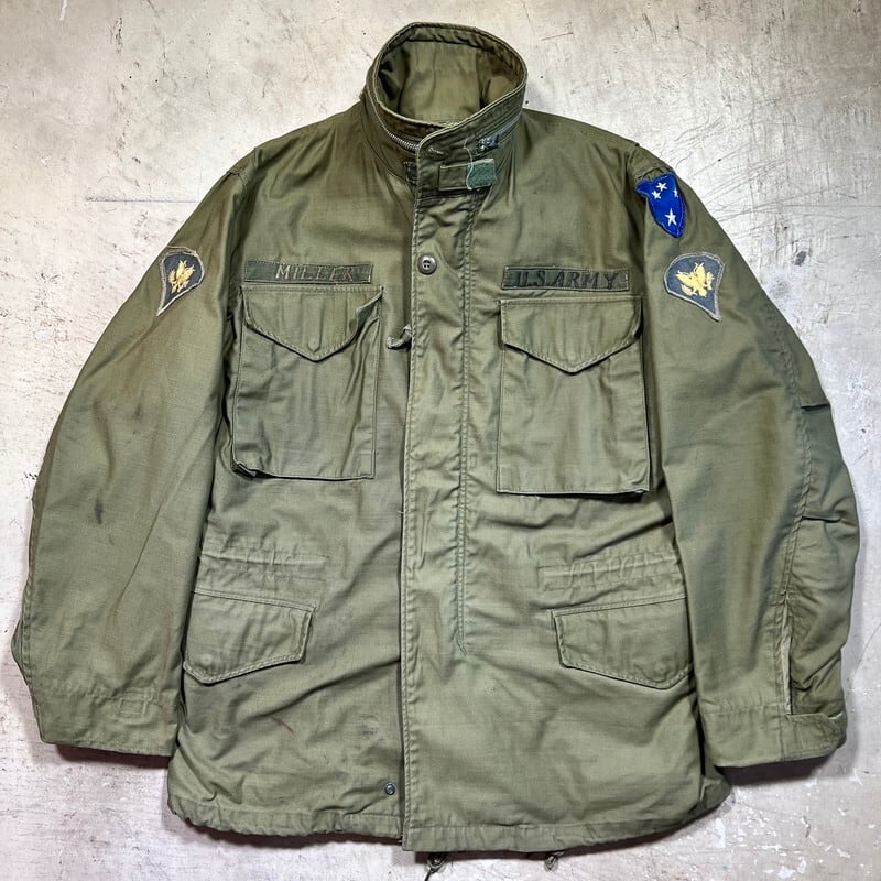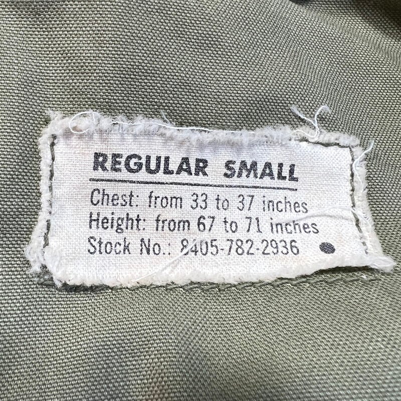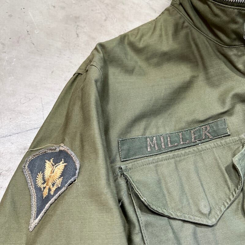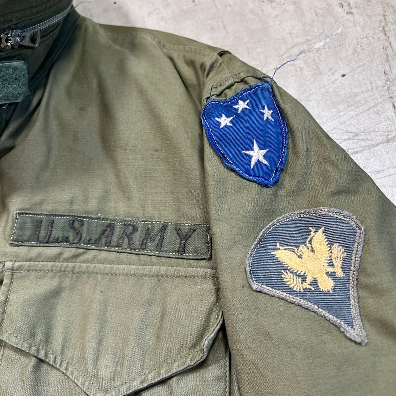 60年代のU.S.ARMY M-65フィールドジャケット1stモデルです。DSA100-1928、コントラクターは不明です。初期モデル特有のエポーレットが付かない仕様です。フロント、襟裏共にあCONMAR社のアルミジッパーが使用されています。両肩に米陸軍スペシャリスト E-4 ランク パッチと左腕には南十字星を模した第23歩兵師団のパッチが縫い付けられています。胸元にはネームパッチとU.S.ARMYパッチが付きます。袖や袖先,腹部に汚れがございます。ジッパー付け根にややほころびが見らえますが、まだ芯は裂けていませんので、開閉もスムーズです。気になるダメージは無く生地のコンディションは良好だと思います。タグのステッチが一部解けています。需要の高いREGULAR SMALLサイズです。ここ数年でM-65の1stモデルは人気も高まり以前に比べると見かけにくくなったように思います。エポーレット無しのこの1stモデルはお探しの方も多いと思いますので、この機会にいかがでしょうか。